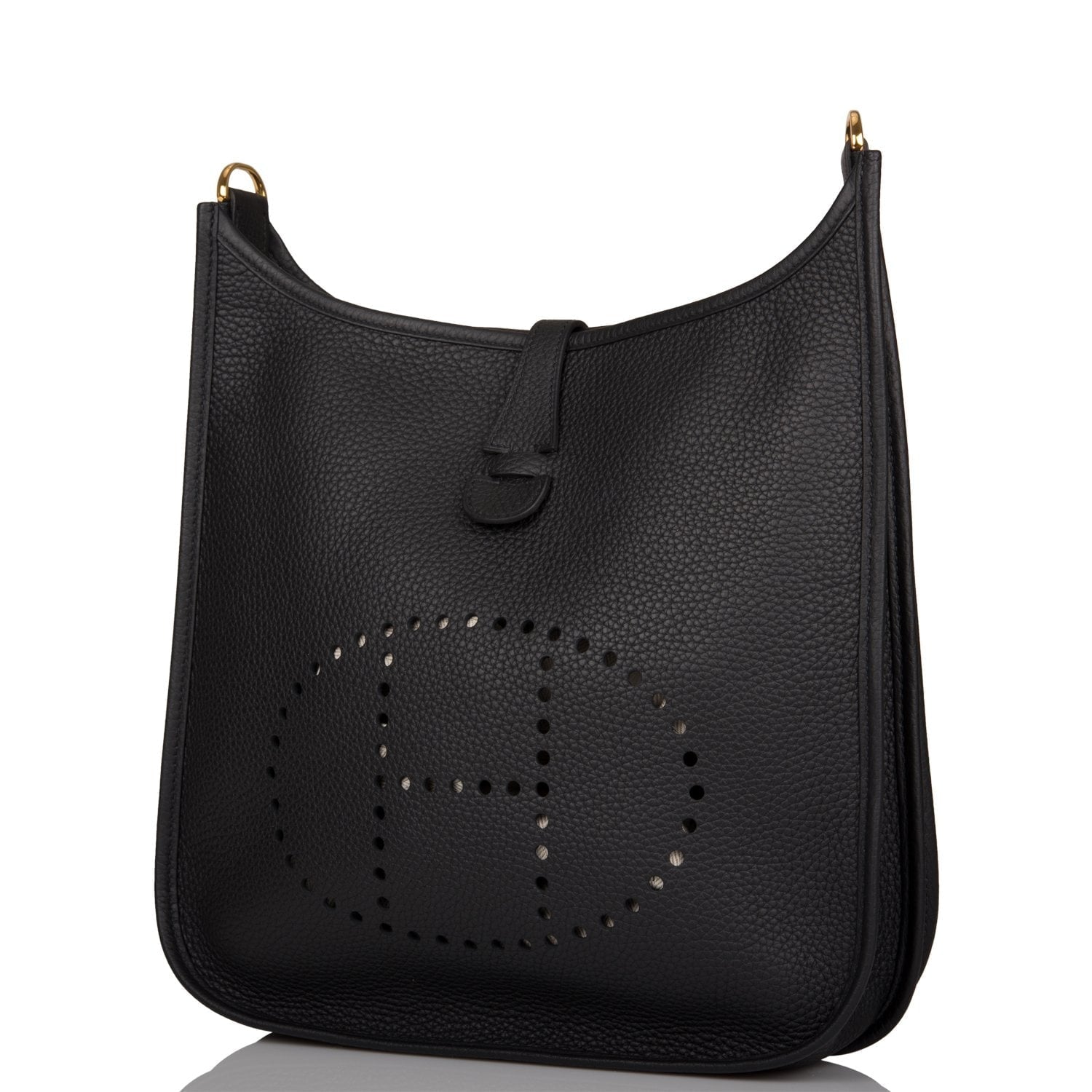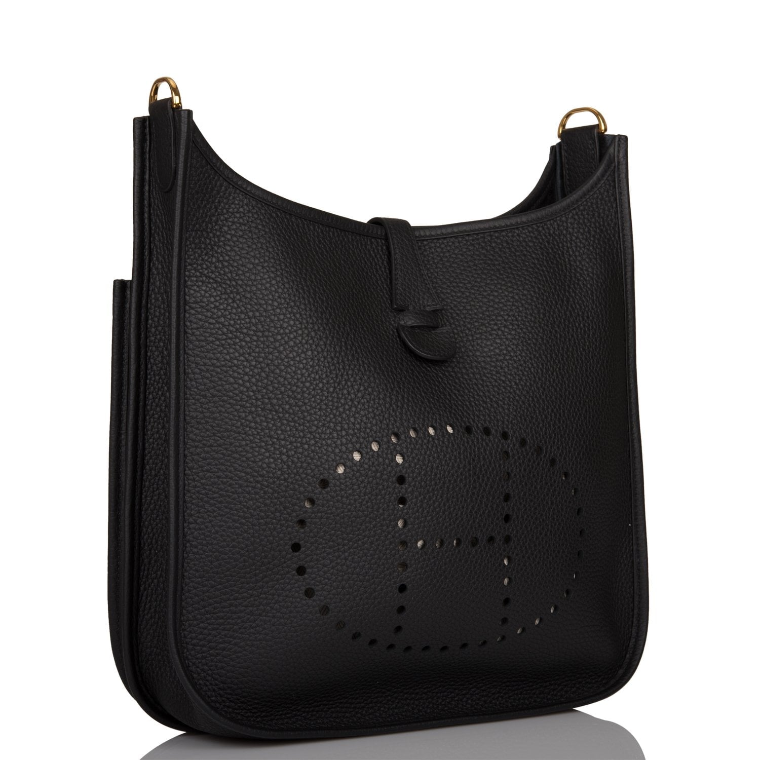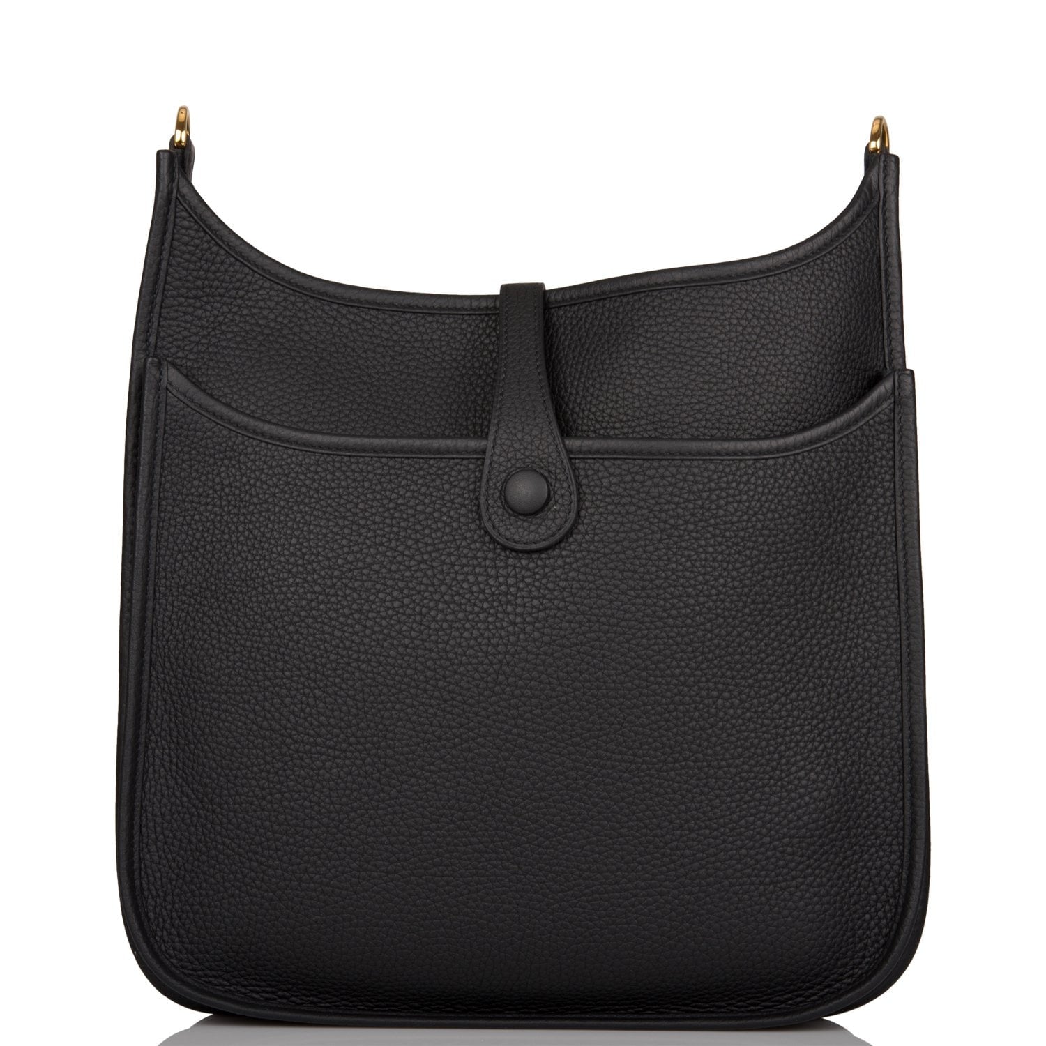 This Evelyne is in black clemence leather with gold hardware and has tonal stitching, pull tab top closure and black removable canvas and leather shoulder/crossbody strap.