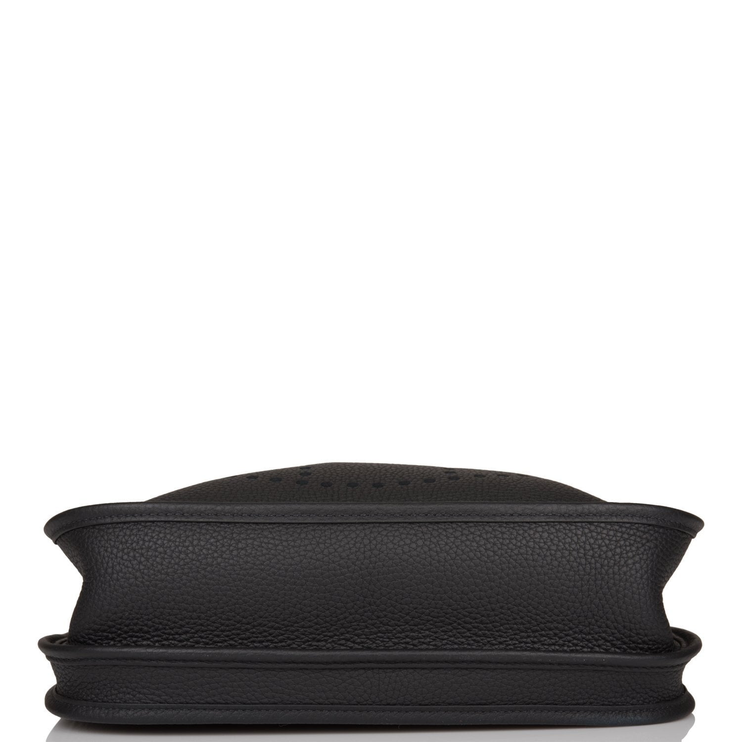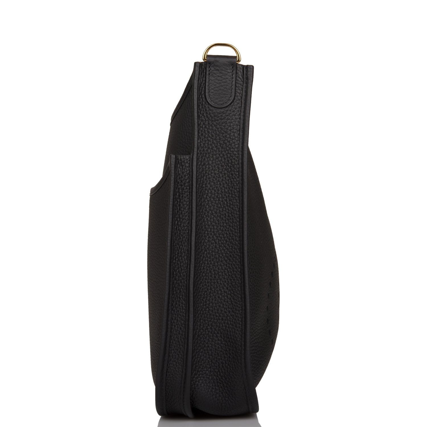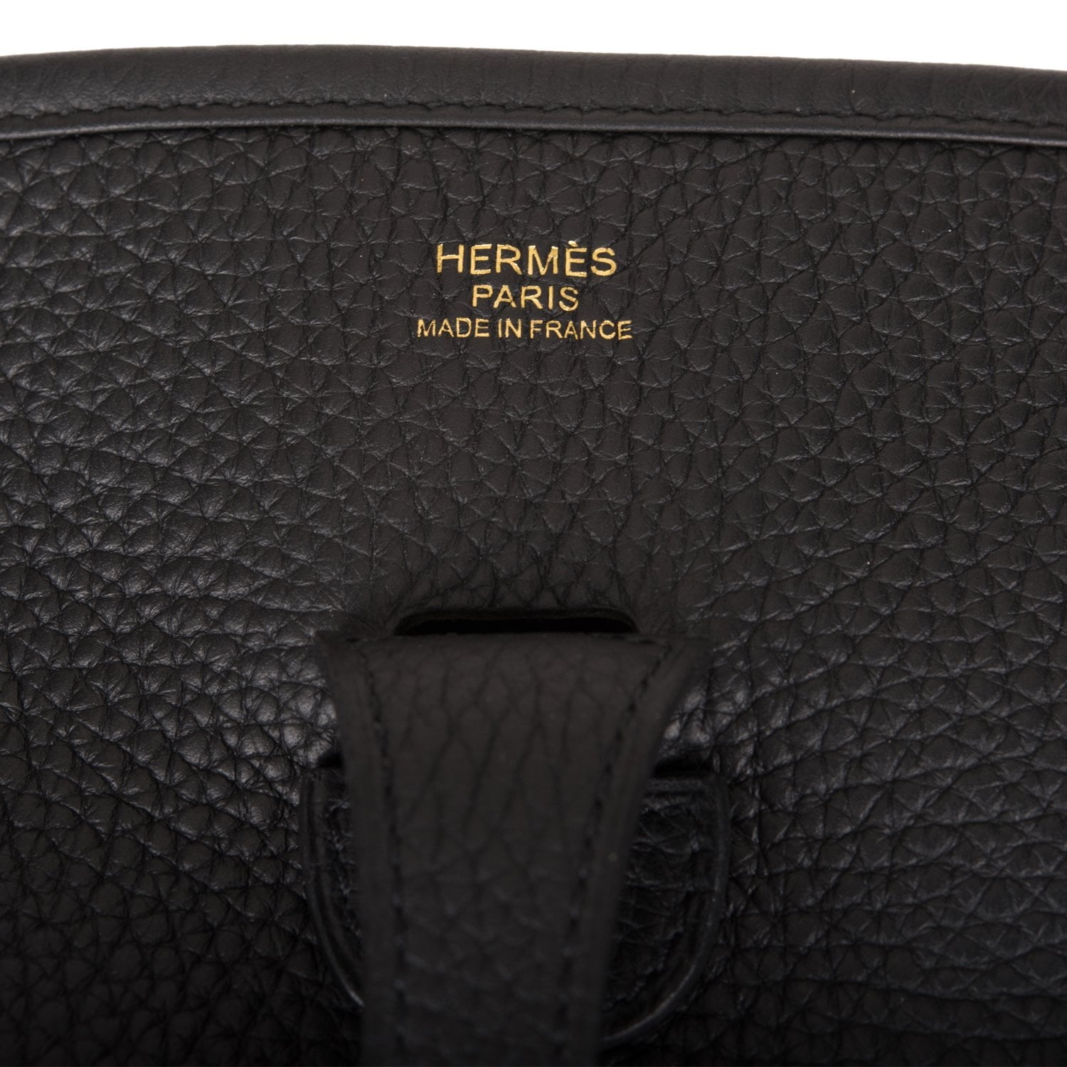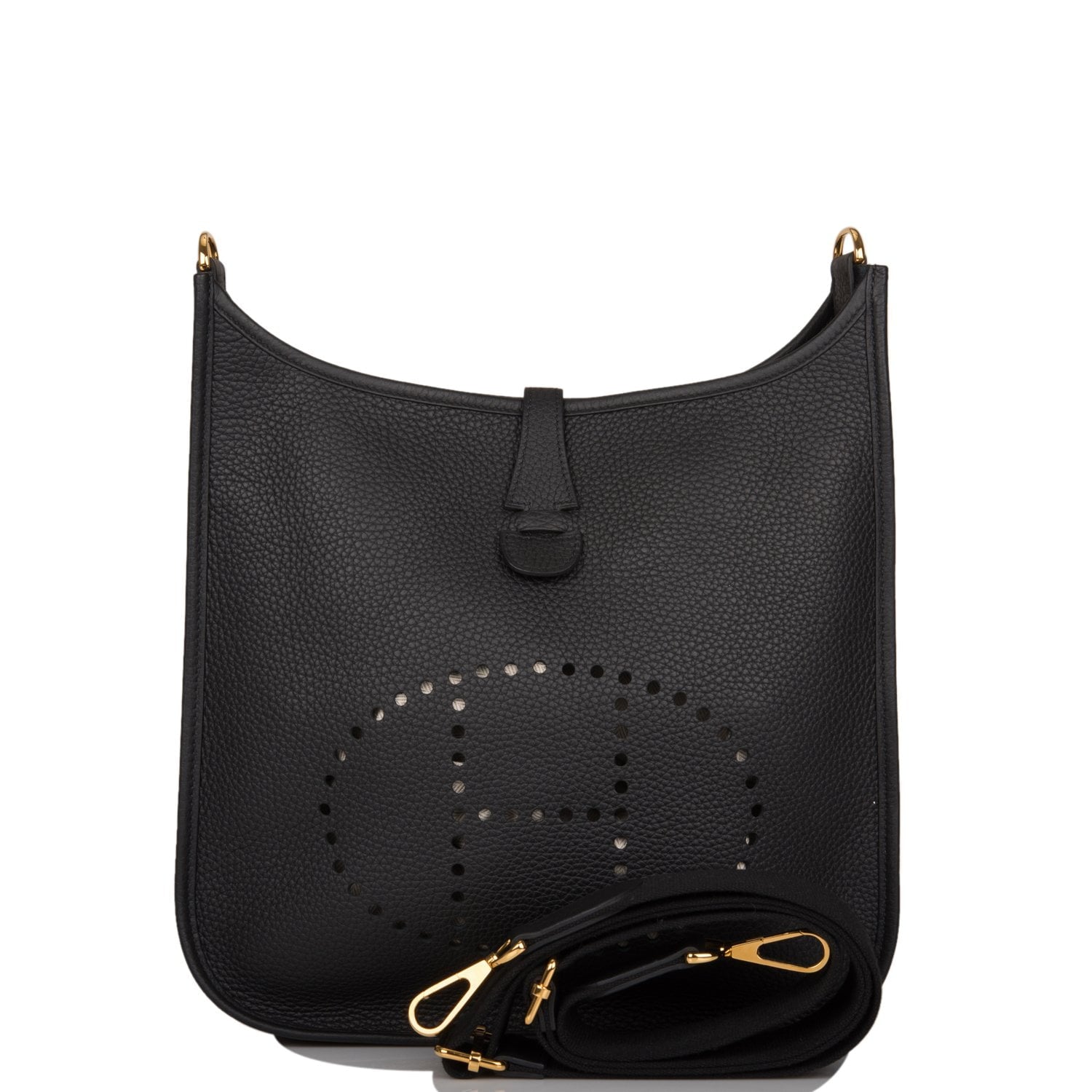 This Evelyne is in black clemence leather with gold hardware and has tonal stitching, pull tab top closure and black removable canvas and leather shoulder/crossbody strap.