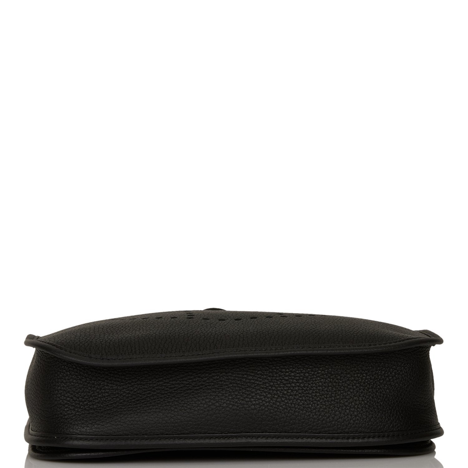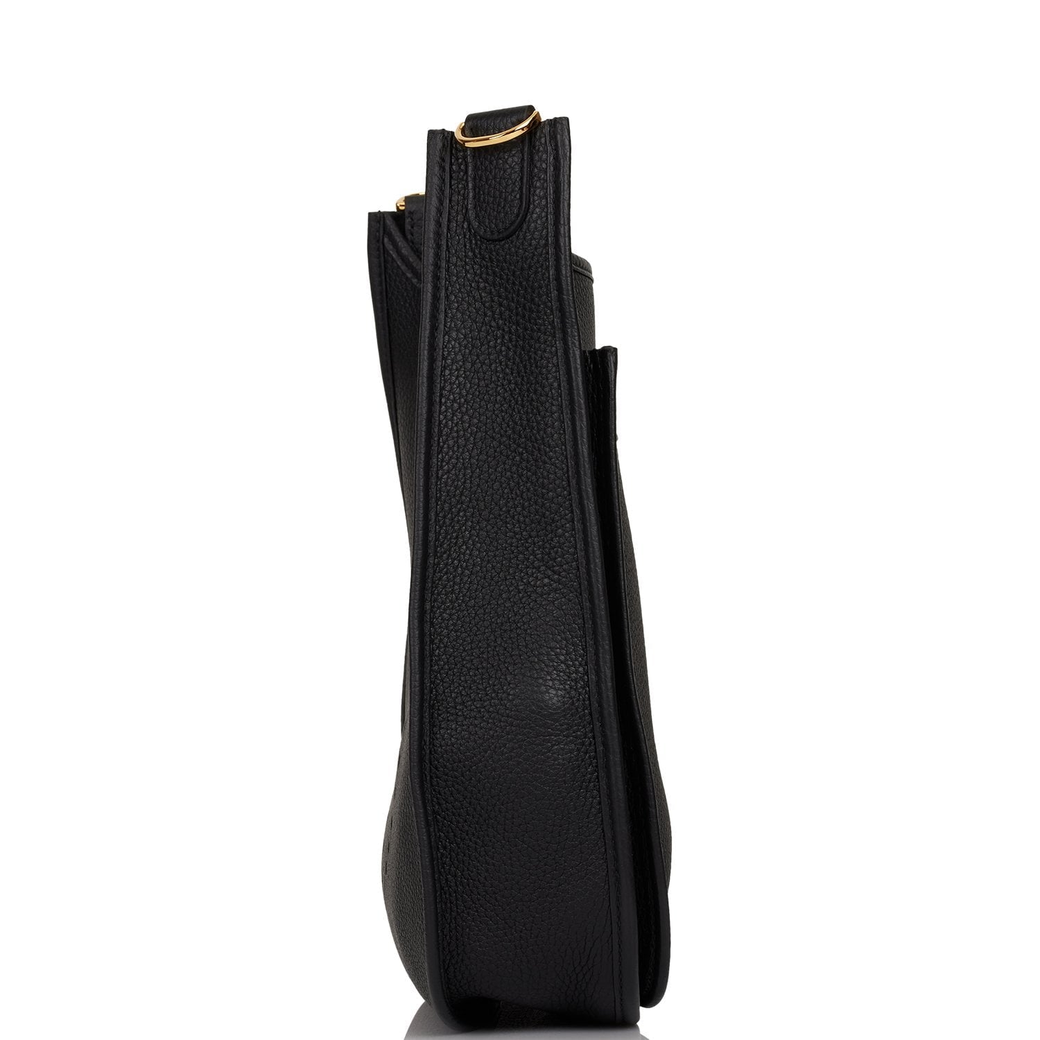 This Evelyne is in Black clemence leather with gold hardware and has tonal stitching, pull tab top closure and Black removable canvas and leather shoulder/crossbody strap.