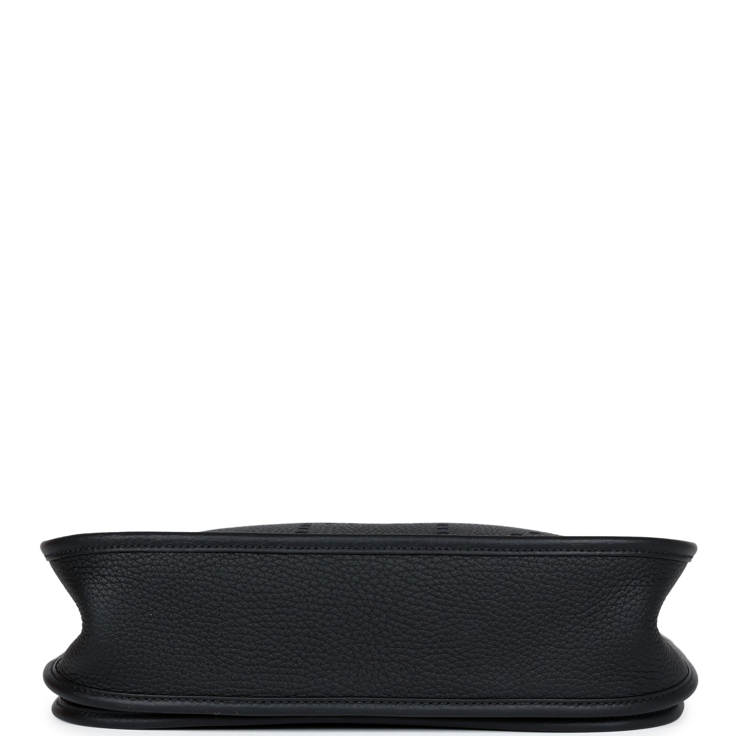 This Evelyne is in Black clemence leather with gold hardware and has tonal stitching, pull tab top closure and Black removable canvas and leather shoulder/crossbody strap.