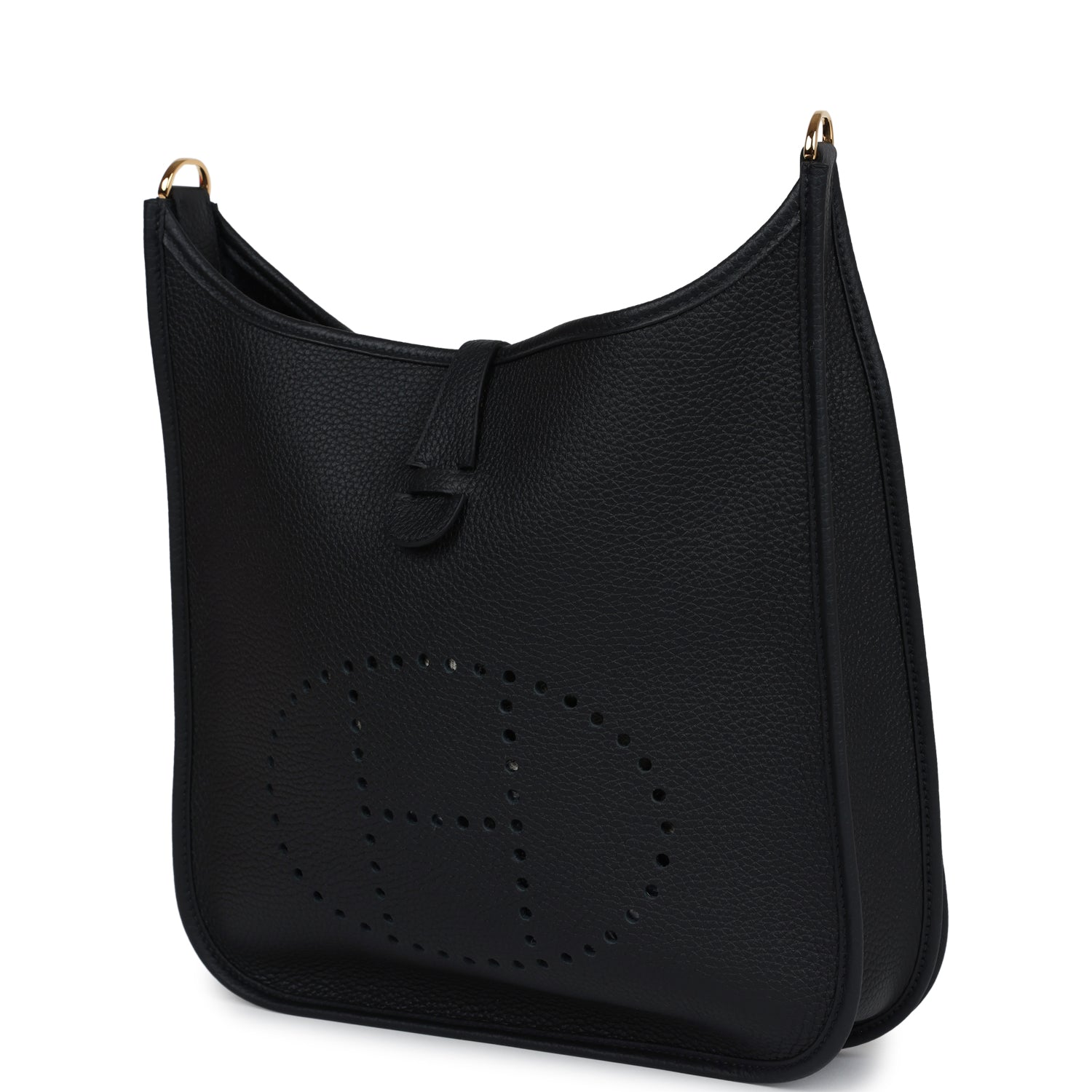 This Evelyne is in Black clemence leather with gold hardware and has tonal stitching, pull tab top closure and Black removable canvas and leather shoulder/crossbody strap.