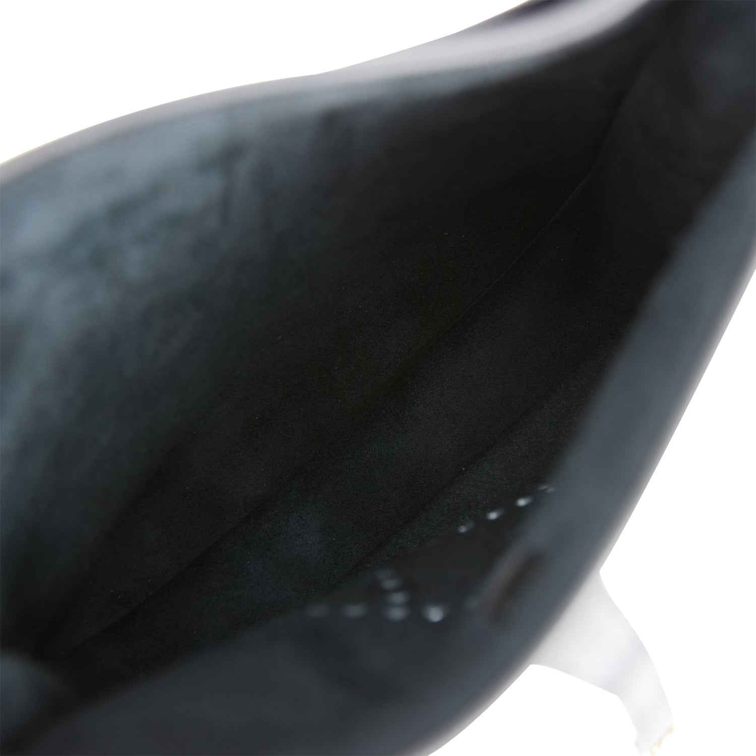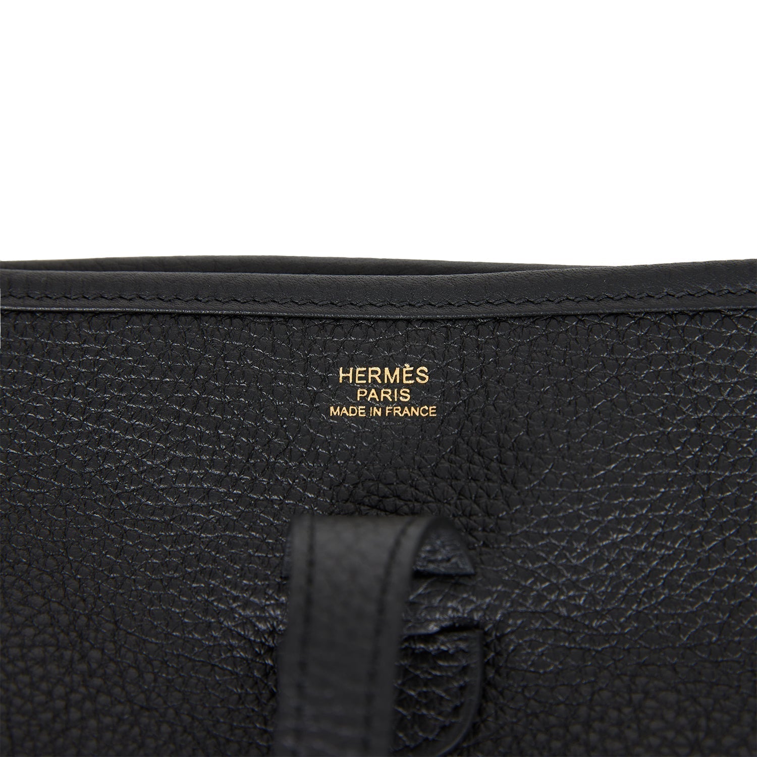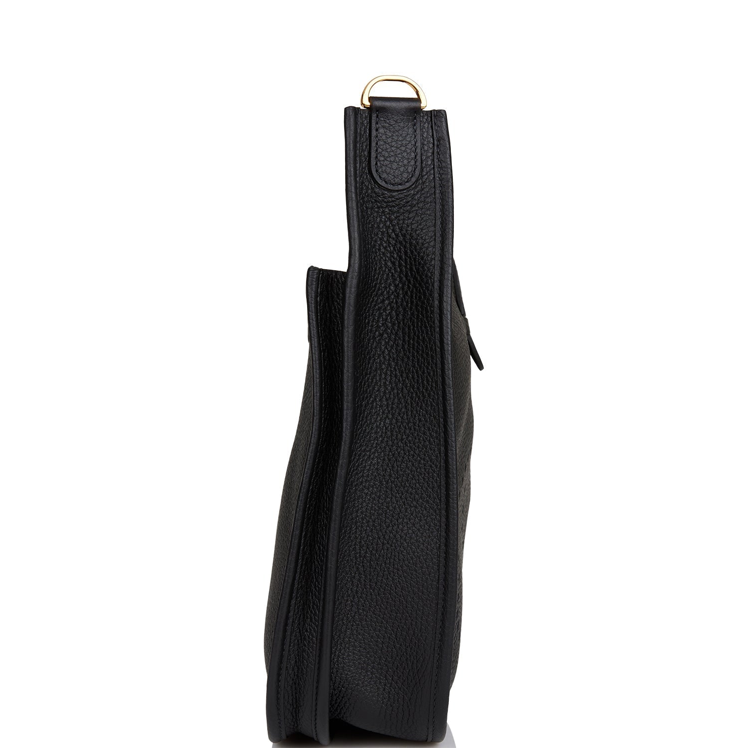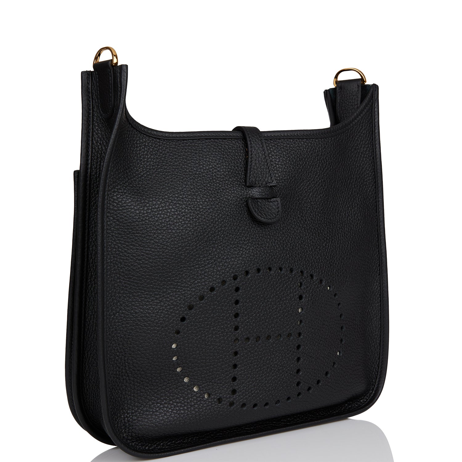 This Evelyne is in Black clemence leather with gold hardware and has tonal stitching, pull tab top closure and Black removable canvas and leather shoulder/crossbody strap.