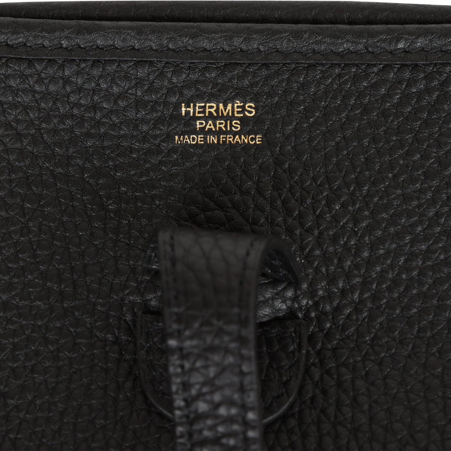 This Evelyne is in Black clemence leather with gold hardware and has tonal stitching, pull tab top closure and black removable canvas and leather shoulder/crossbody strap.