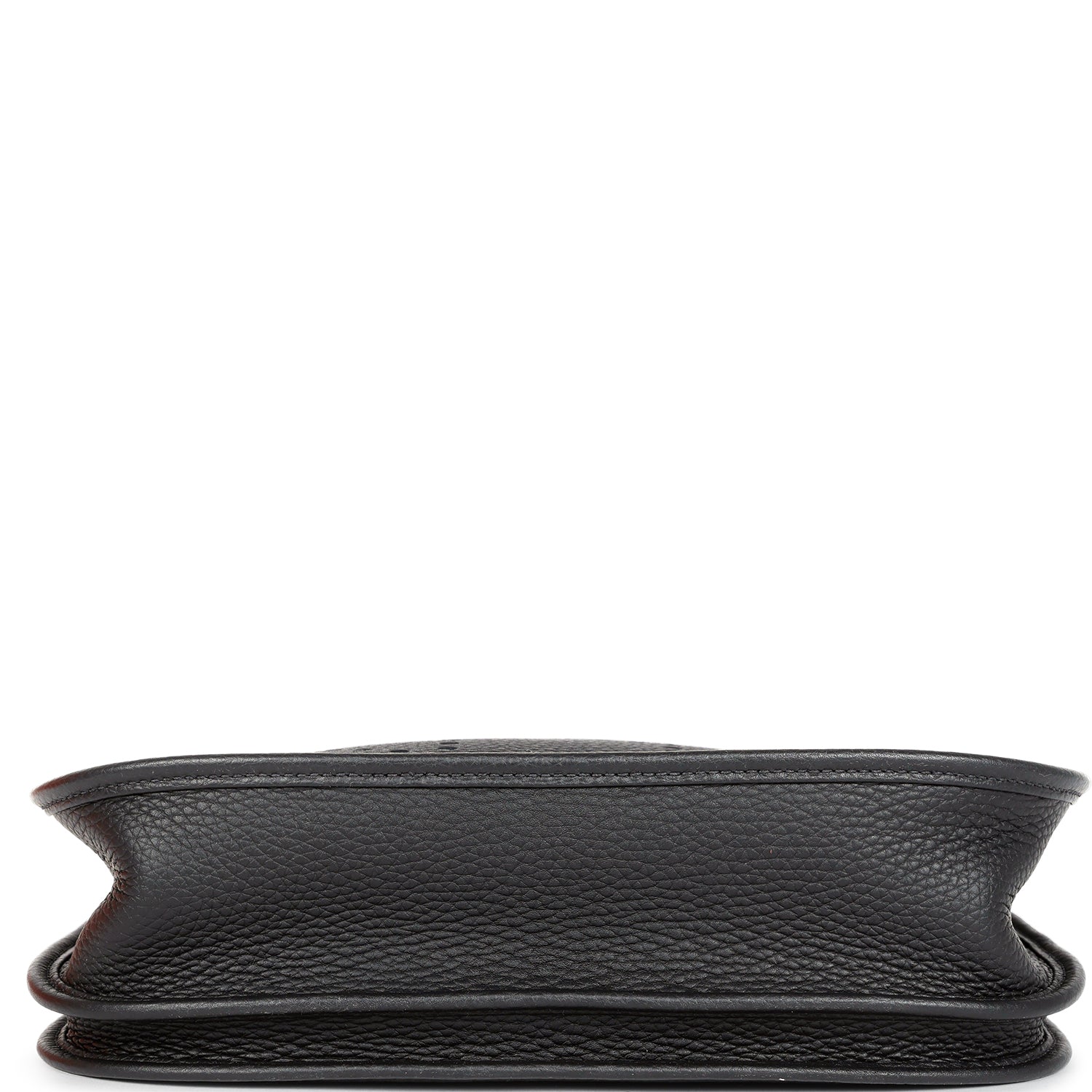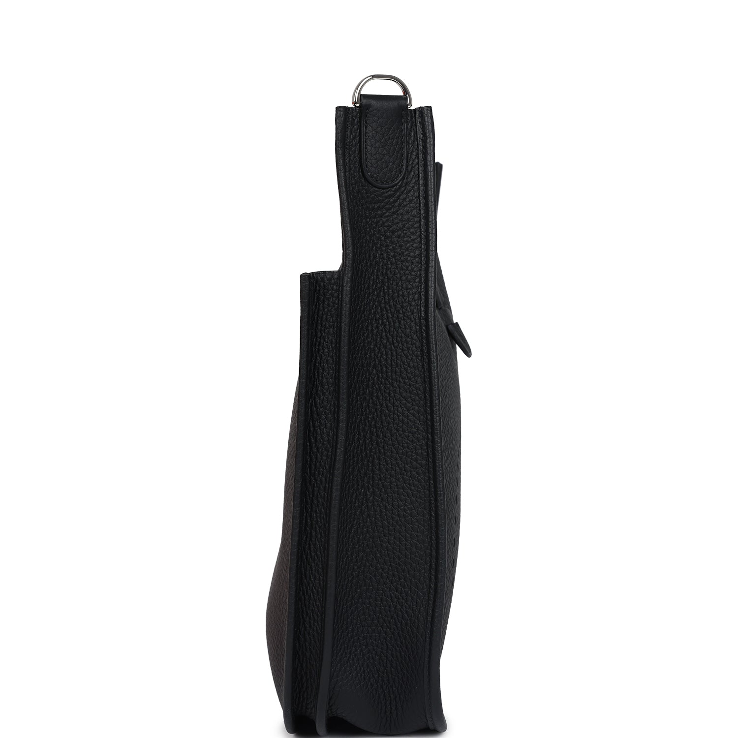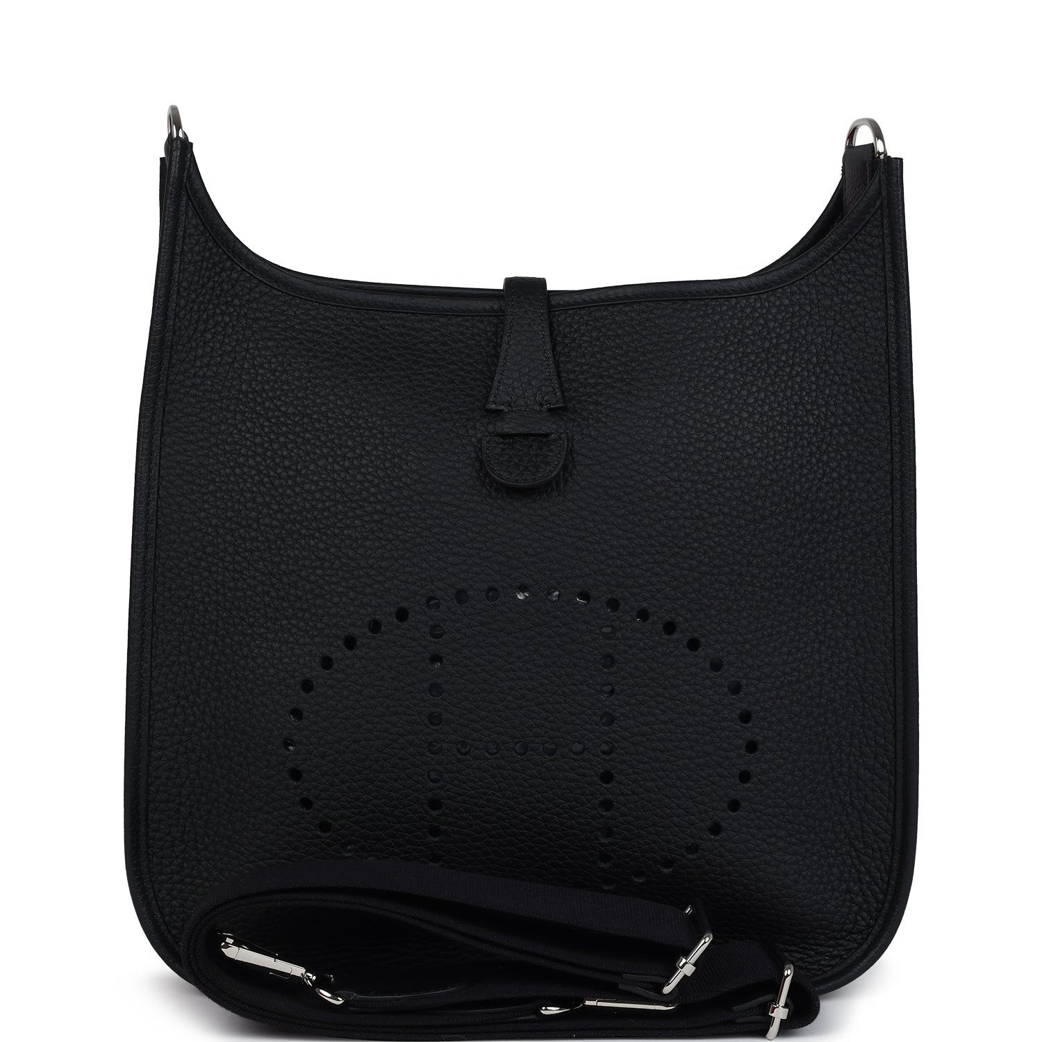 This Evelyne is in Black clemence leather with palladium hardware and has tonal stitching, pull tab top closure and Black removable canvas and leather shoulder/crossbody strap.