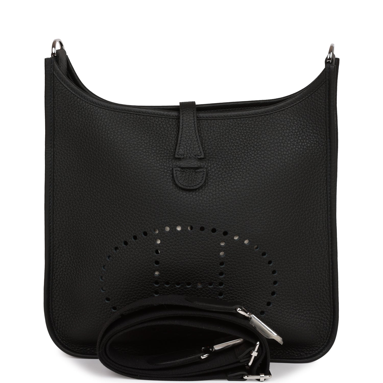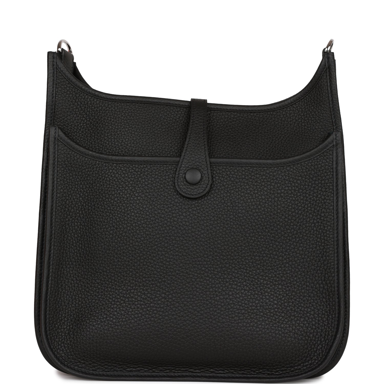 This Evelyne is in Black clemence leather with palladium hardware and has tonal stitching, pull tab top closure and Black removable canvas and leather shoulder/crossbody strap.