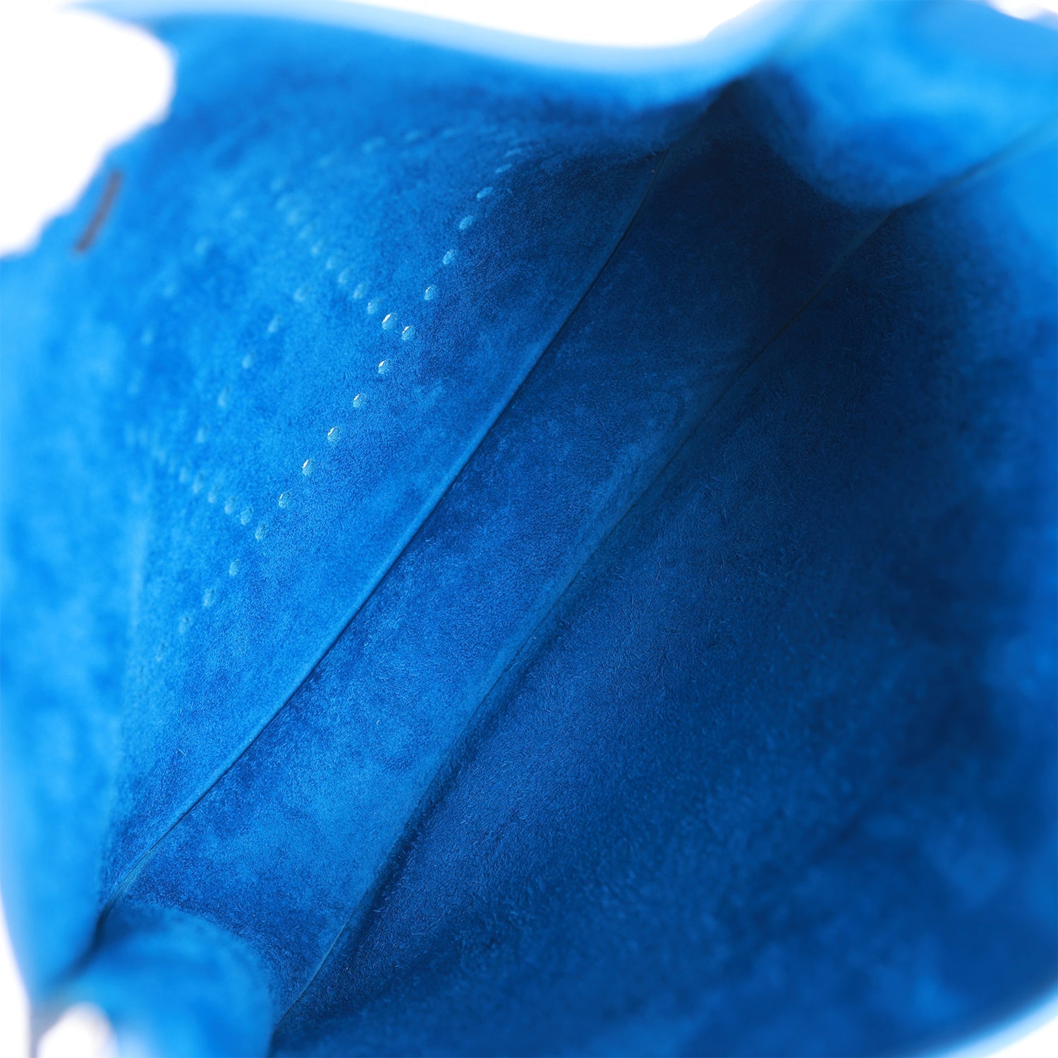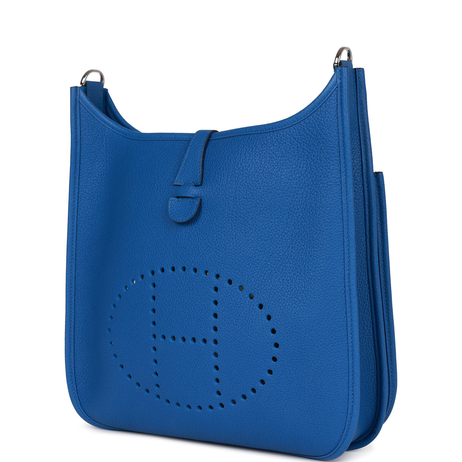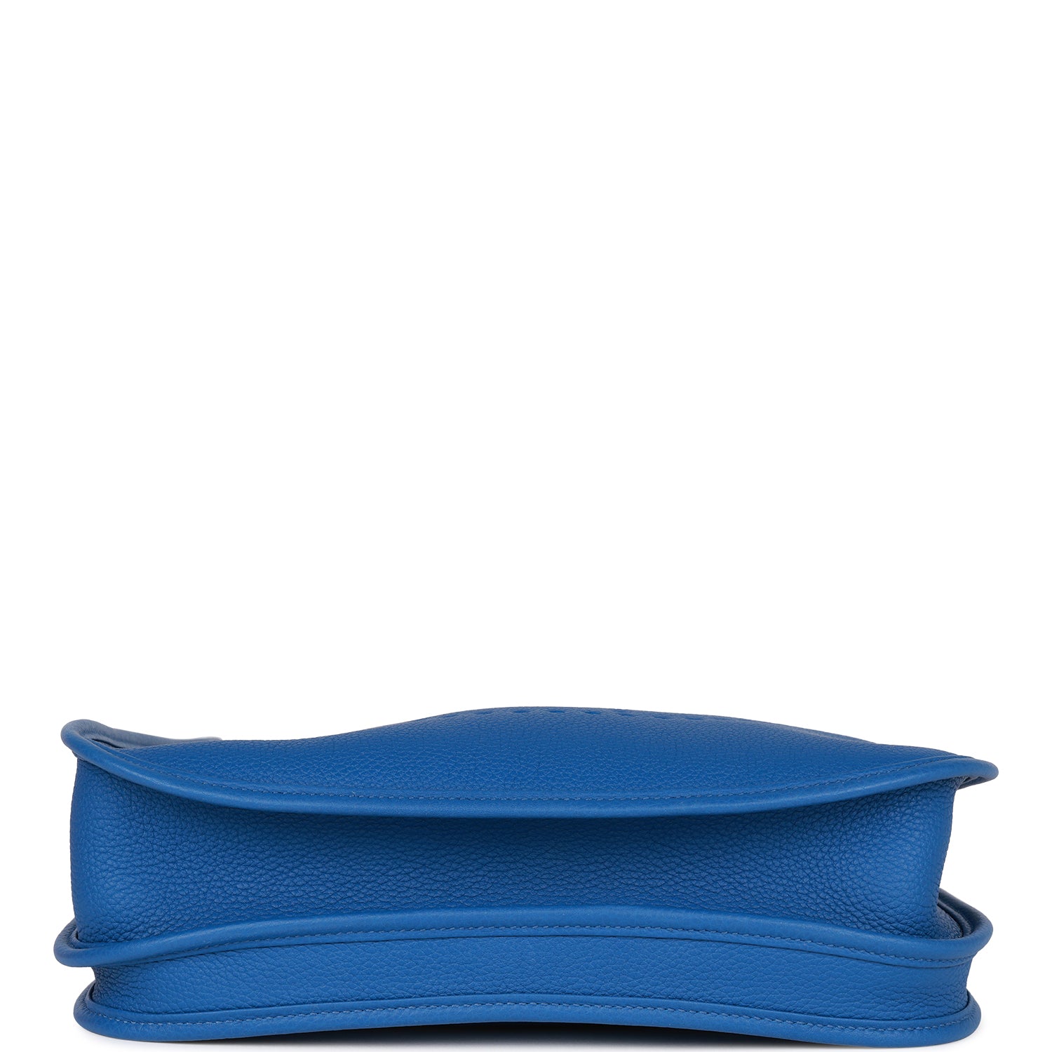 This Evelyne is in Bleu France clemence leather with palladium hardware and has tonal stitching, pull tab top closure and Bleu France removable canvas and leather shoulder/crossbody strap.