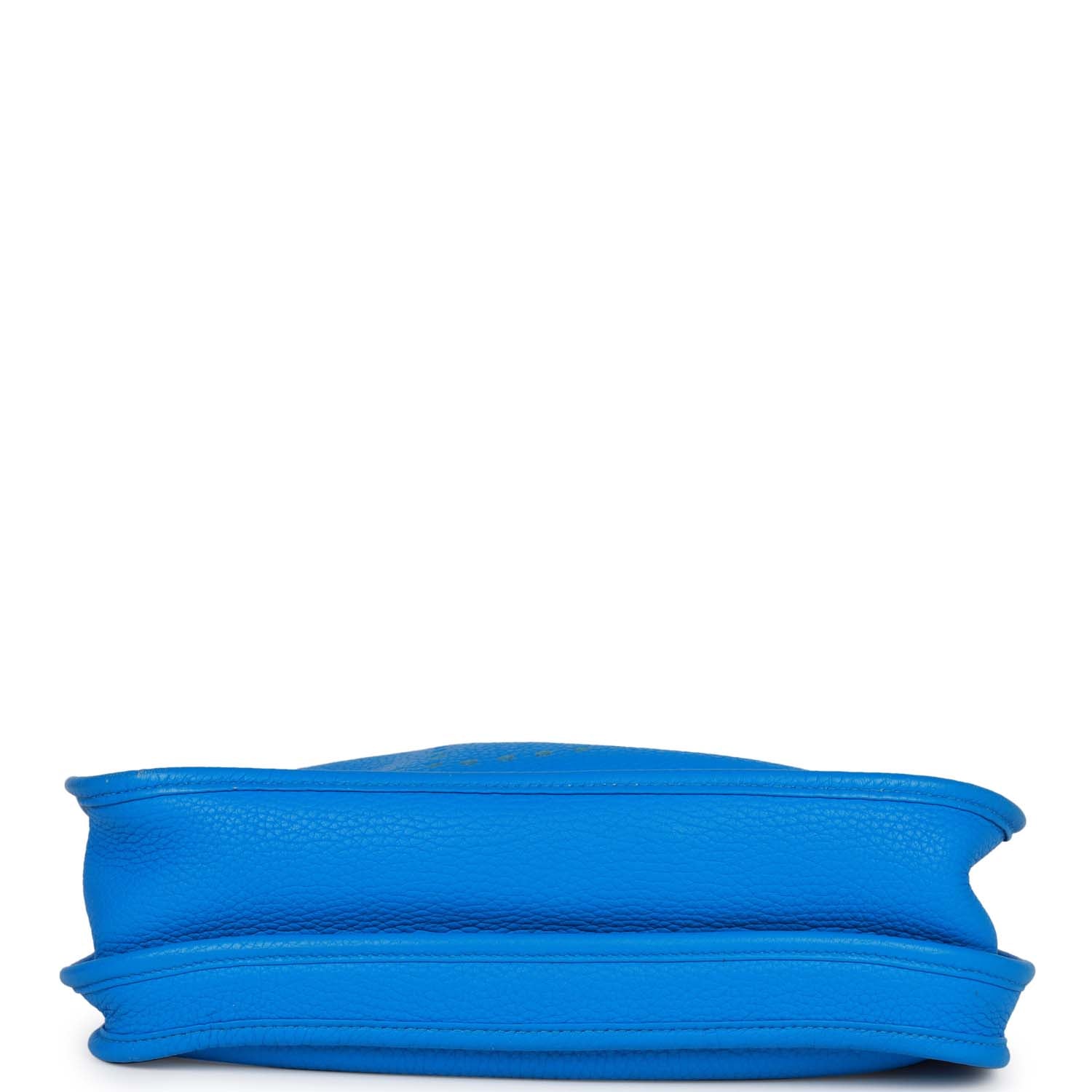 This Evelyne III PM messenger bag is in Bleu Hydra in clemence leather with tonal stitching, palladium hardware, large perforated H in circle (front), pull tab top snap closure and removable Bleu Hydra shoulder/crossbody strap.