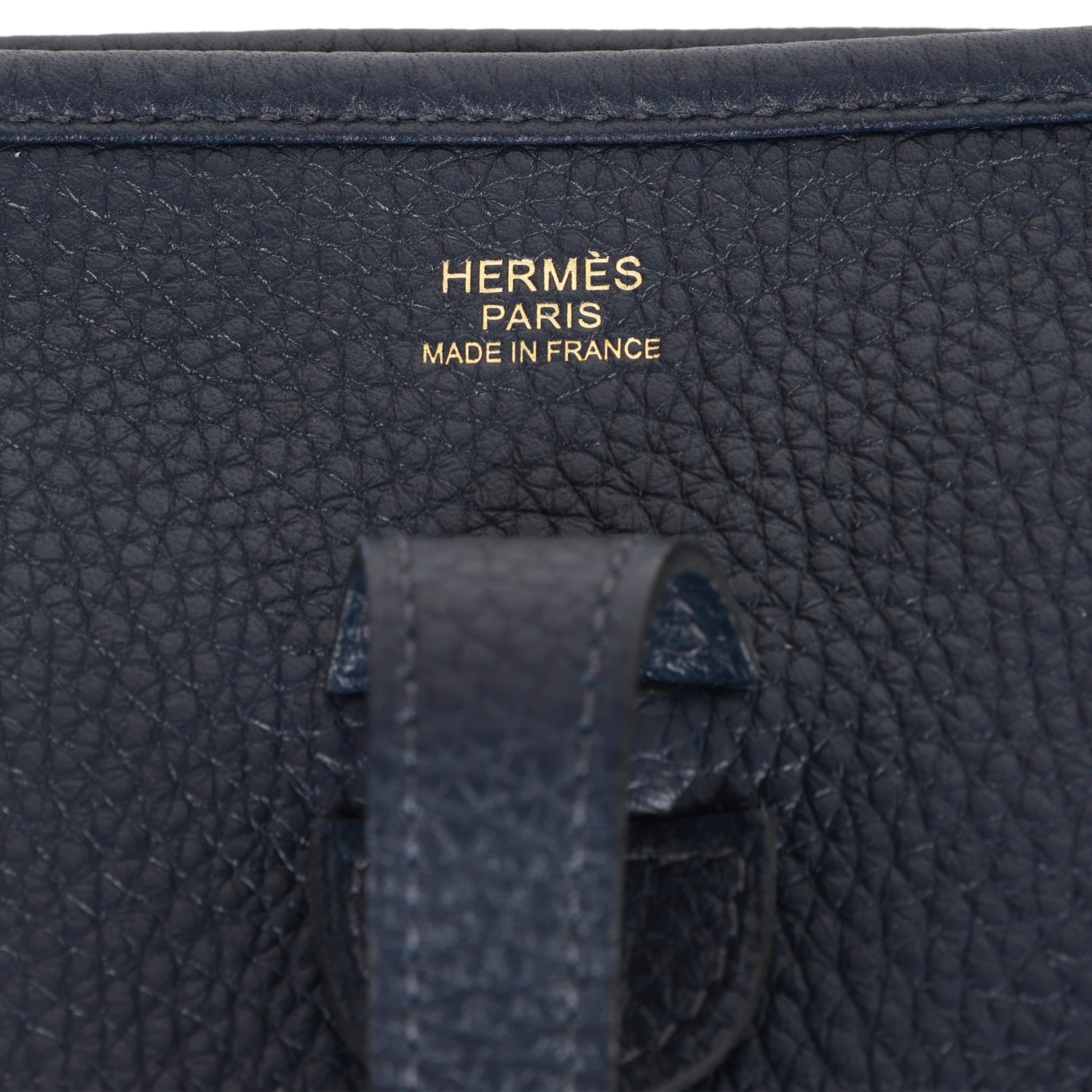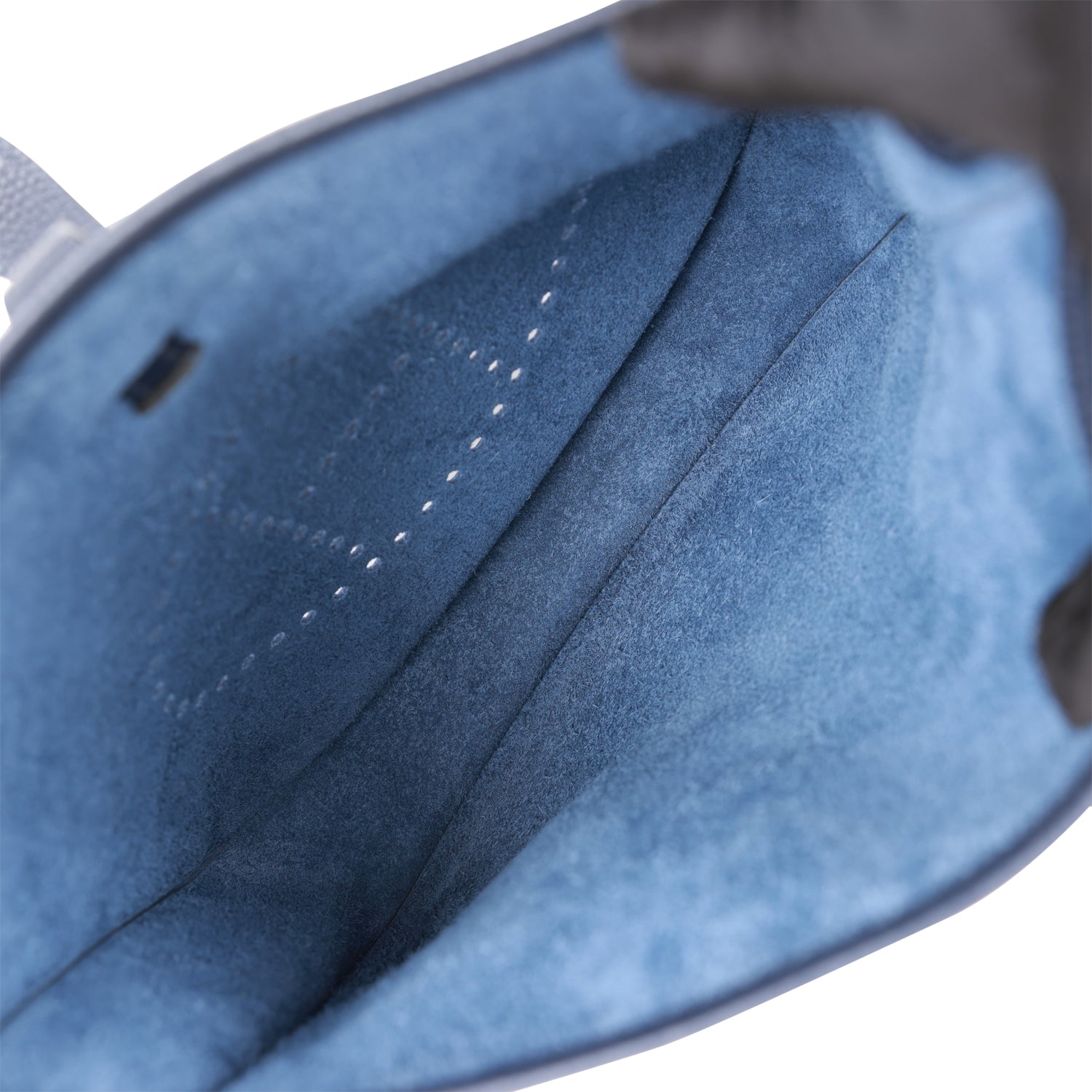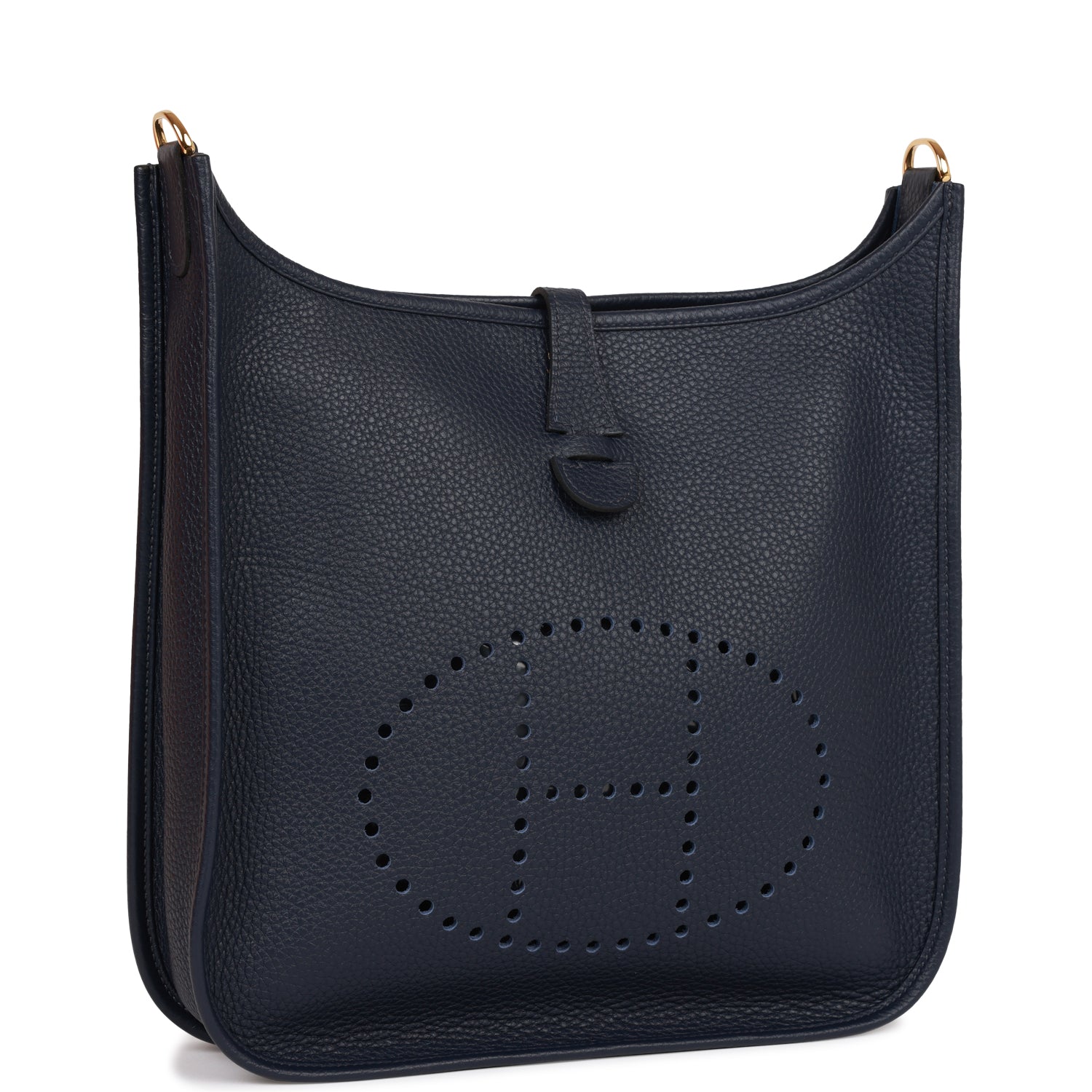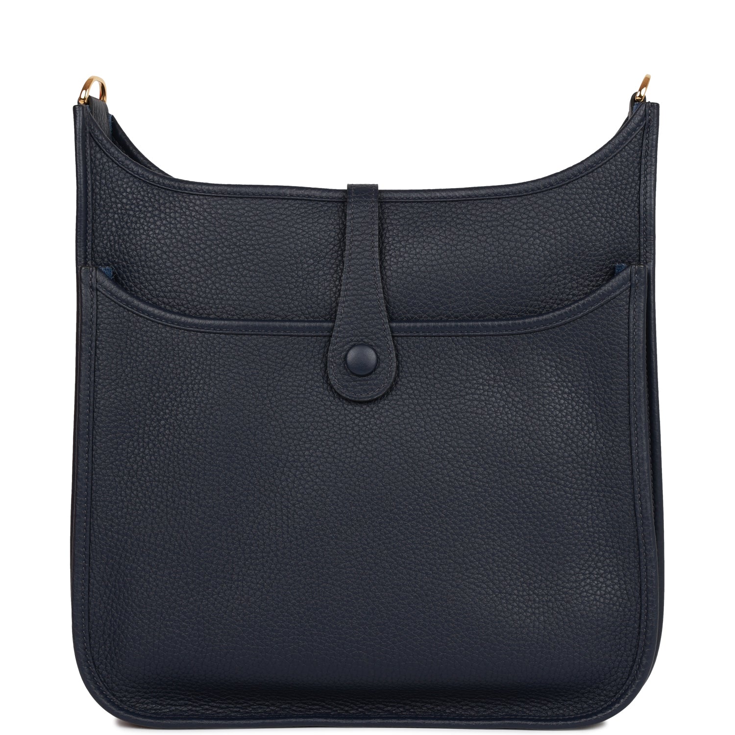 This Evelyne is in Bleu Nuit clemence leather with gold hardware and has tonal stitching, pull tab top closure and a Quadrille removable canvas and leather shoulder/crossbody strap.
