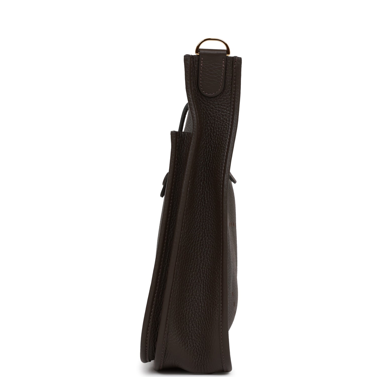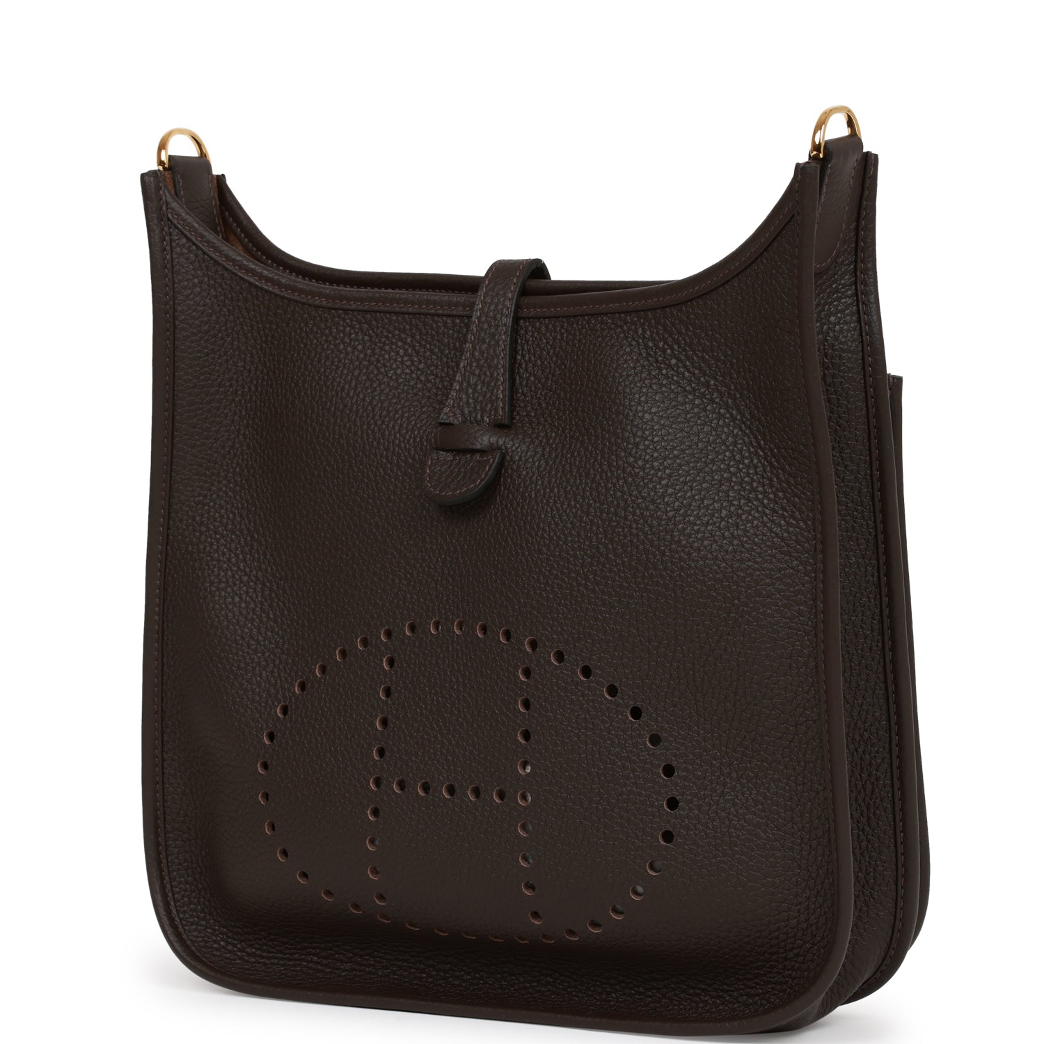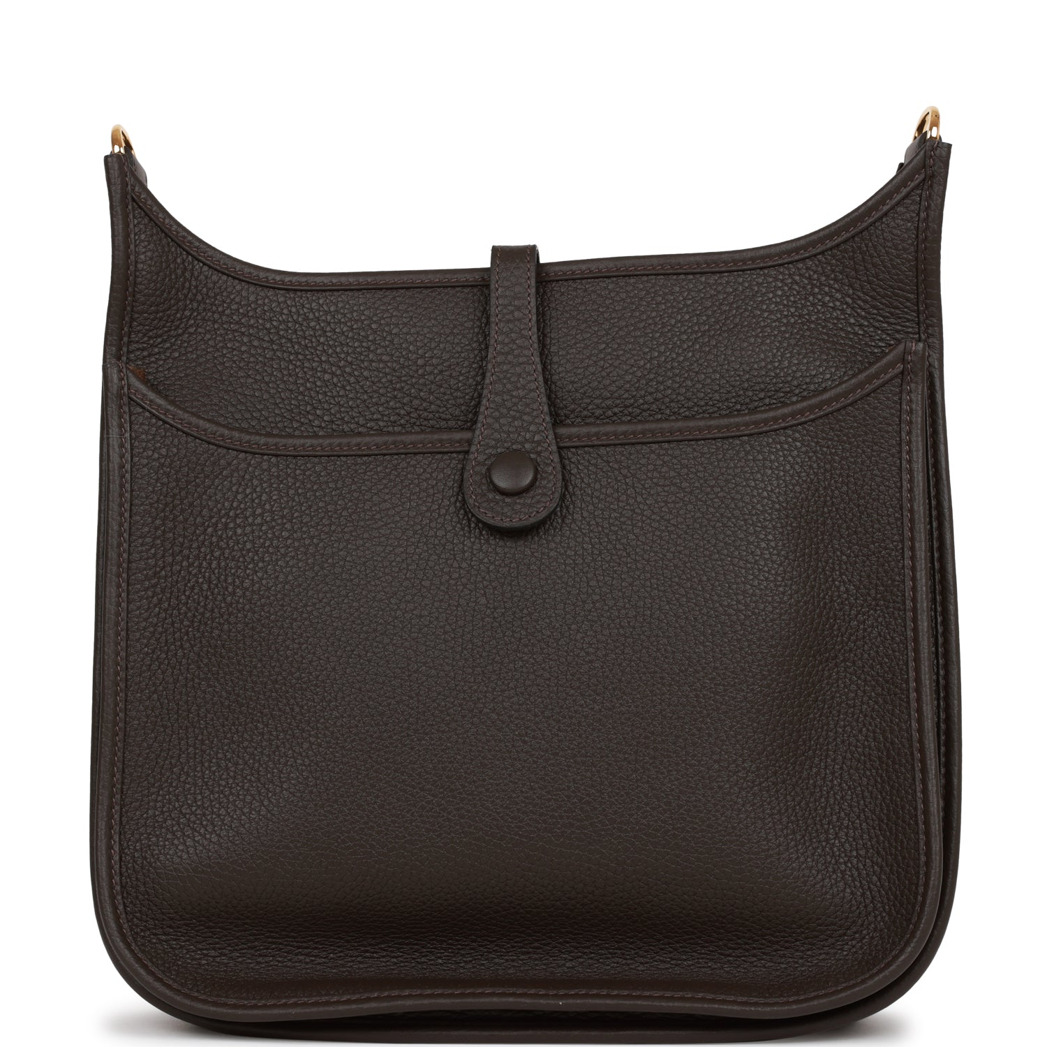 This Evelyne is in Ebene clemence leather with gold hardware and has tonal stitching, pull tab top closure and Ebene removable canvas and leather shoulder/crossbody strap.