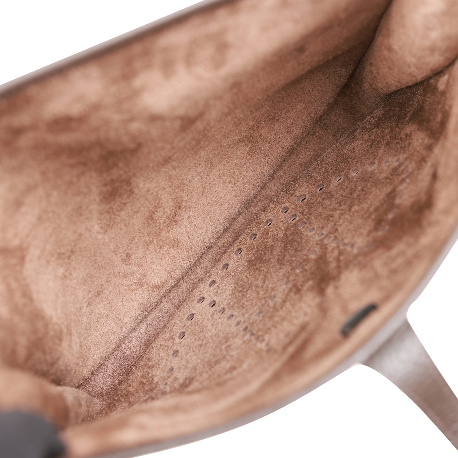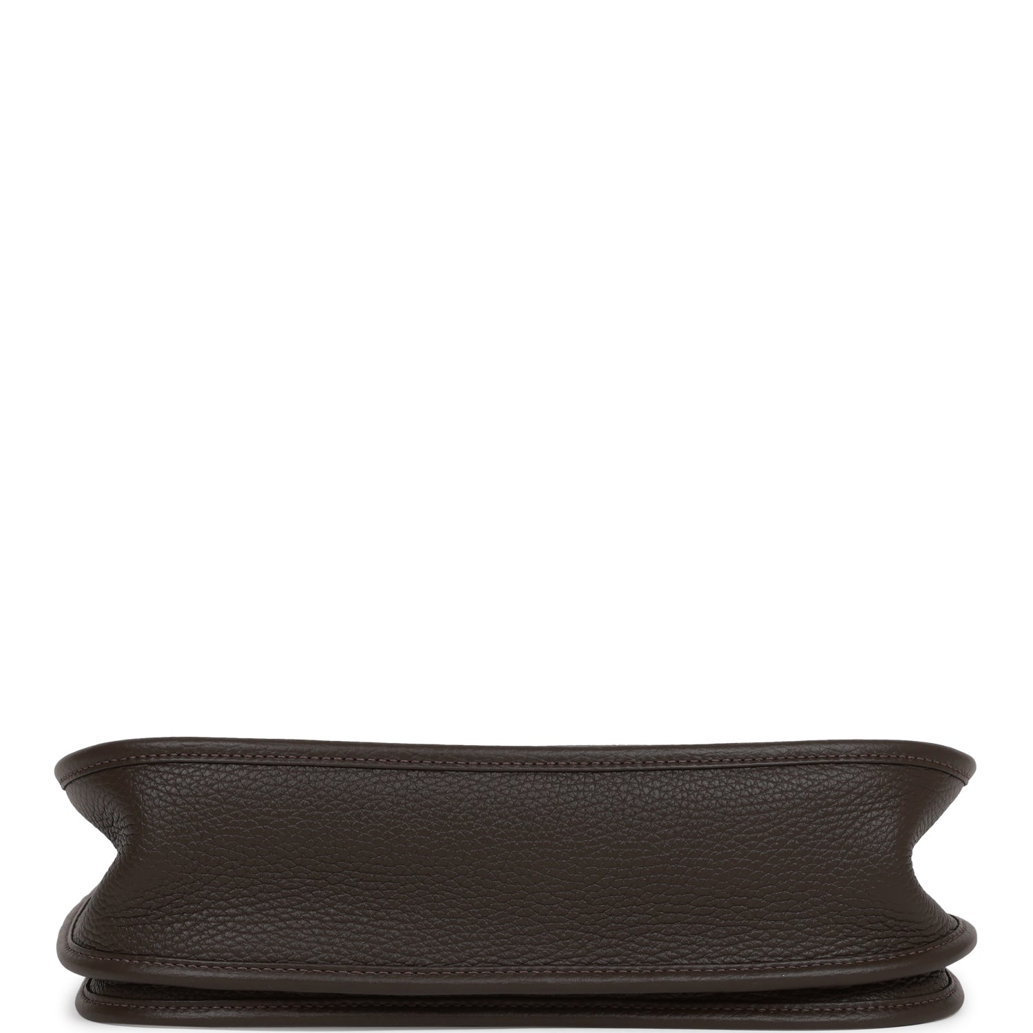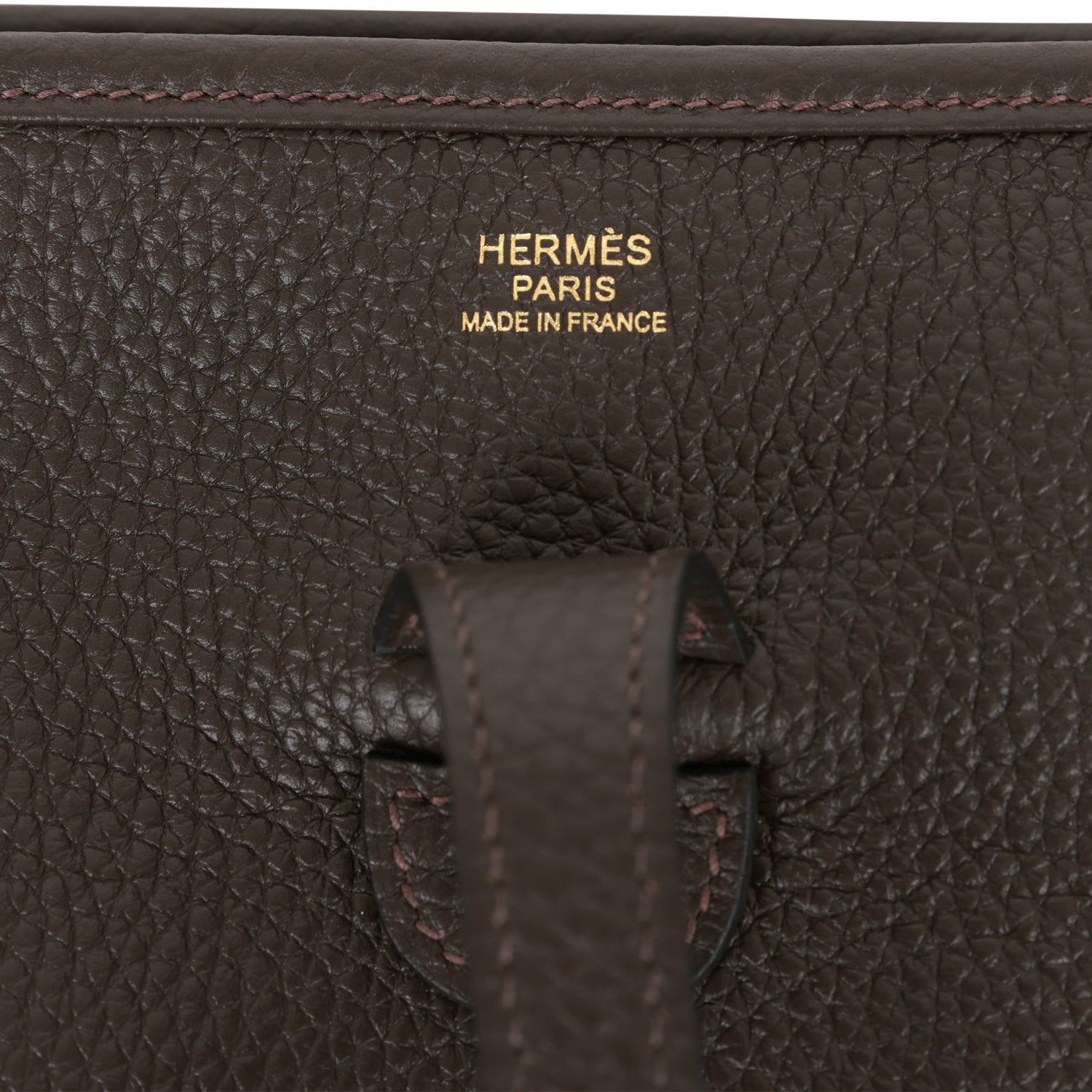 This Evelyne is in Ebene clemence leather with gold hardware and has tonal stitching, pull tab top closure and Ebene removable canvas and leather shoulder/crossbody strap.