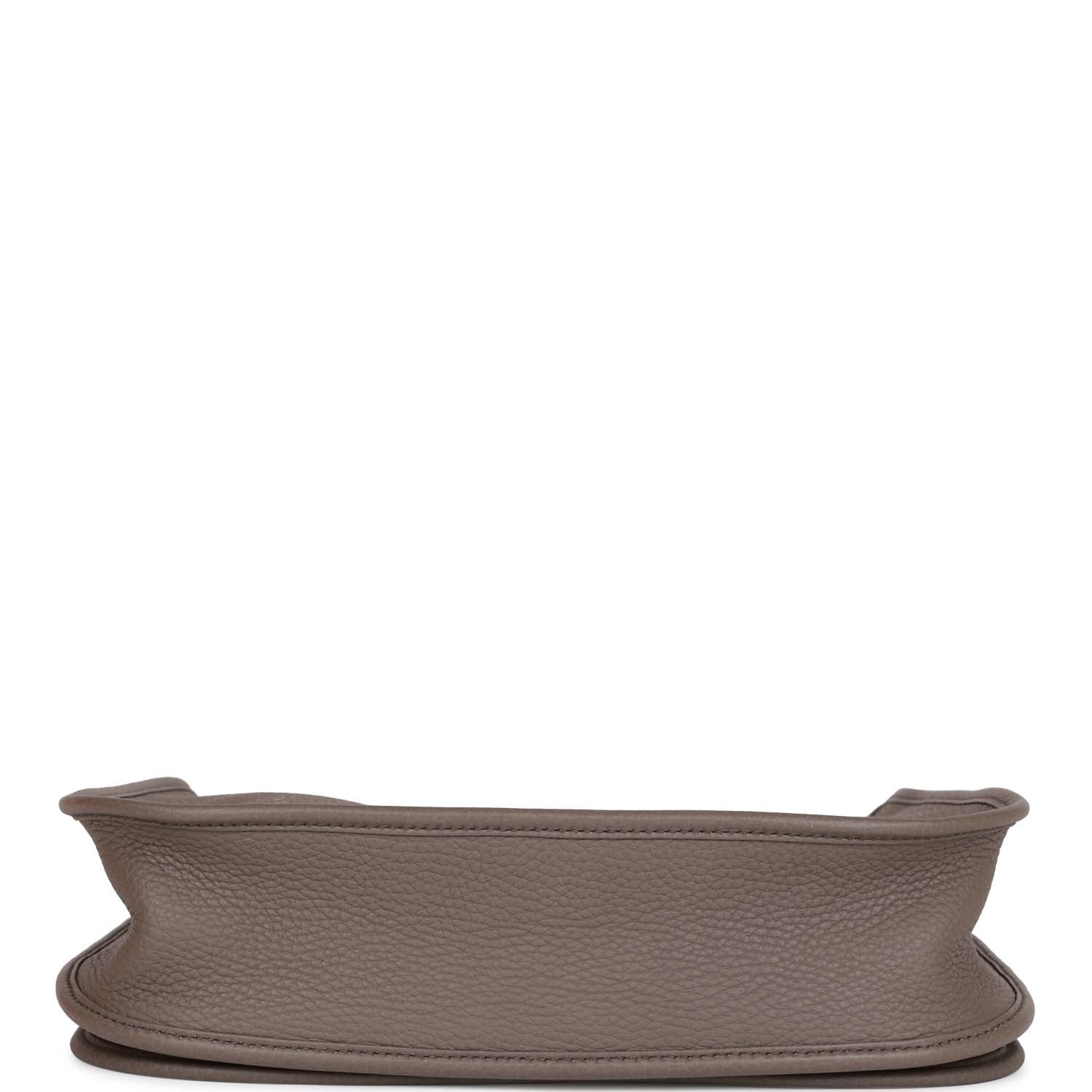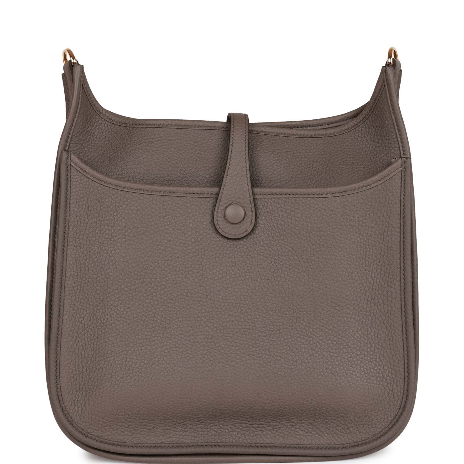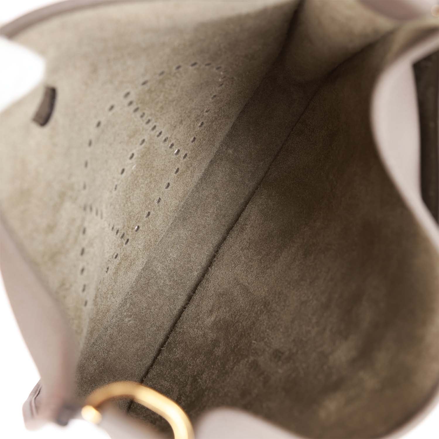 This Evelyne is in Etain clemence leather with gold hardware and has tonal stitching, pull tab top closure and Etain removable canvas and leather shoulder/crossbody strap.