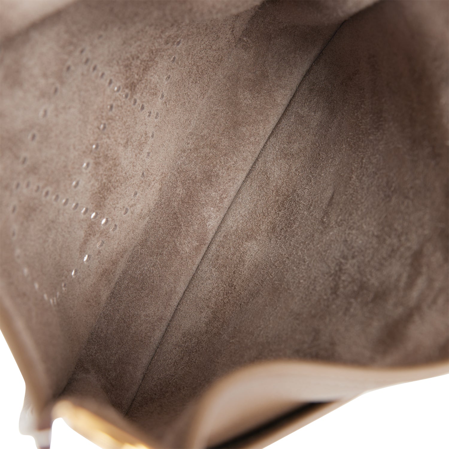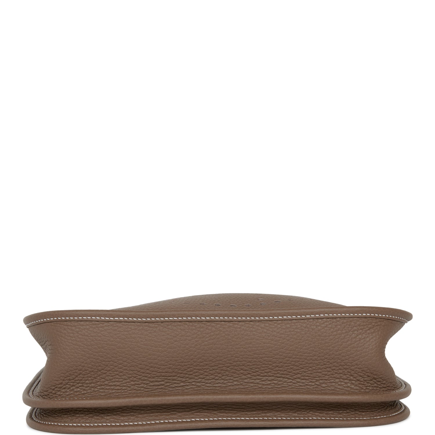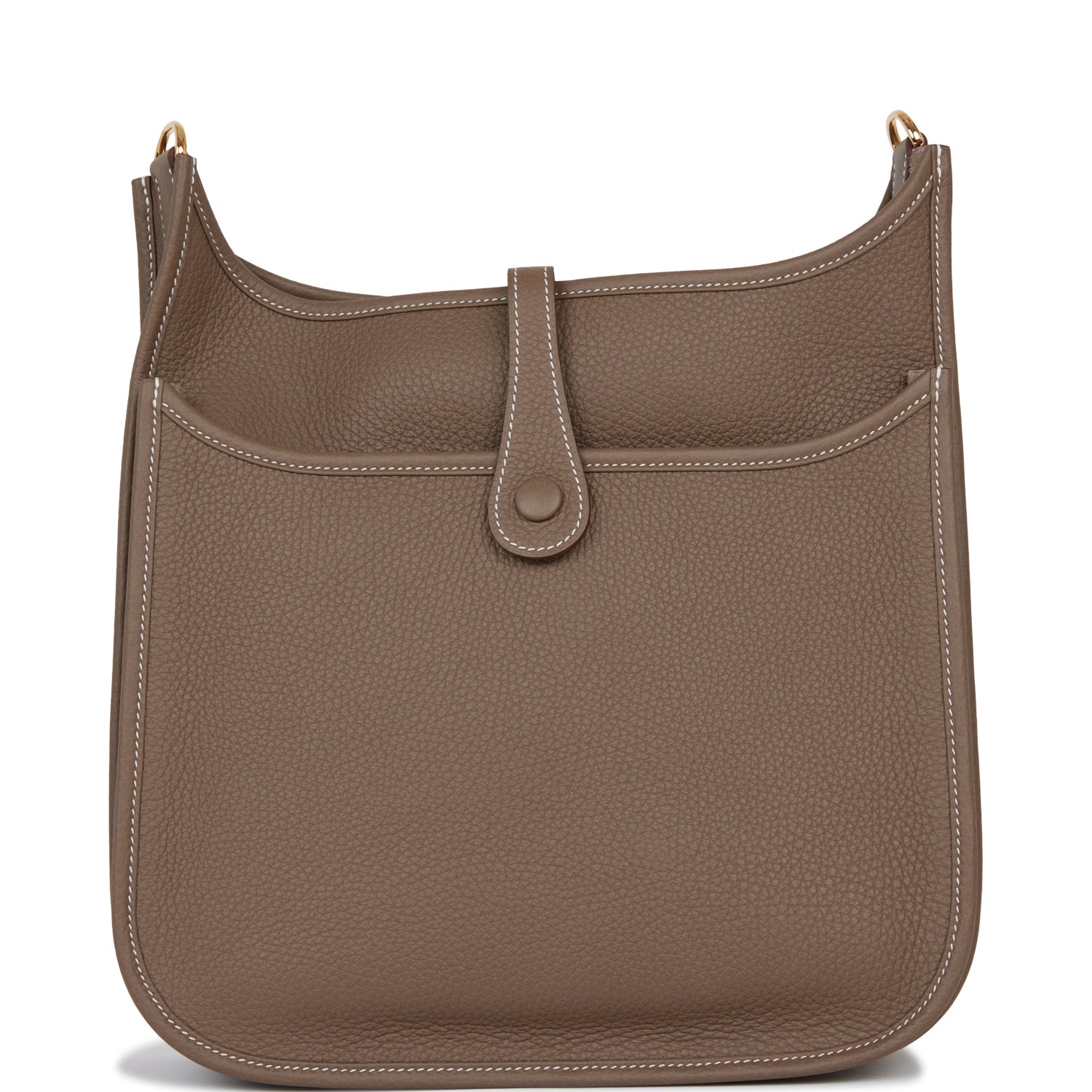 This Evelyne is in Etoupe clemence leather with gold hardware and has contrast stitching, pull tab top closure and Etoupe removable canvas and leather shoulder/crossbody strap.