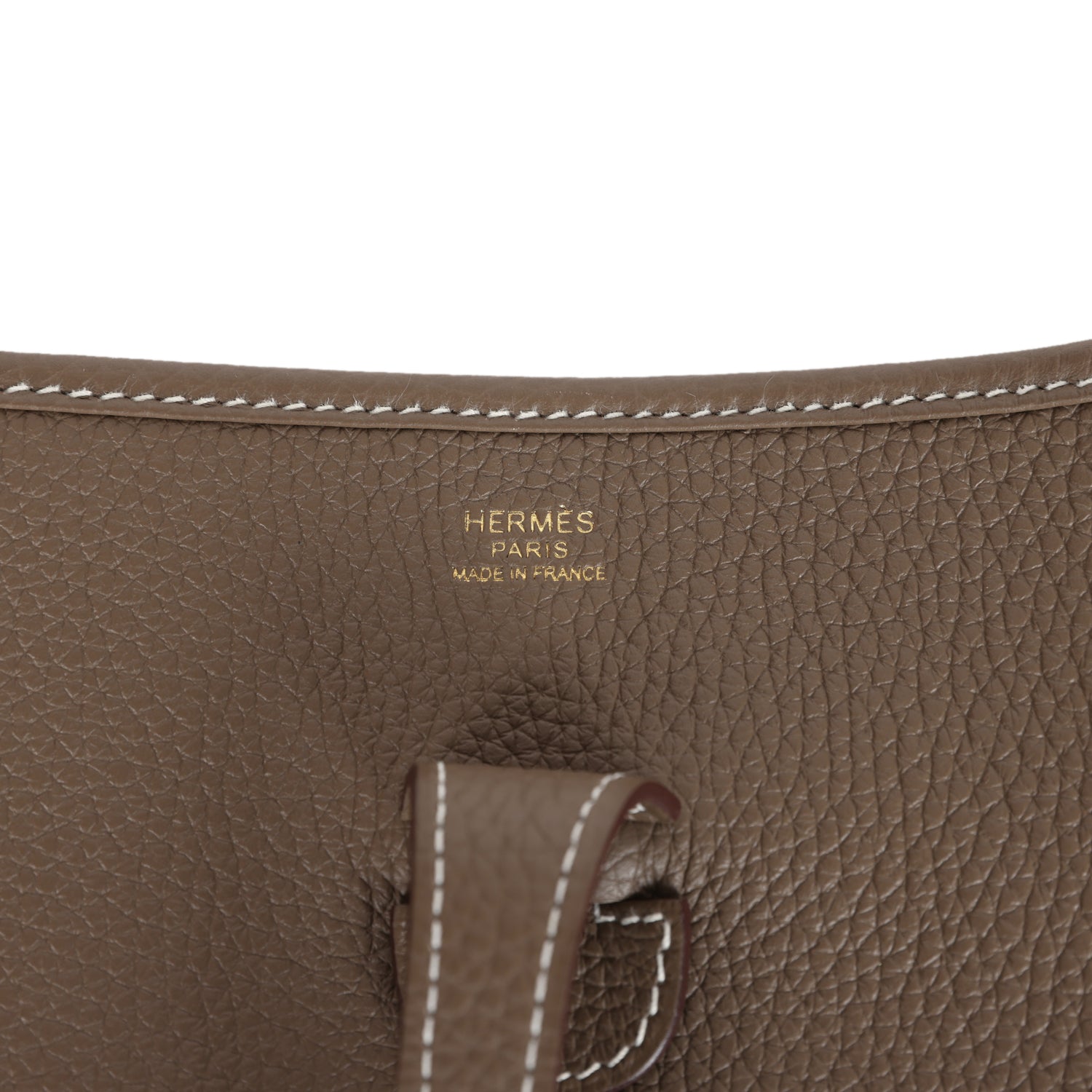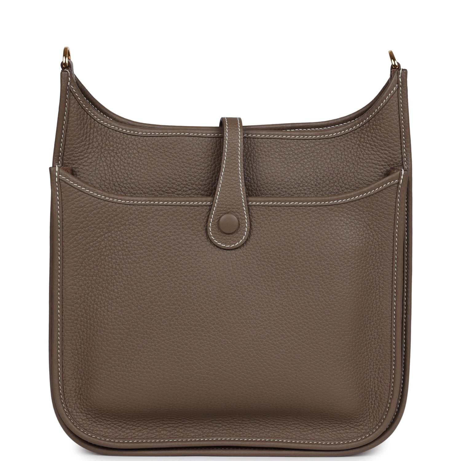 This Evelyne is in Etoupe clemence leather with gold hardware and has contrast stitching, pull tab top closure and Etoupe removable canvas and leather shoulder/crossbody strap.