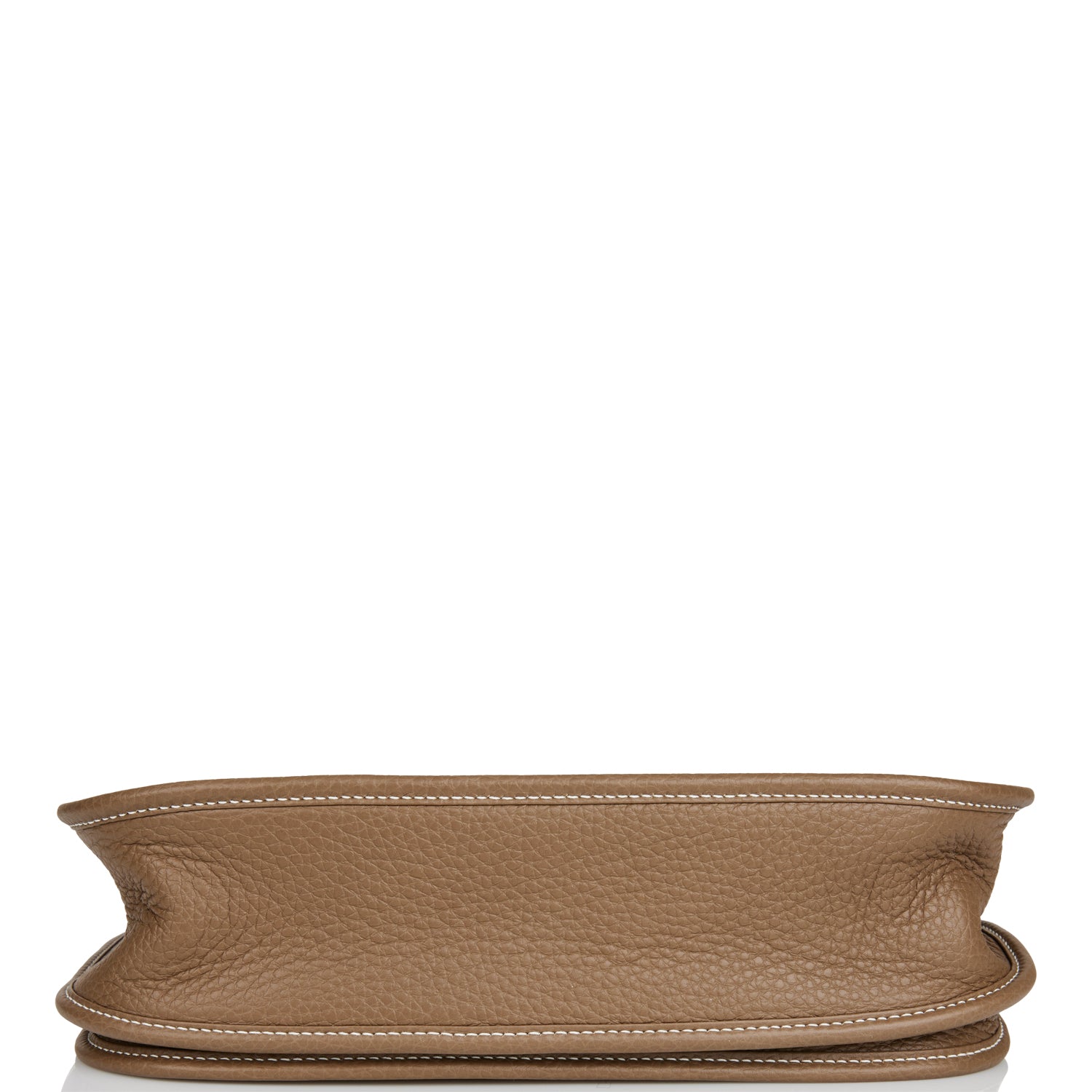 This Evelyne is in Etoupe clemence leather with palladium hardware and has contrast stitching, pull tab top closure and Etoupe removable canvas and leather shoulder/crossbody strap.