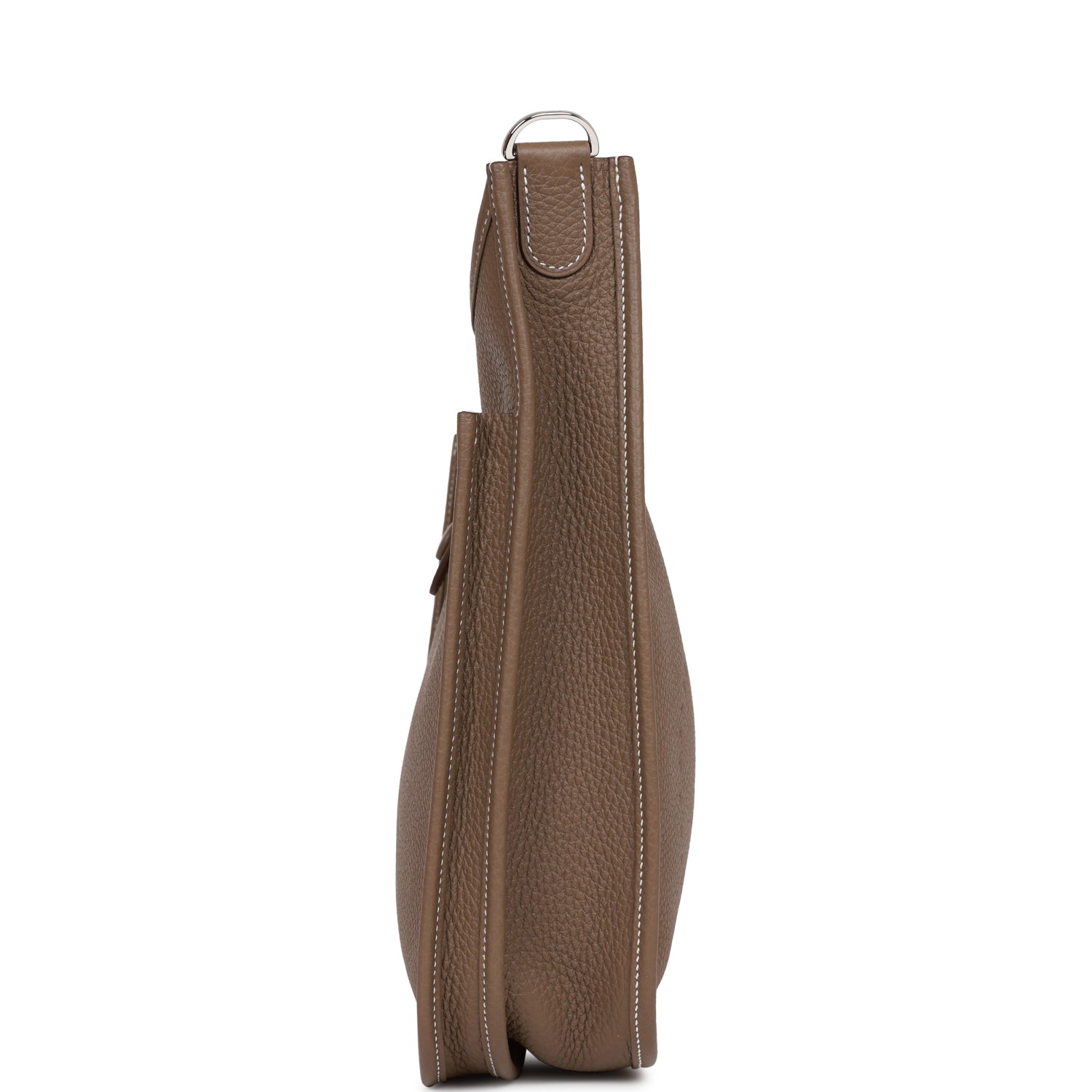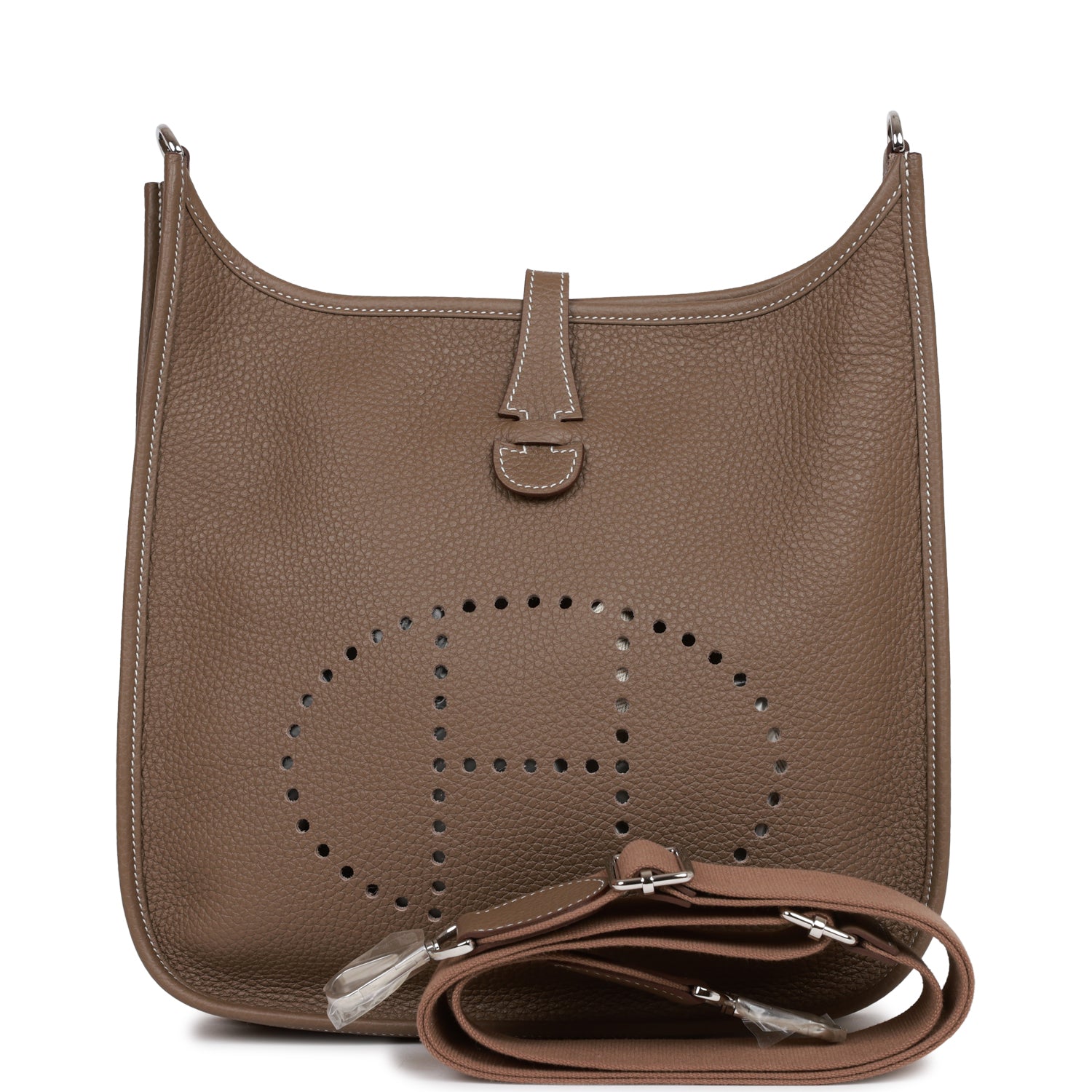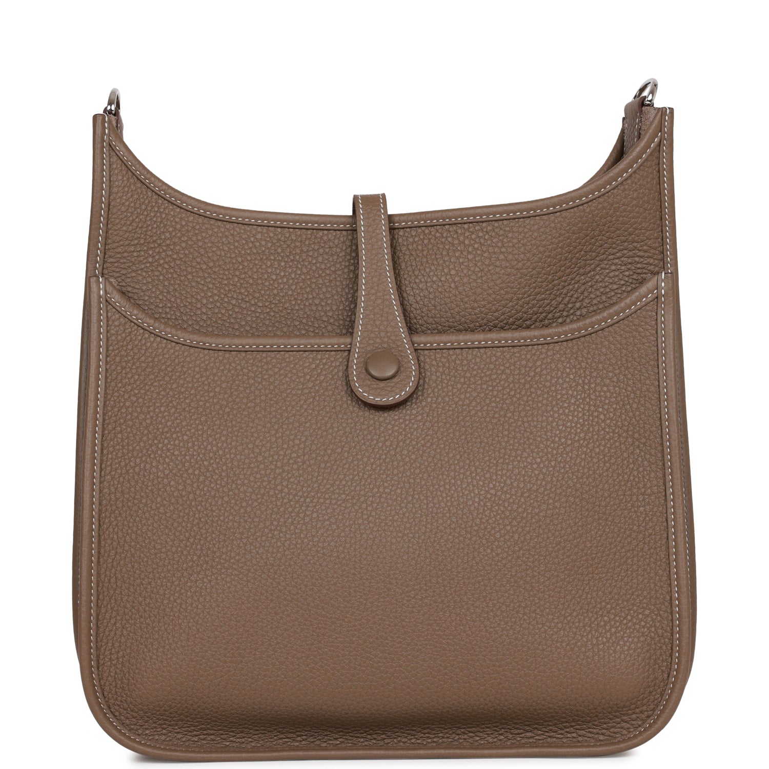 This Evelyne is in Etoupe clemence leather with palladium hardware and has contrast stitching, pull tab top closure and Etoupe removable canvas and leather shoulder/crossbody strap.