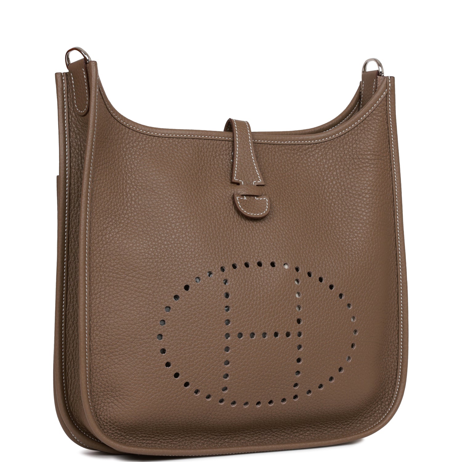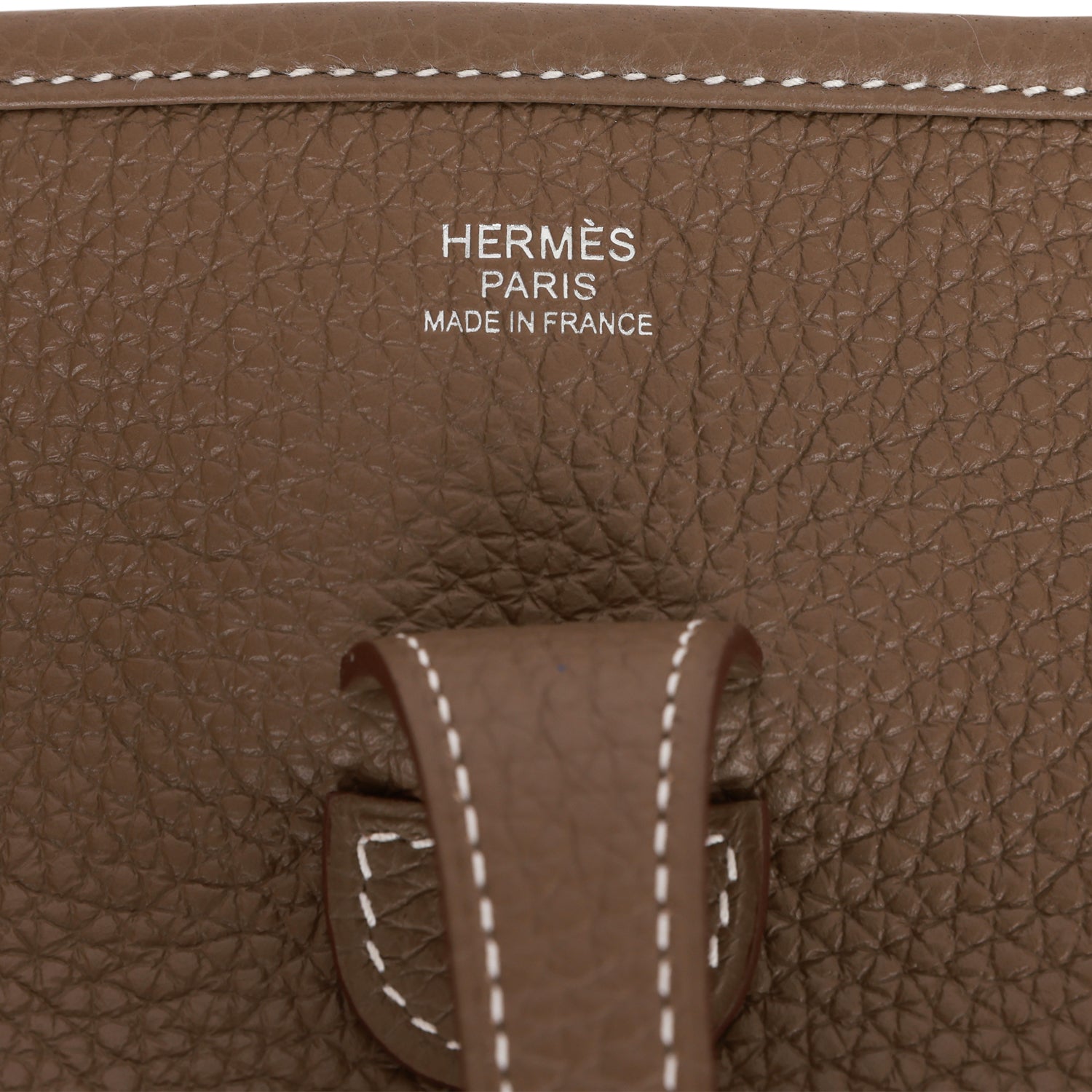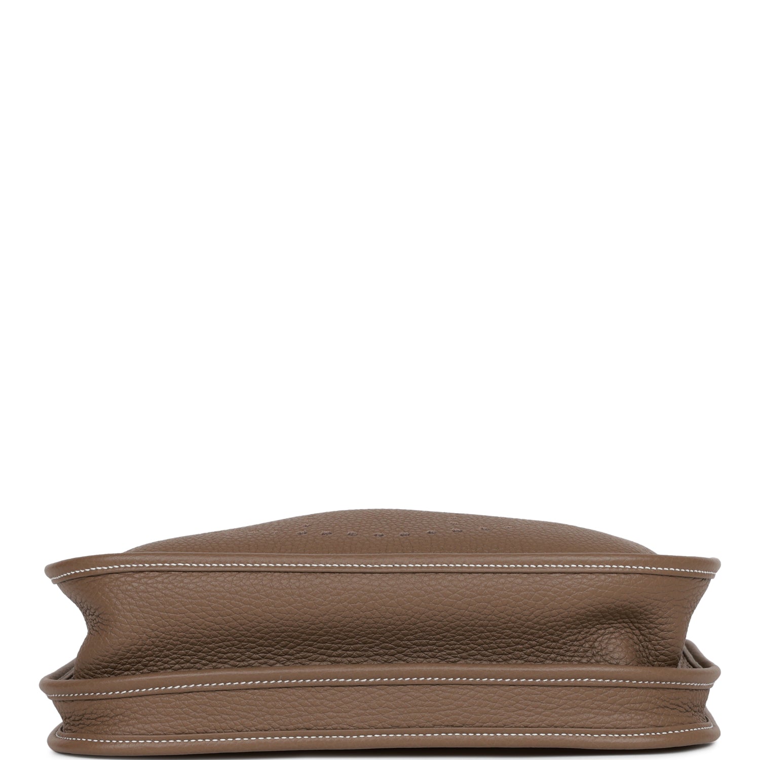 This Evelyne is in Etoupe clemence leather with palladium hardware and has contrast stitching, pull tab top closure and Etoupe removable canvas and leather shoulder/crossbody strap.