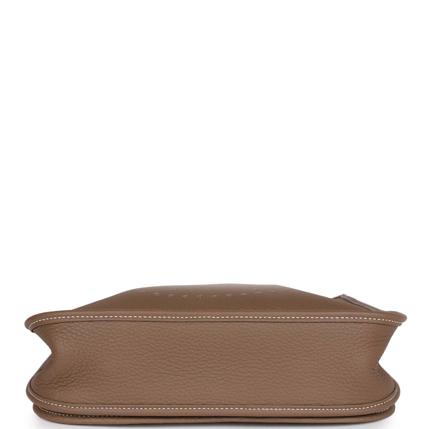This Evelyne is in Etoupe clemence leather with palladium hardware and has contrast stitching, pull tab top closure and Etoupe removable canvas and leather shoulder/crossbody strap.