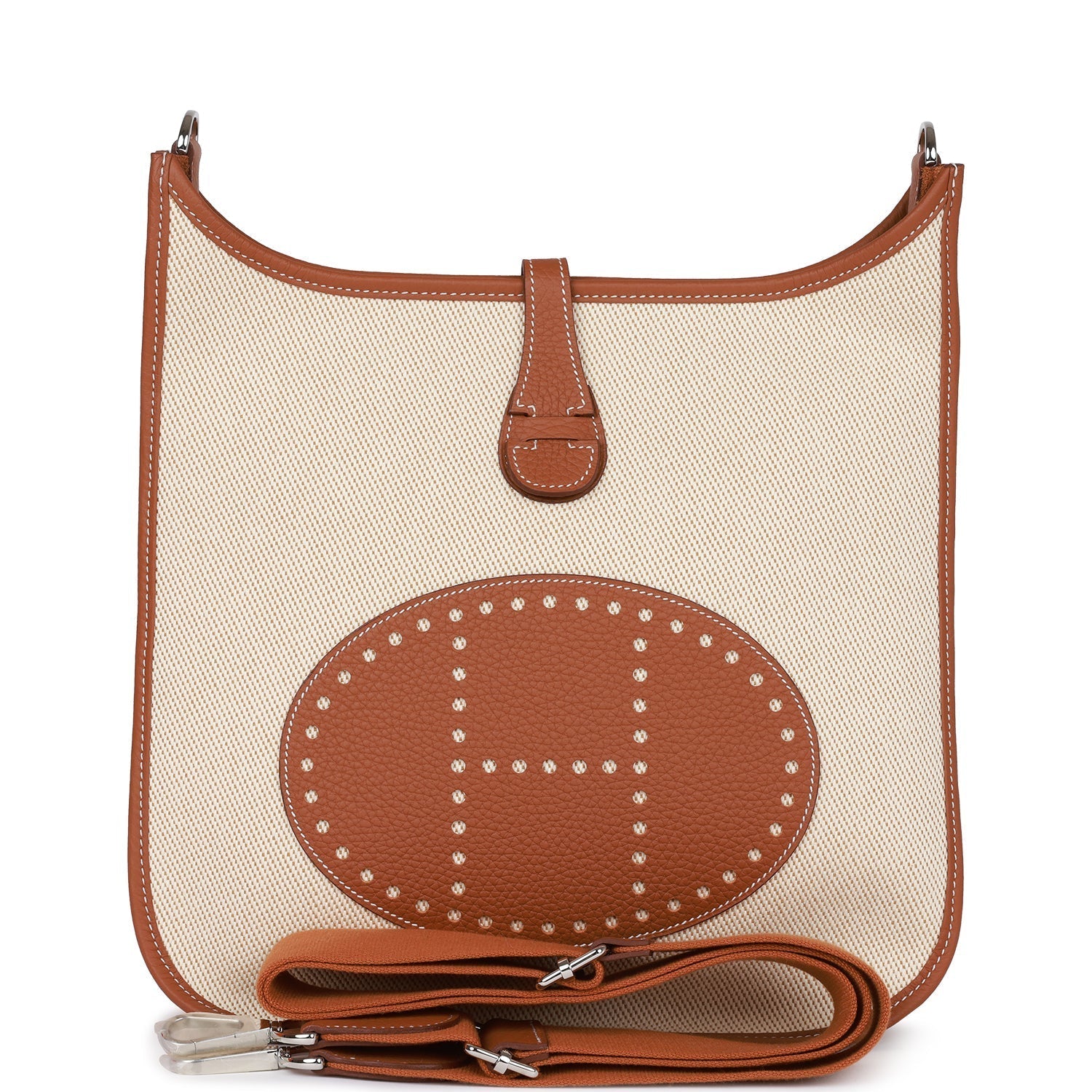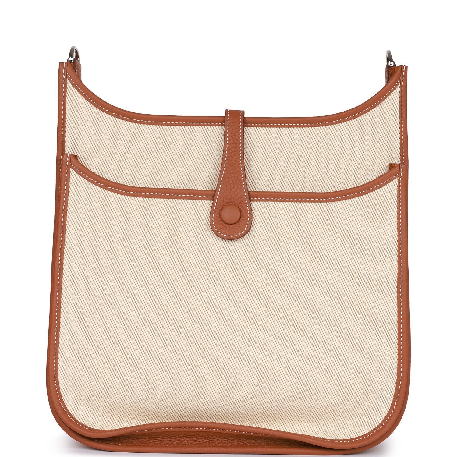 This Evelyne is in Gold clemence leather and toile with palladium hardware and has tonal stitching, pull tab top closure and Gold removable canvas and leather shoulder/crossbody strap.