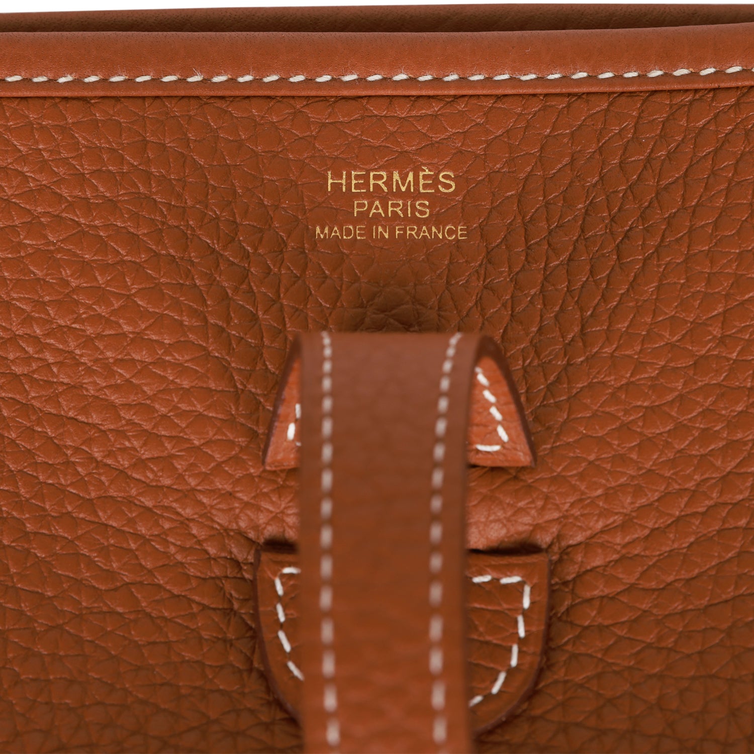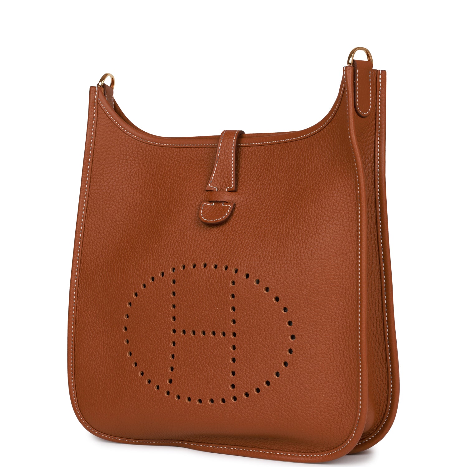 This Evelyne is in Gold clemence leather with gold hardware and has contrast stitching, pull tab top closure and gold removable canvas and leather shoulder/crossbody strap.