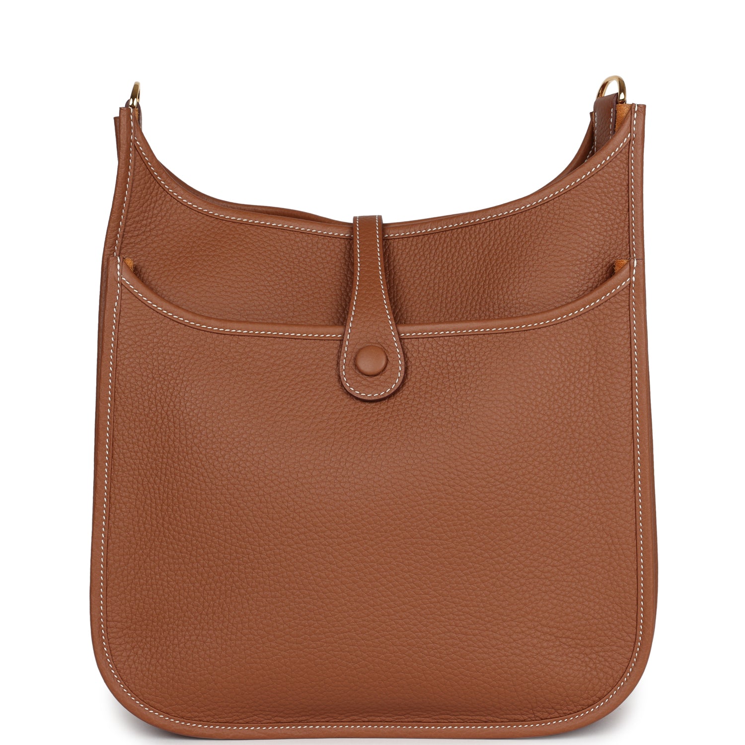 This Evelyne is in Gold clemence leather with gold hardware and has contrast stitching, pull tab top closure and gold removable canvas and leather shoulder/crossbody strap.