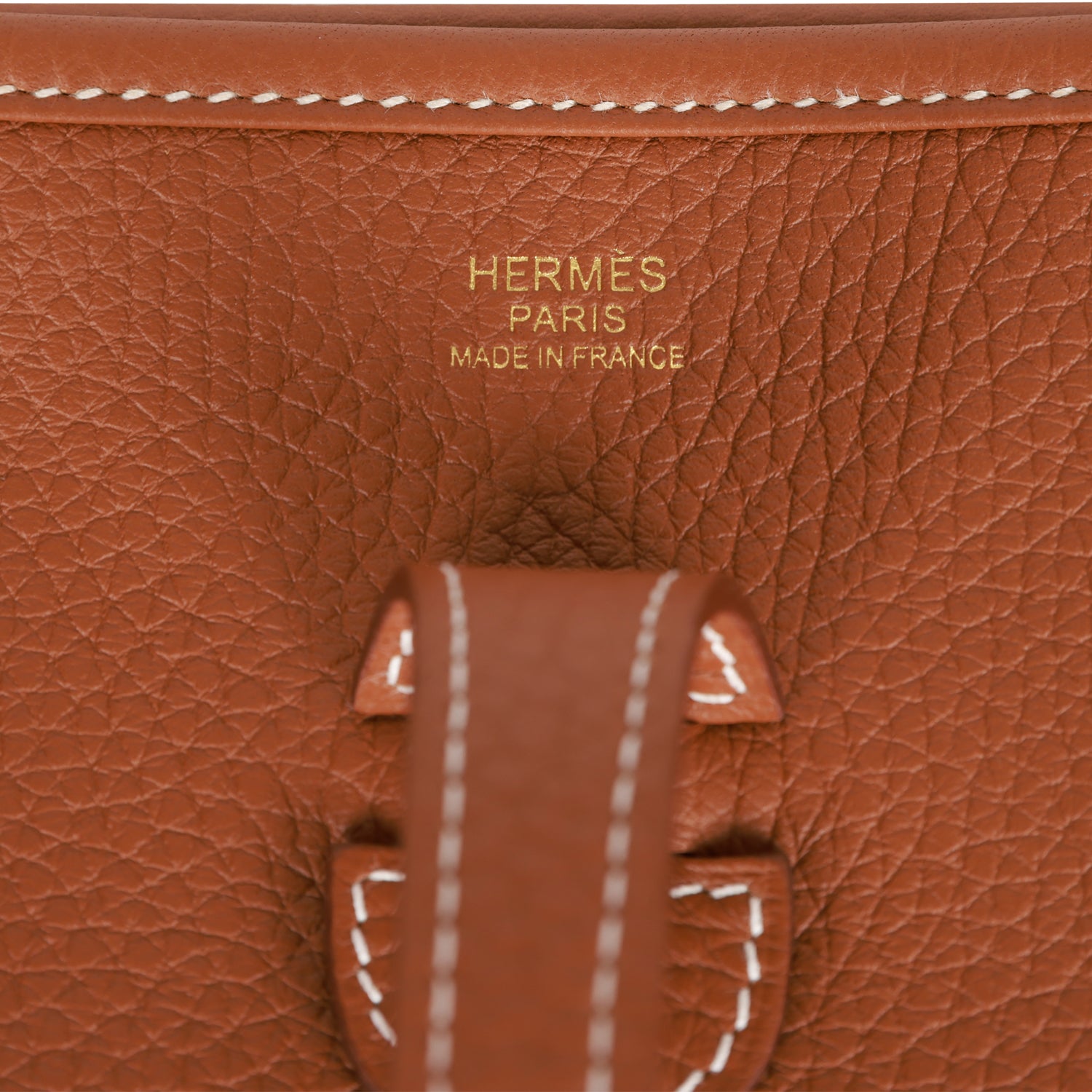 This Evelyne is in Gold clemence leather with gold hardware and has contrast stitching, pull tab top closure and gold removable canvas and leather shoulder/crossbody strap.