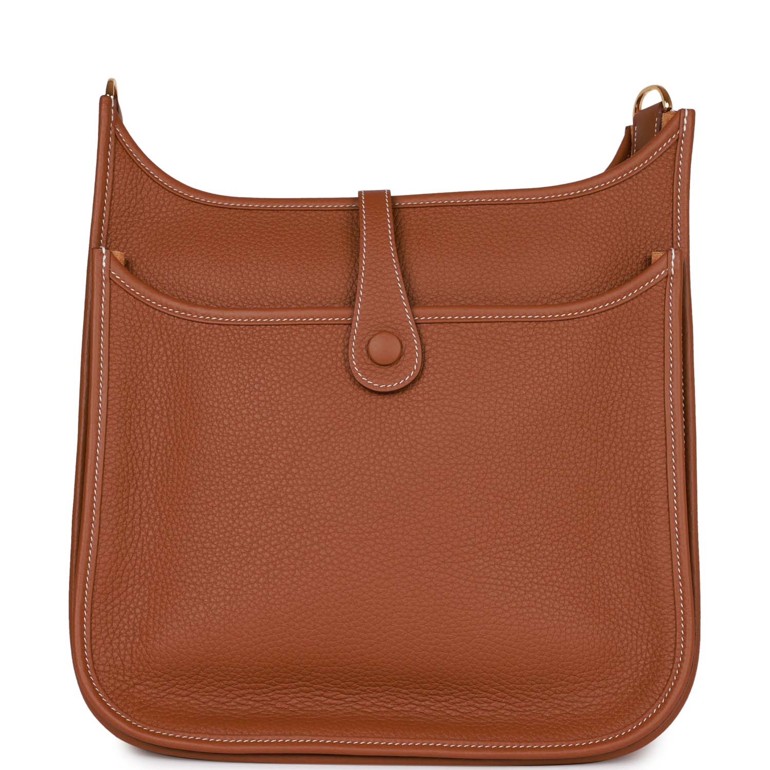 This Evelyne is in Gold clemence leather with gold hardware and has contrast stitching, pull tab top closure and gold removable canvas and leather shoulder/crossbody strap.