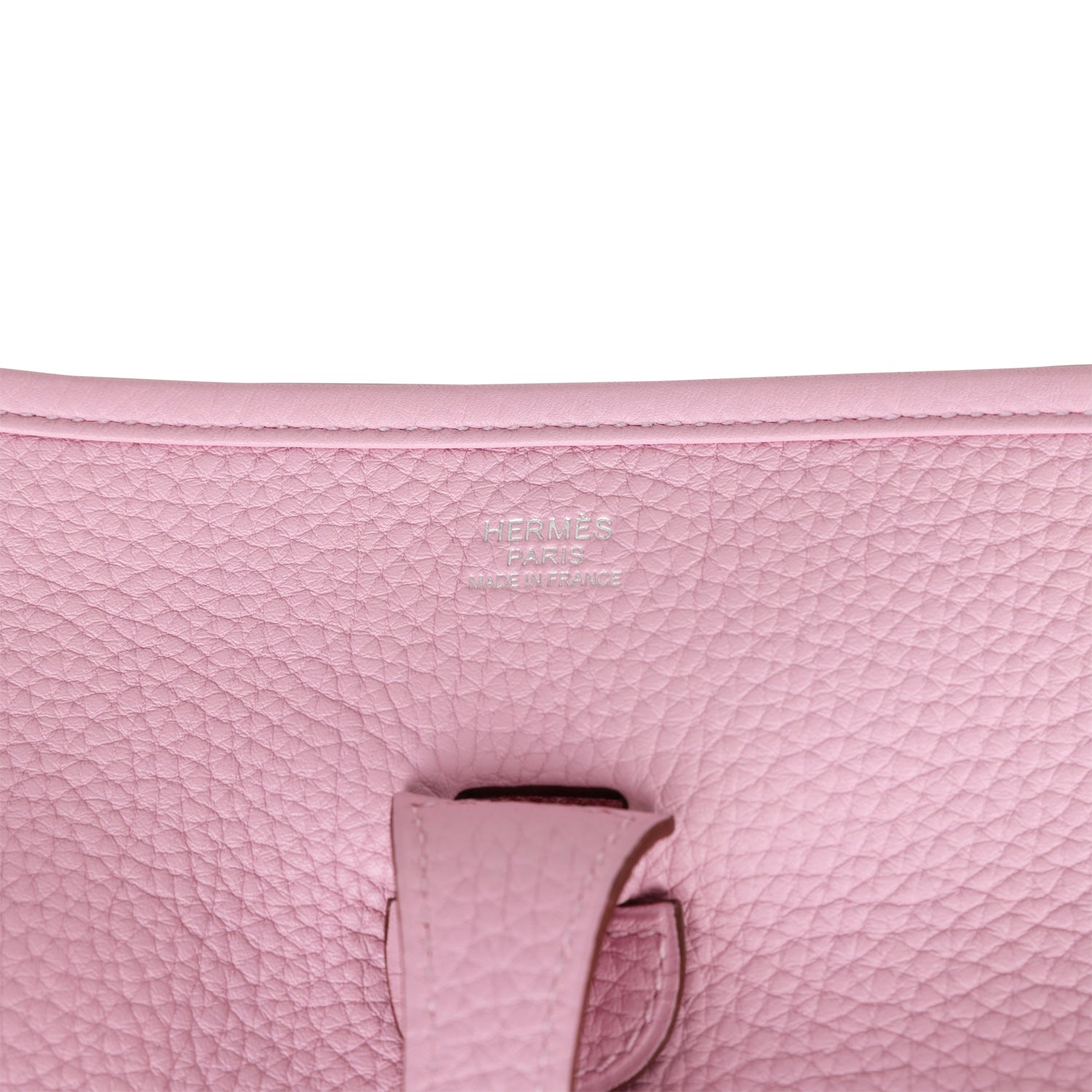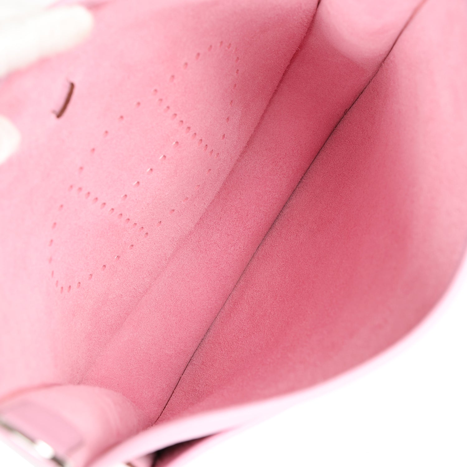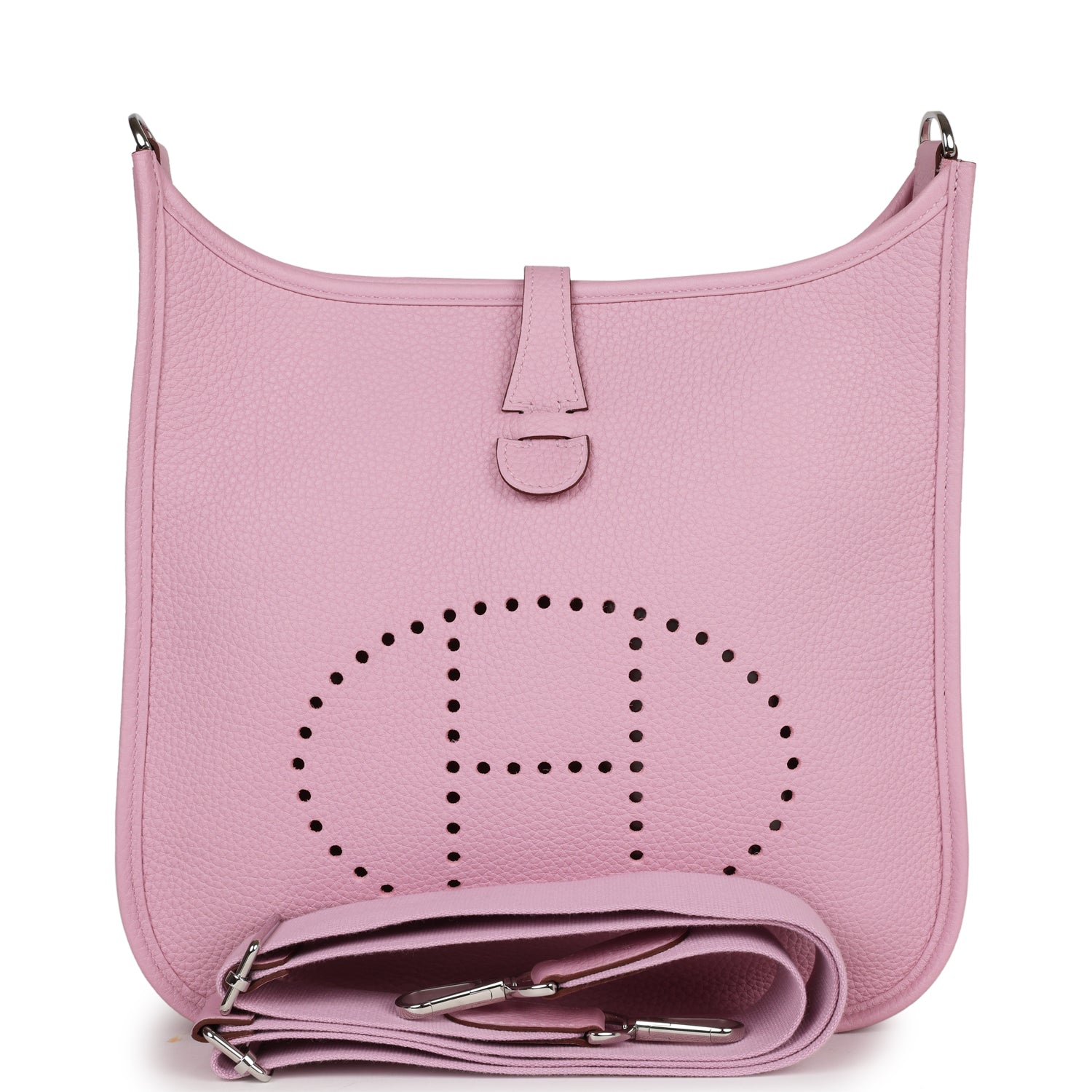 This Evelyne is in Mauve Sylvestre clemence leather with palladium hardware and has tonal stitching, pull tab top closure and Mauve Sylvestre removable canvas and leather shoulder/crossbody strap.