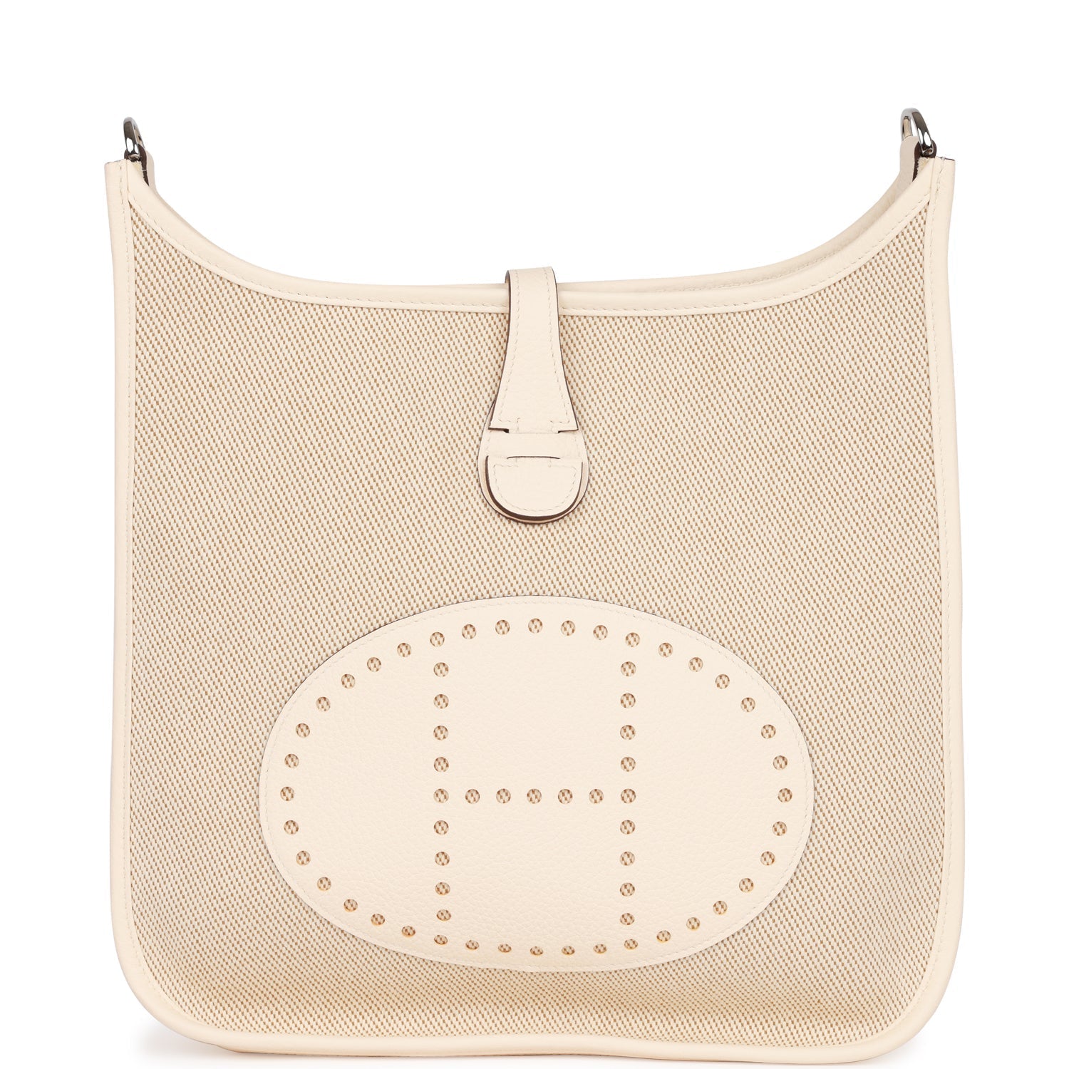 This Evelyne is in Nata clemence leather and toile with palladium hardware and has tonal stitching, pull tab top closure and black removable canvas and leather shoulder/crossbody strap.