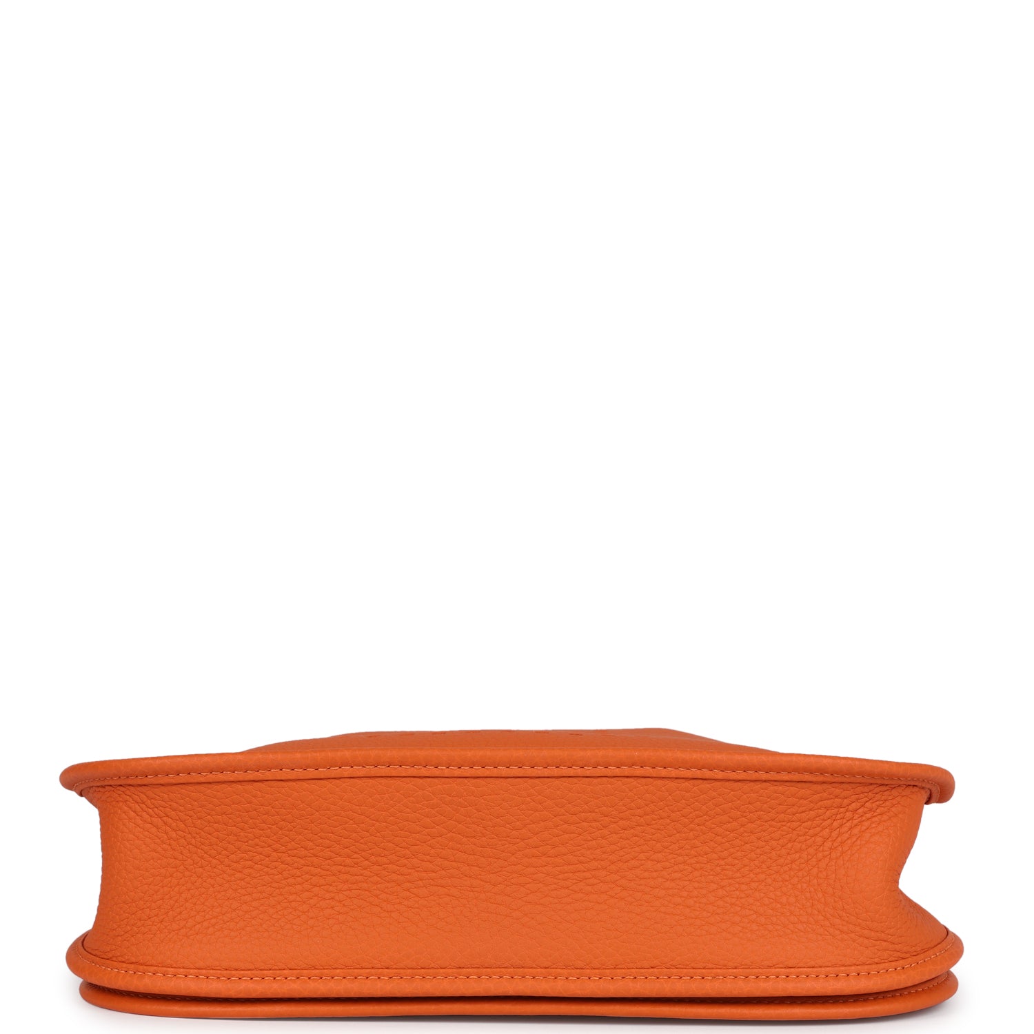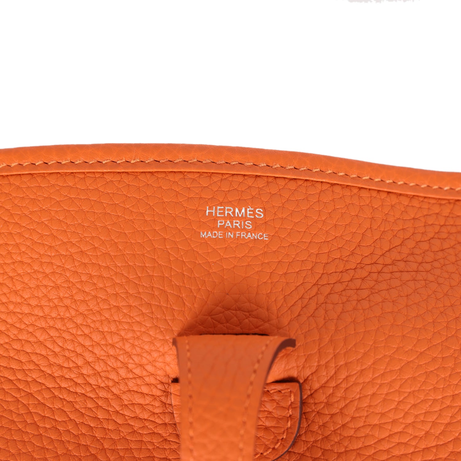 This Evelyne is of Orange clemence leather with palladium hardware, messenger bag with tonal stitching, large perforated H in circle (front), pull tab top snap closure and removable canvas shoulder/crossbody strap, with exterior back pocket.