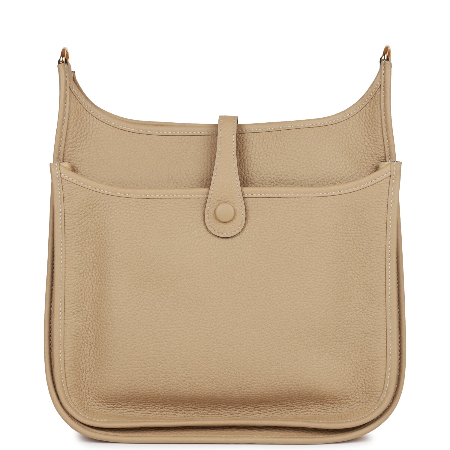 This Evelyne is in Trench clemence leather with gold hardware and has tonal stitching, pull tab top closure and Trench removable canvas and leather shoulder/crossbody strap.