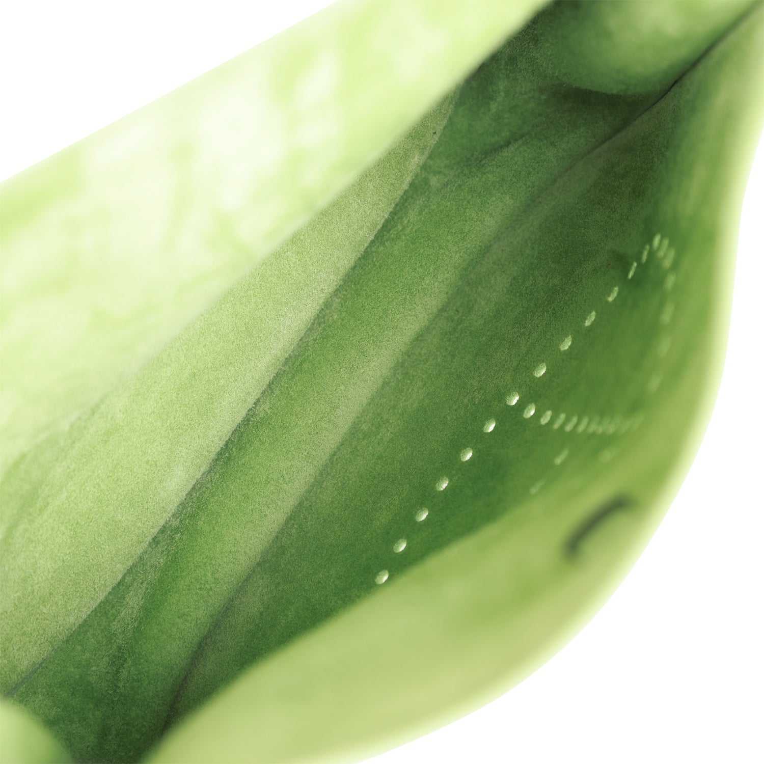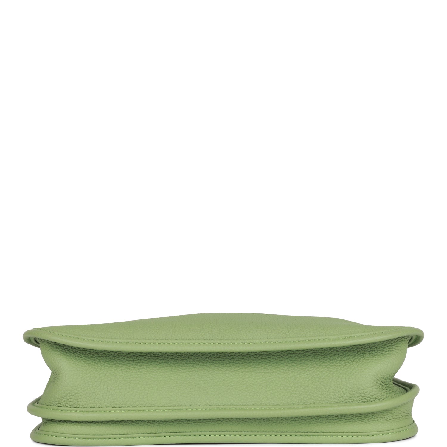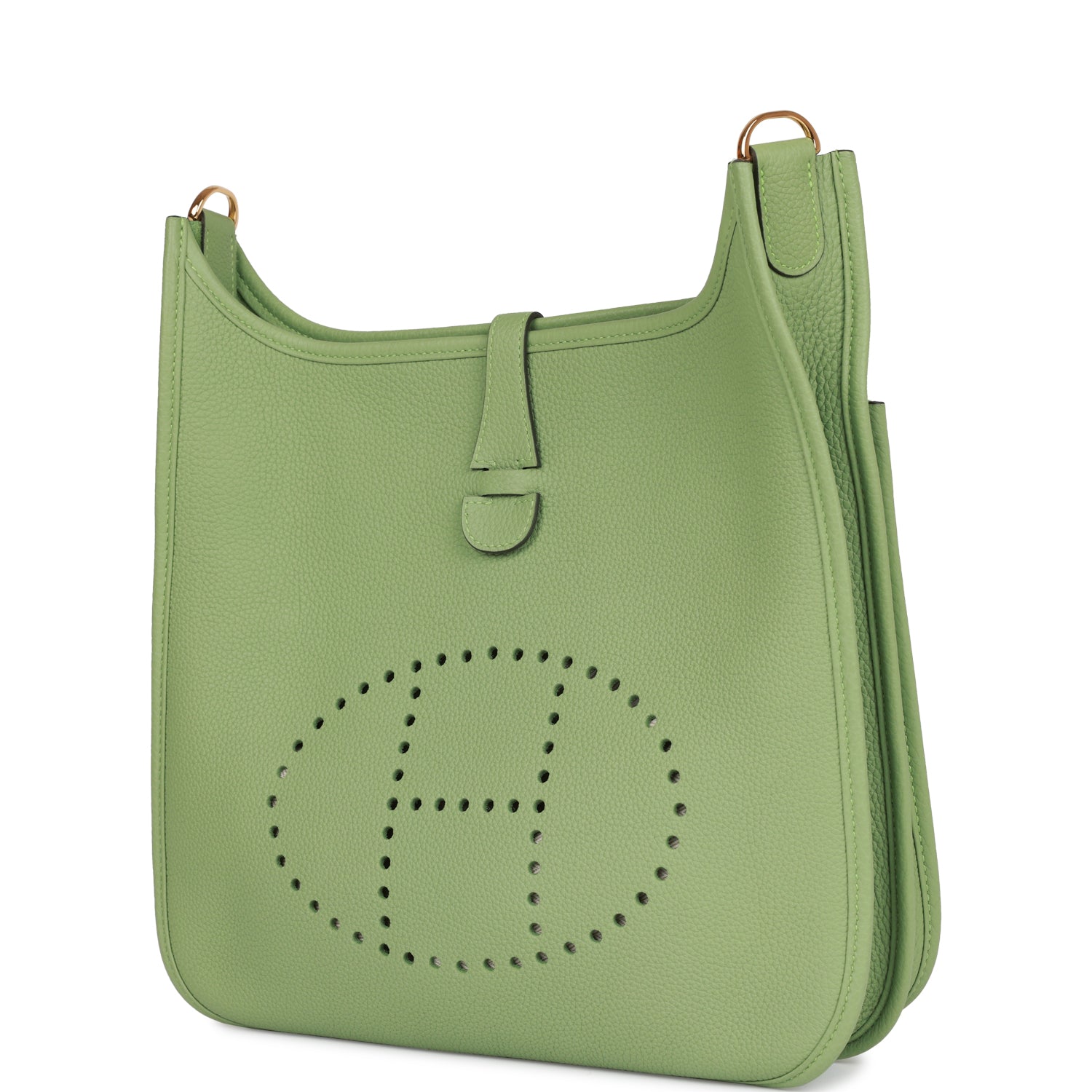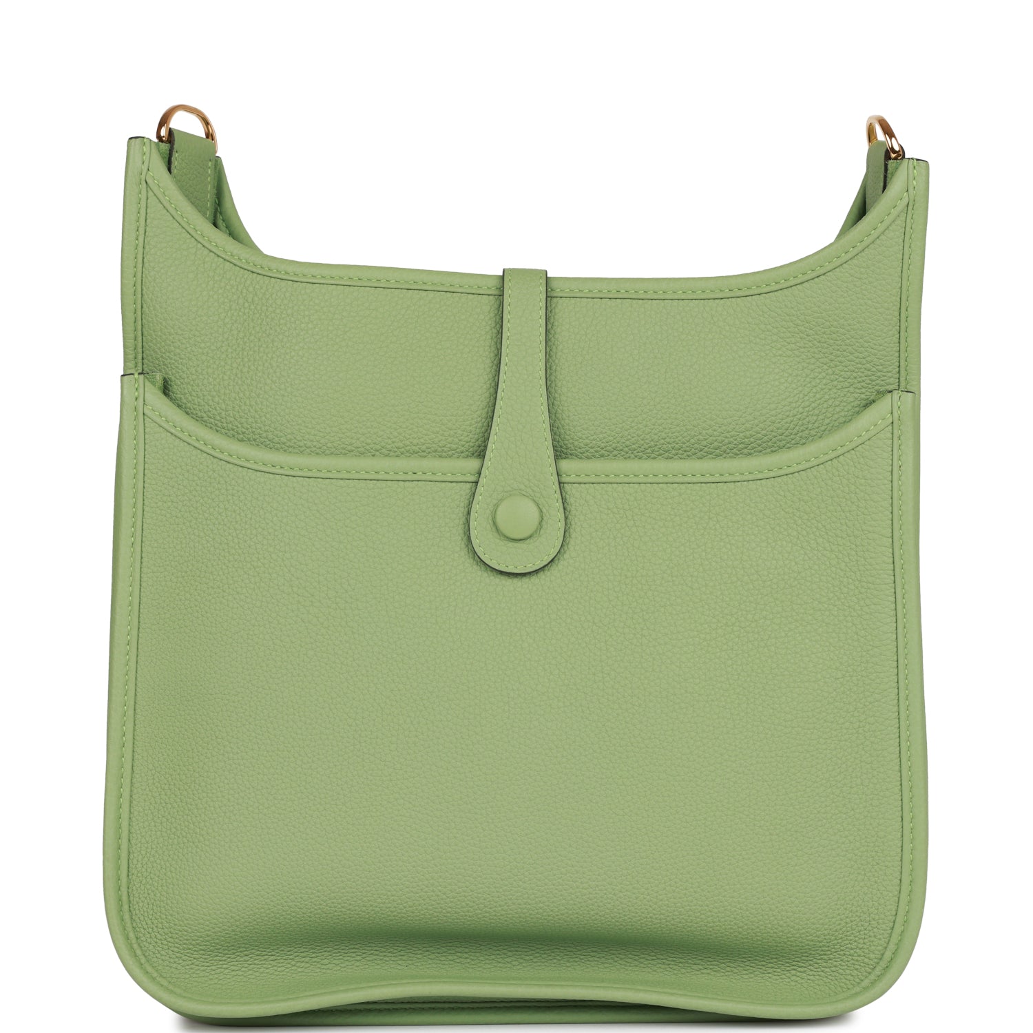 This Evelyne is in Vert Criquet clemence leather with gold hardware and has tonal stitching, pull tab top closure and Vert Criquet removable canvas and leather shoulder/crossbody strap.