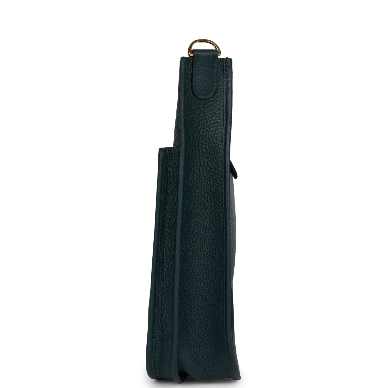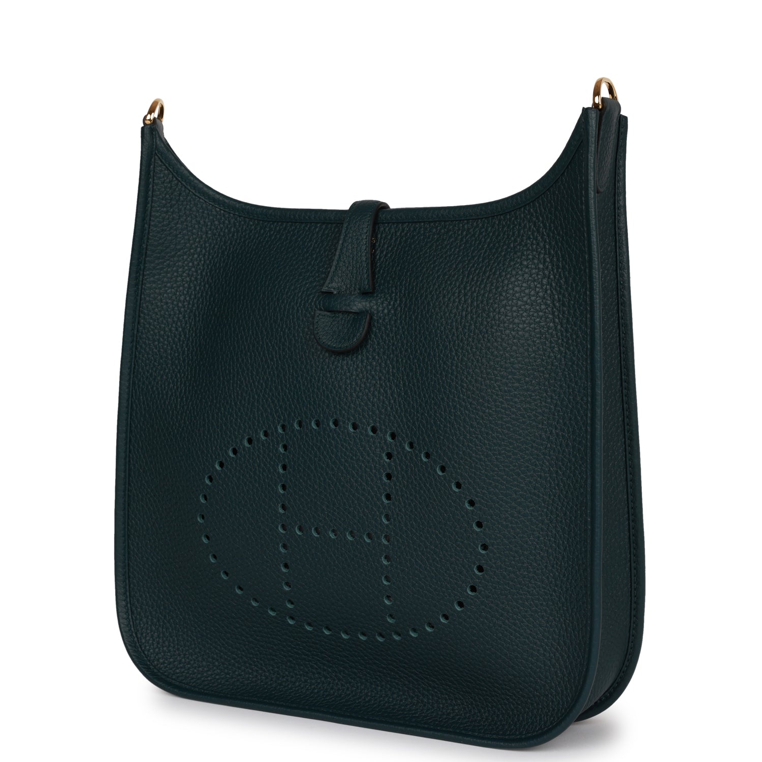 This Evelyne PM messenger bag is in Vert Cypress clemence leather with gold hardware, a large perforated H in circle at the front, pull tab top snap closure and removable vert cypress shoulder/crossbody strap.