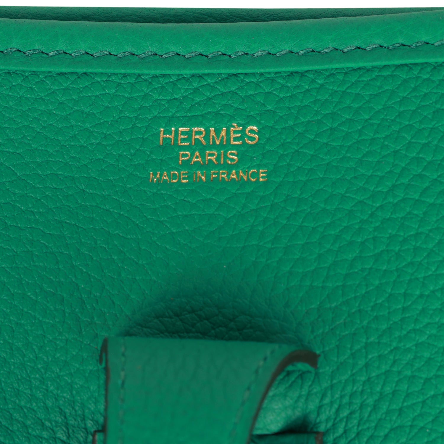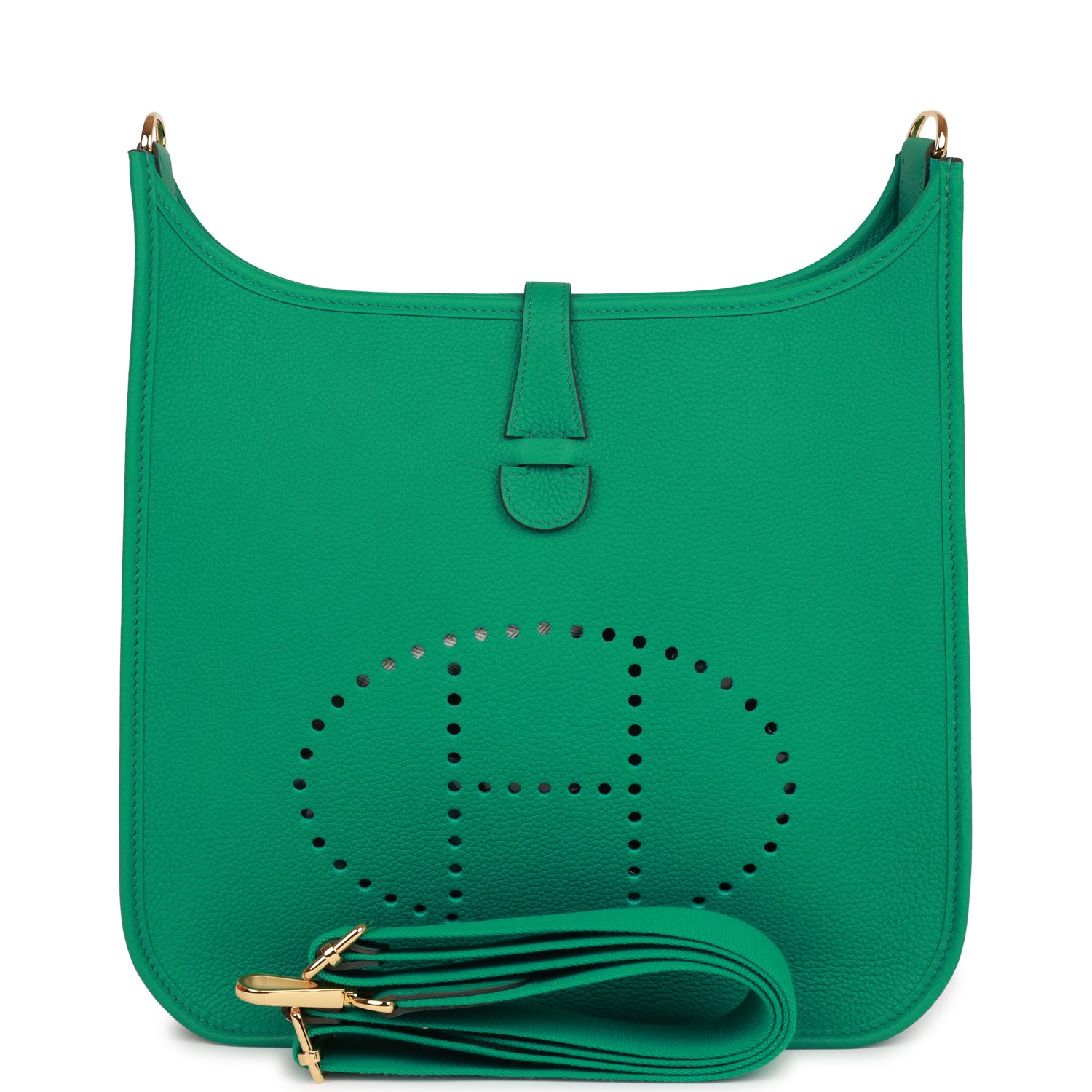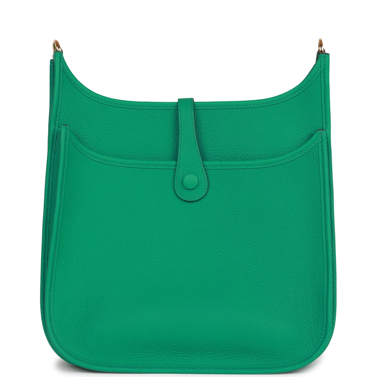 This Evelyne is in Vert Jade clemence leather with gold hardware and has tonal stitching, pull tab top closure and Vert Jade removable canvas and leather shoulder/crossbody strap.