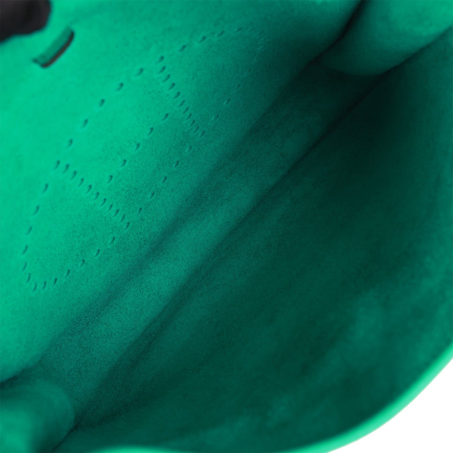 This Evelyne is in Vert Jade clemence leather with gold hardware and has tonal stitching, pull tab top closure and Vert Jade removable canvas and leather shoulder/crossbody strap.