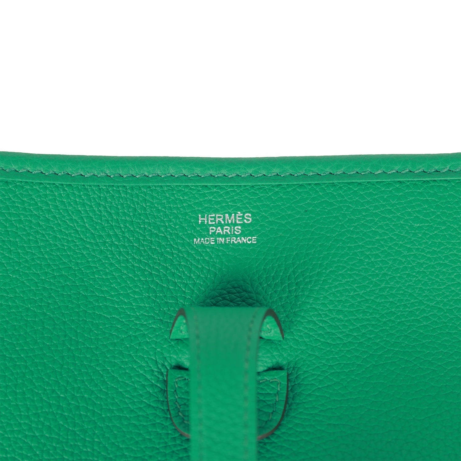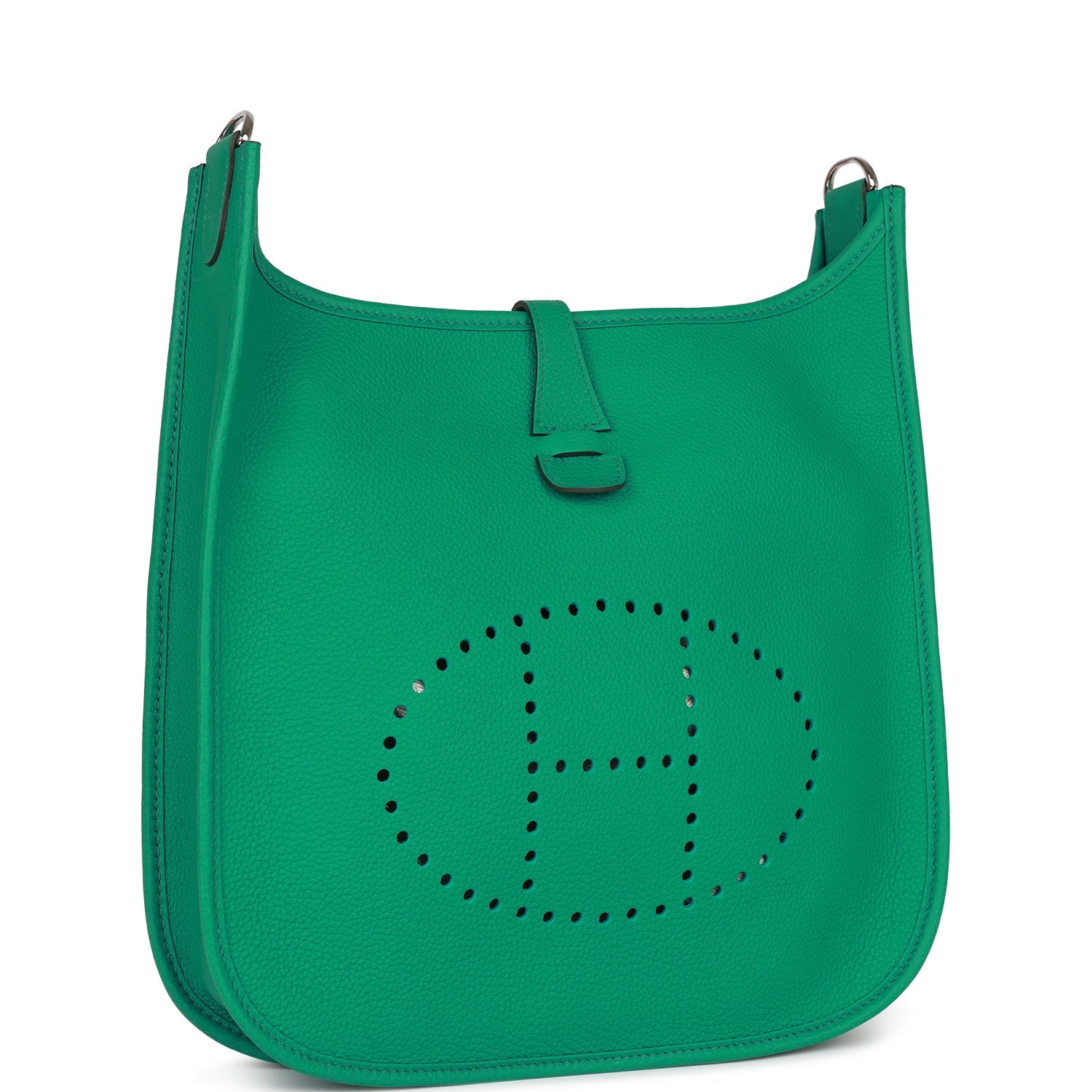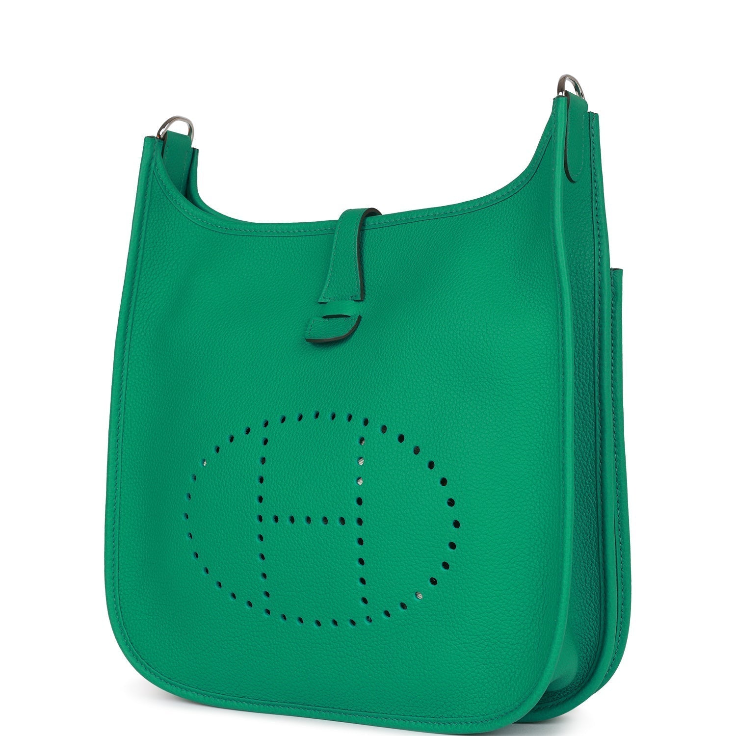This Evelyne is in Vert Jade clemence leather with palladium hardware and has tonal stitching, pull tab top closure and Vert Jade removable canvas and leather shoulder/crossbody strap.