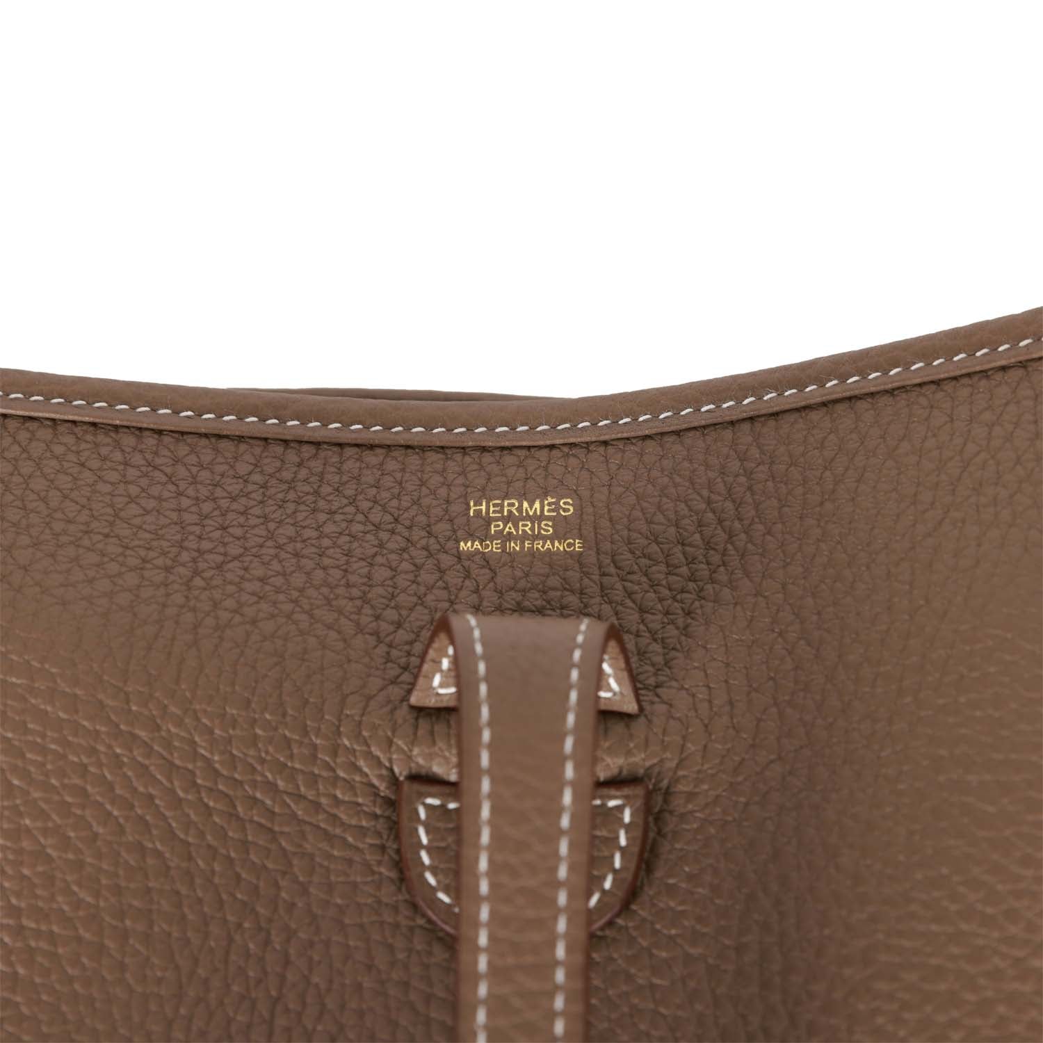 This Evelyne III PM messenger bag is in Etoupe Clemence leather with gold hardware and features contrast stitching stitching, pull tab top closure and an etoupe removable canvas and leather shoulder/crossbody strap.