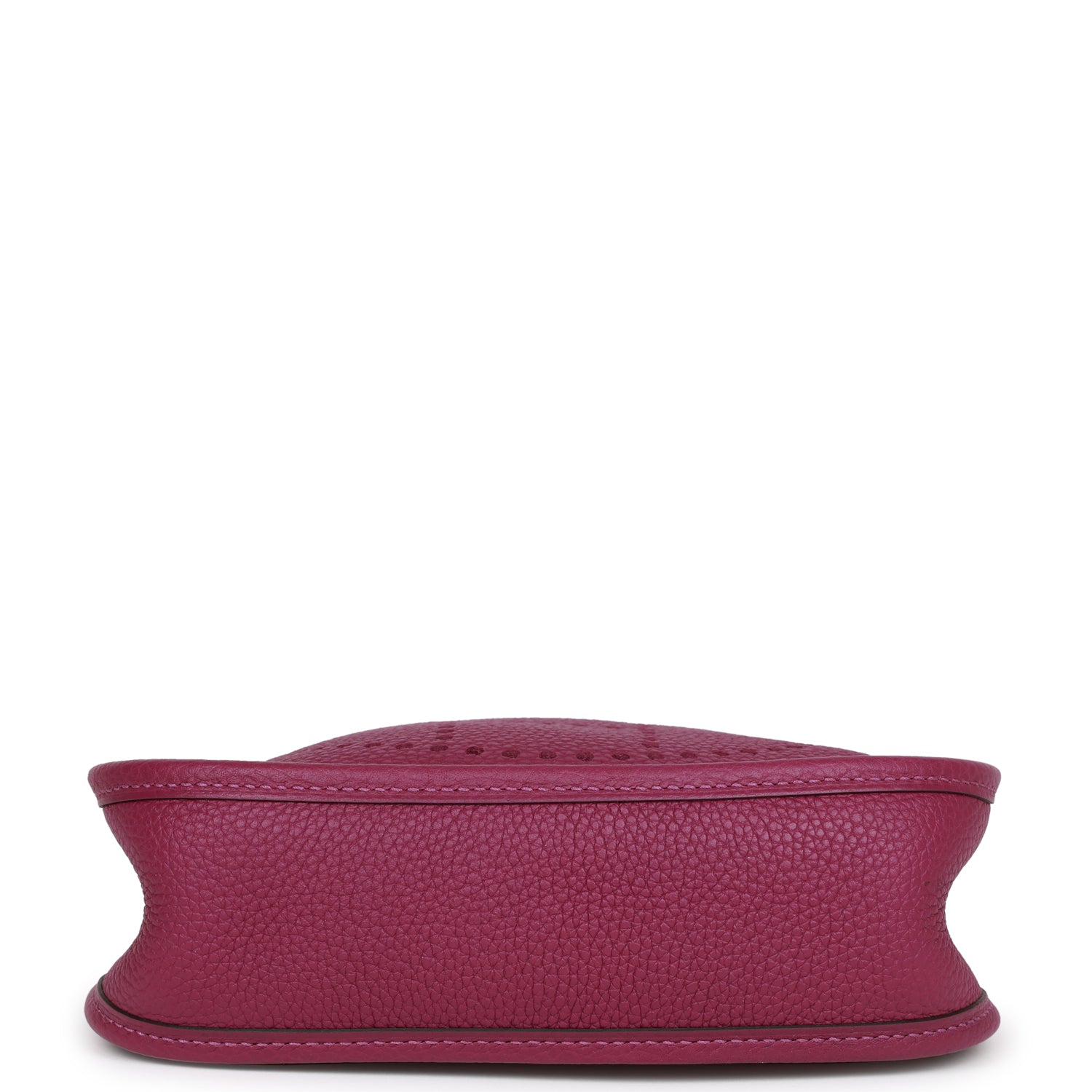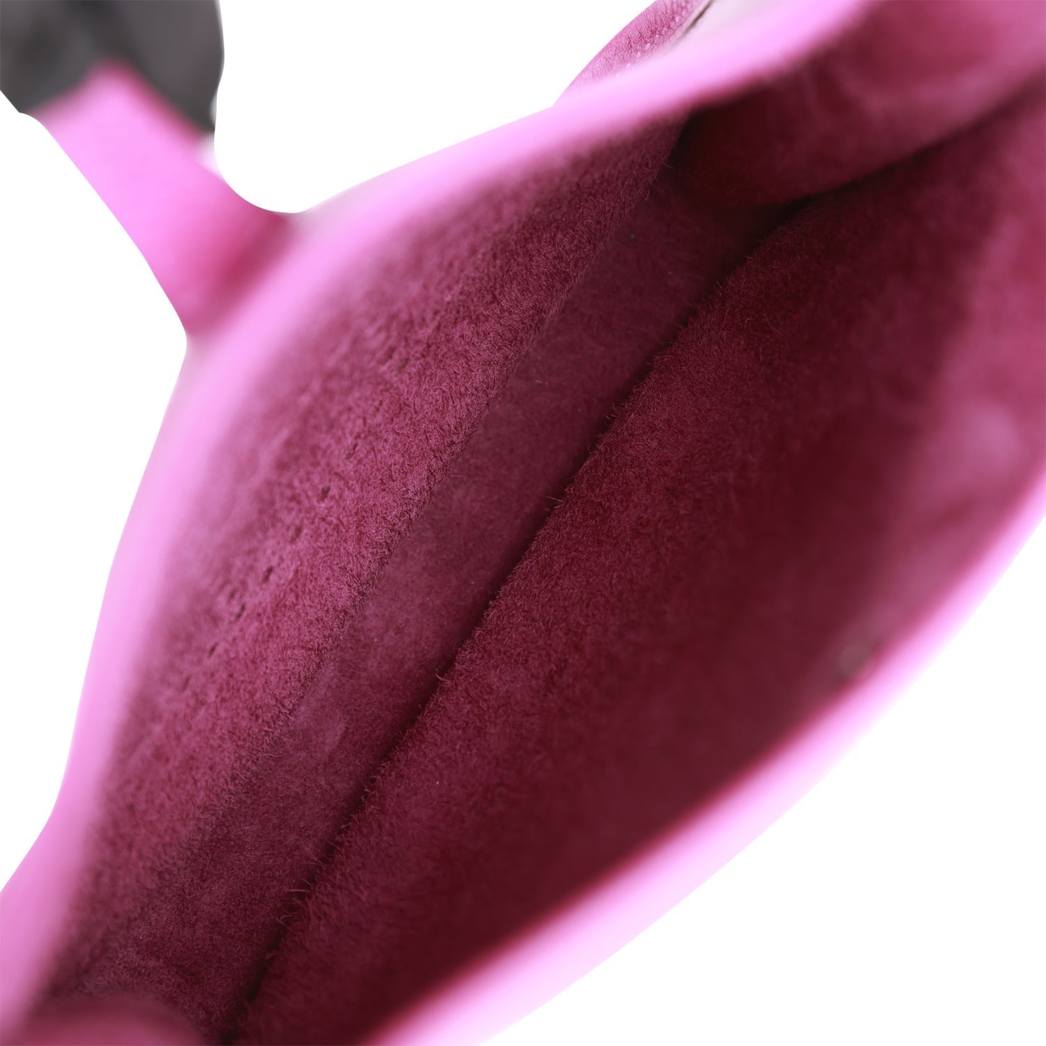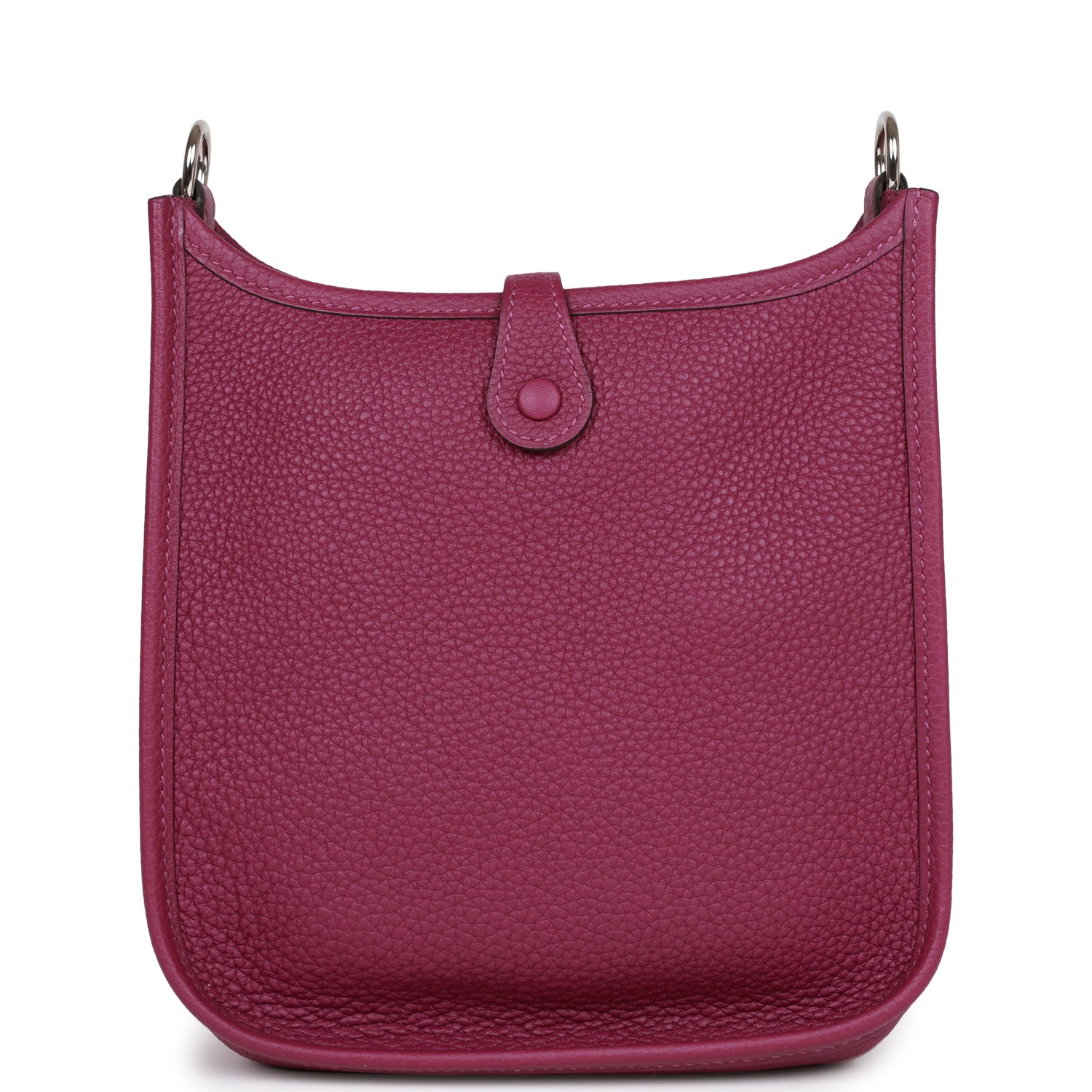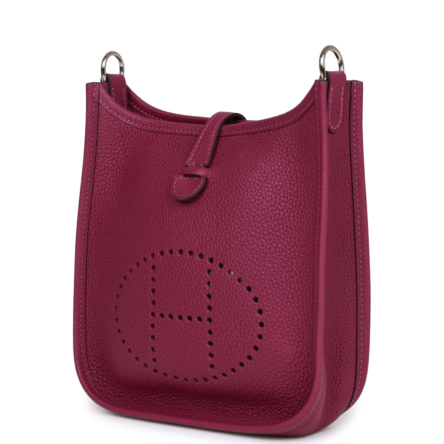 This Evelyne is in Anemone clemence leather with palladium hardware and has tonal stitching, pull tab top closure and a Bleu Marine removable canvas and leather shoulder/crossbody strap.