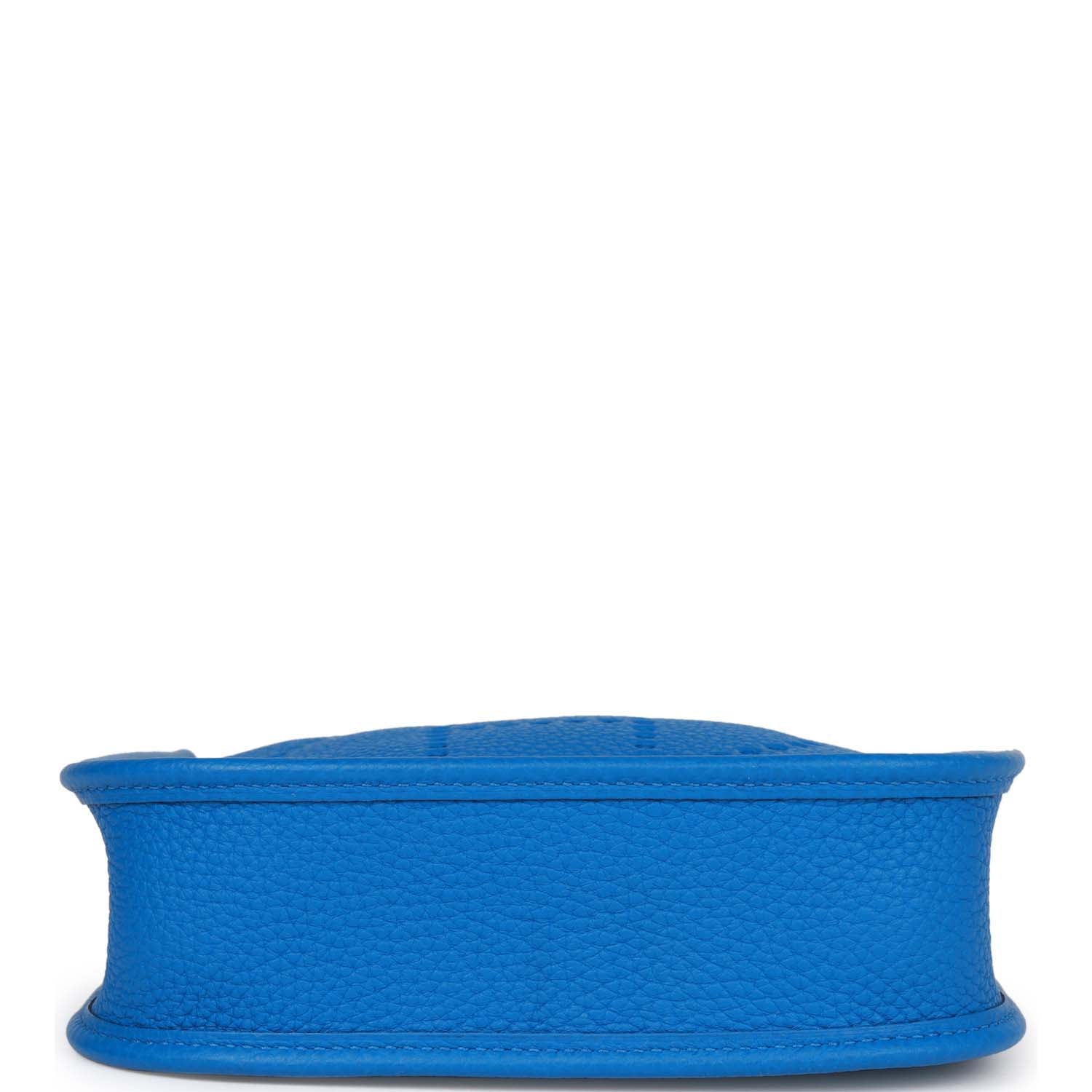 This Evelyne is in Bleu Zellige clemence leather with palladium hardware and has tonal stitching, pull tab top closure and a Bleu Zellige removable canvas and leather shoulder/crossbody strap.