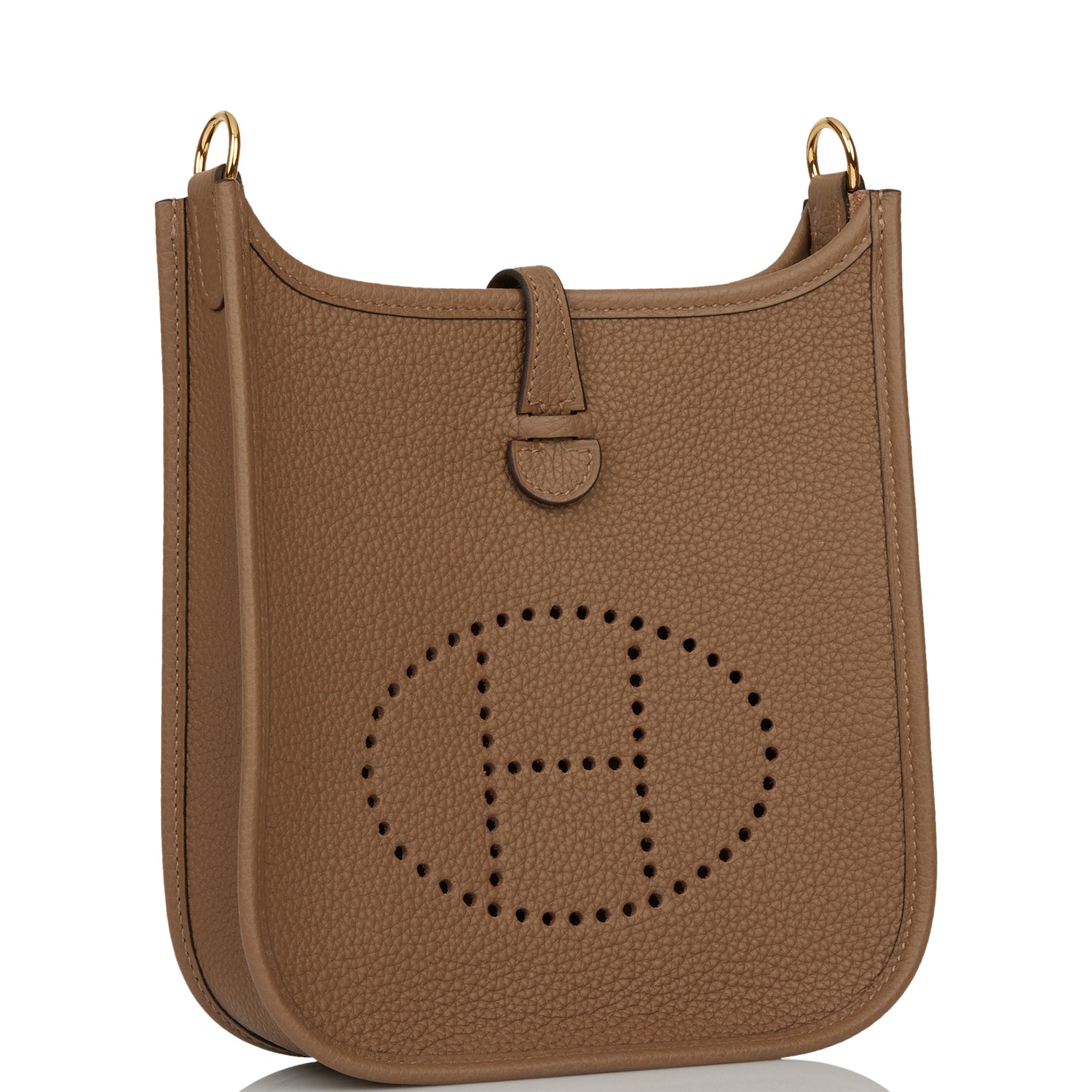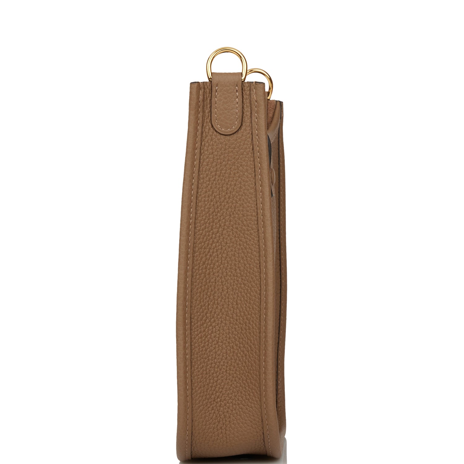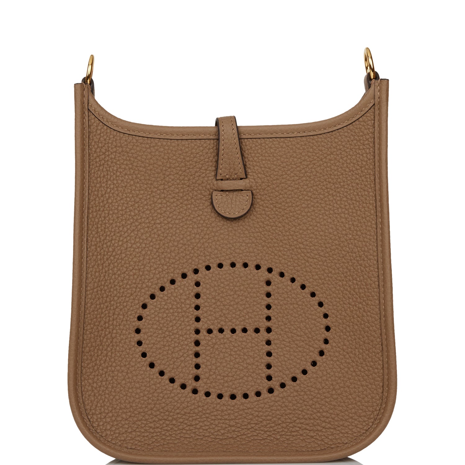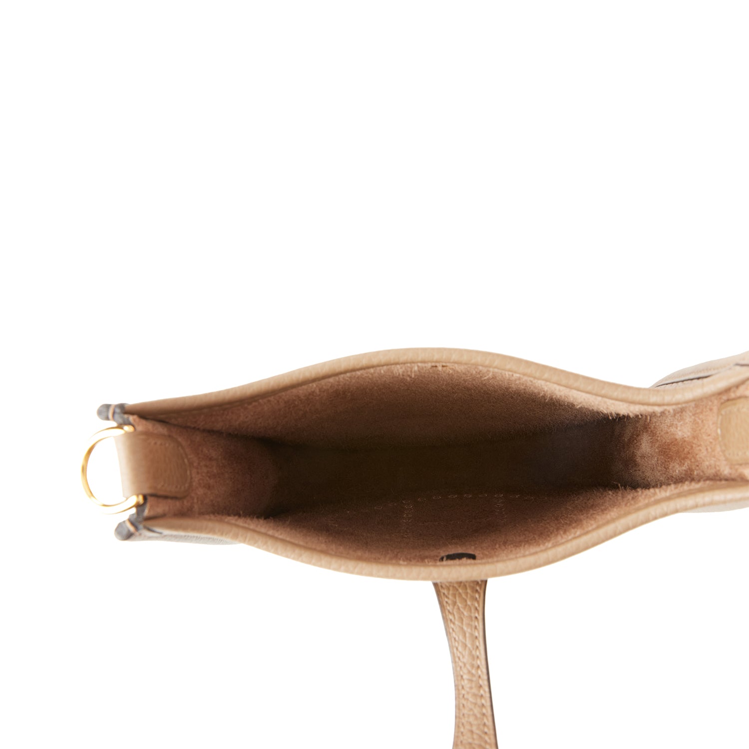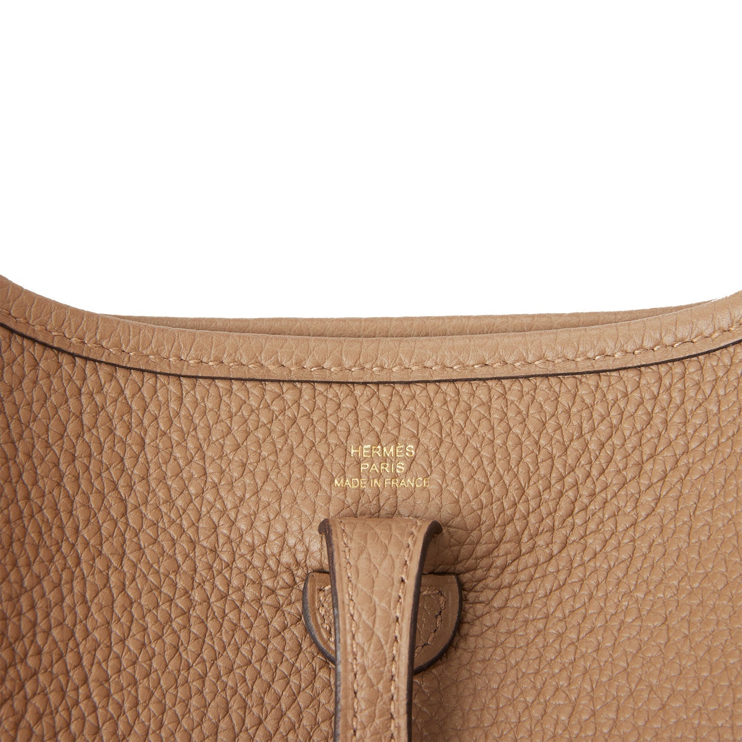 This Evelyne is in Beige de Weimar clemence leather with gold hardware and has tonal stitching, pull tab top closure and an Etain removable canvas and leather shoulder/crossbody strap.