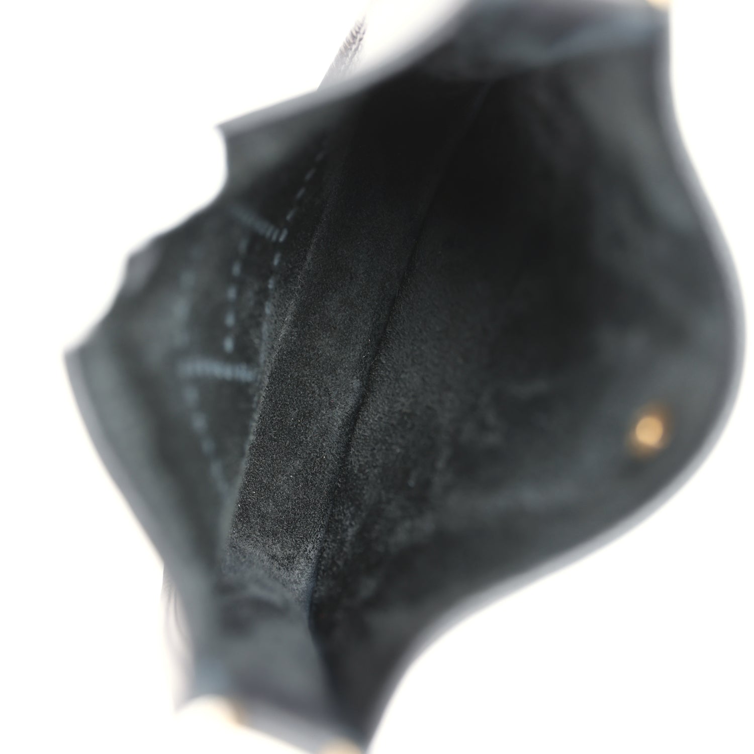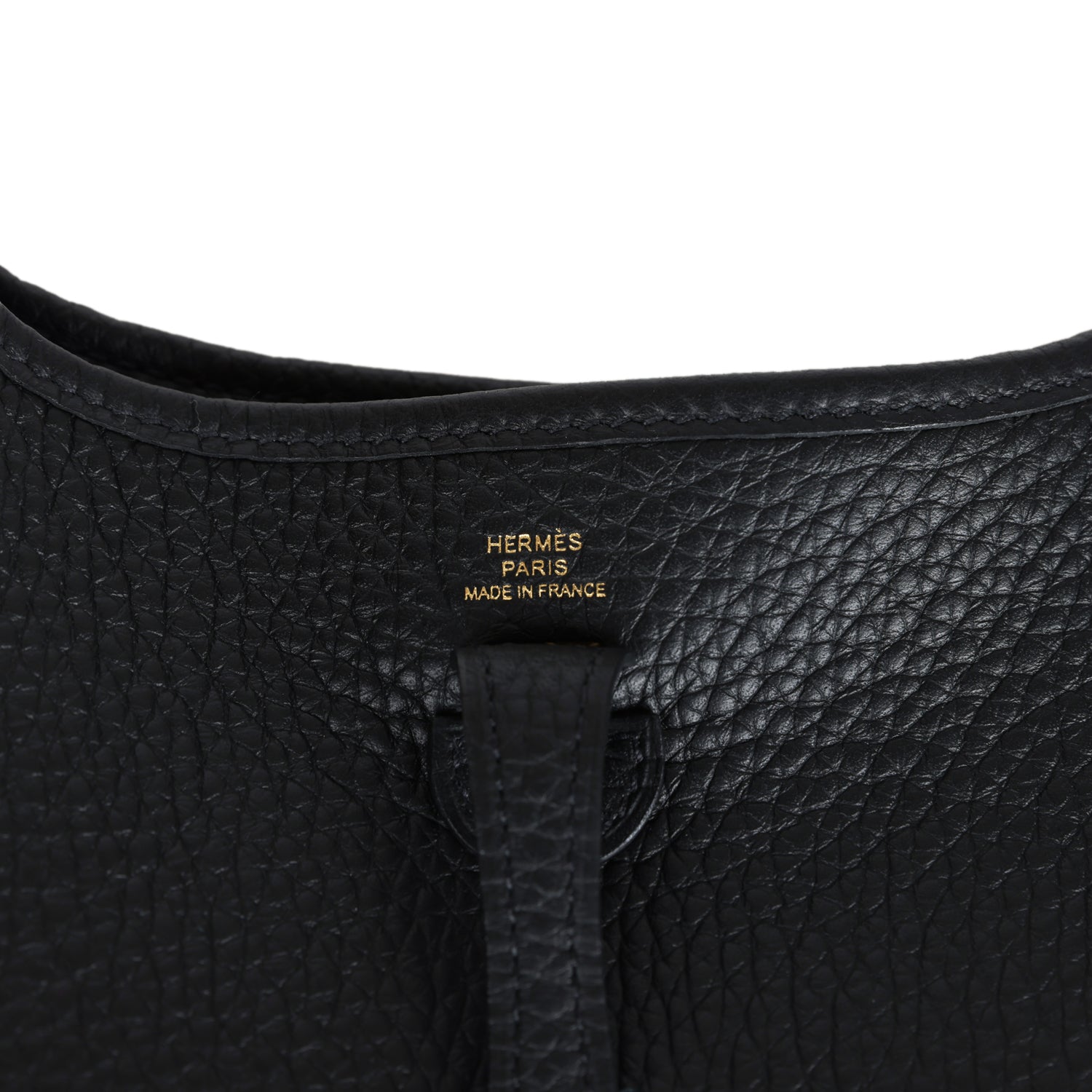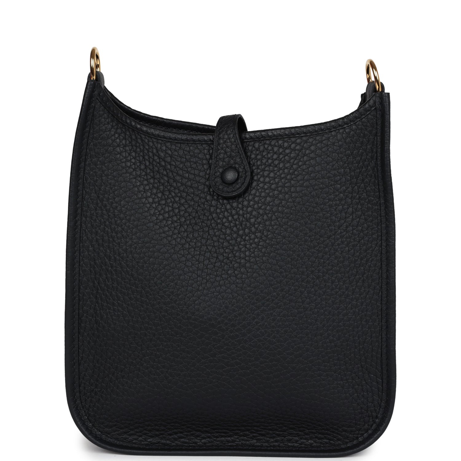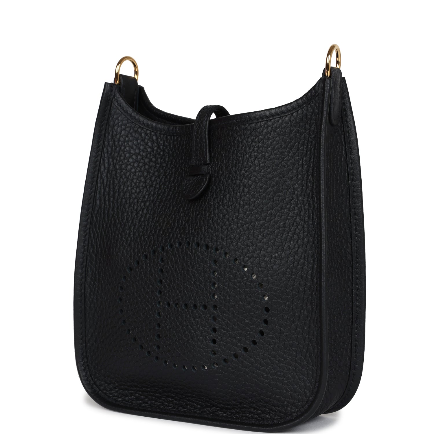 This Evelyne TPM is in Black clemence leather with gold hardware and features tonal stitching stitching, pull tab top closure and a removable Black and Ebene canvas and leather shoulder/crossbody strap.