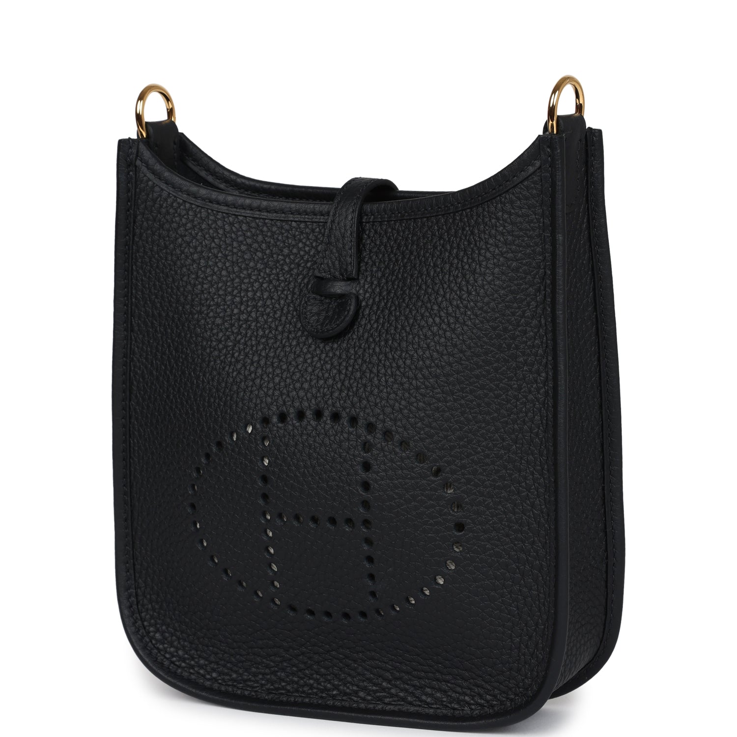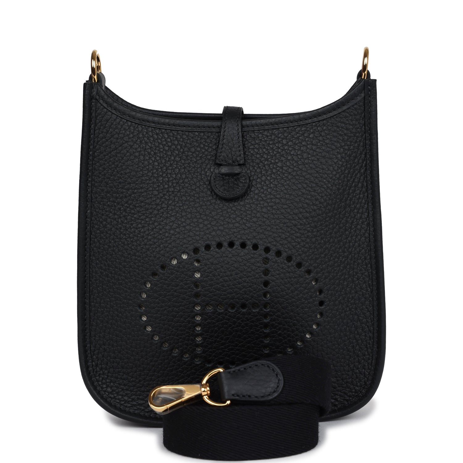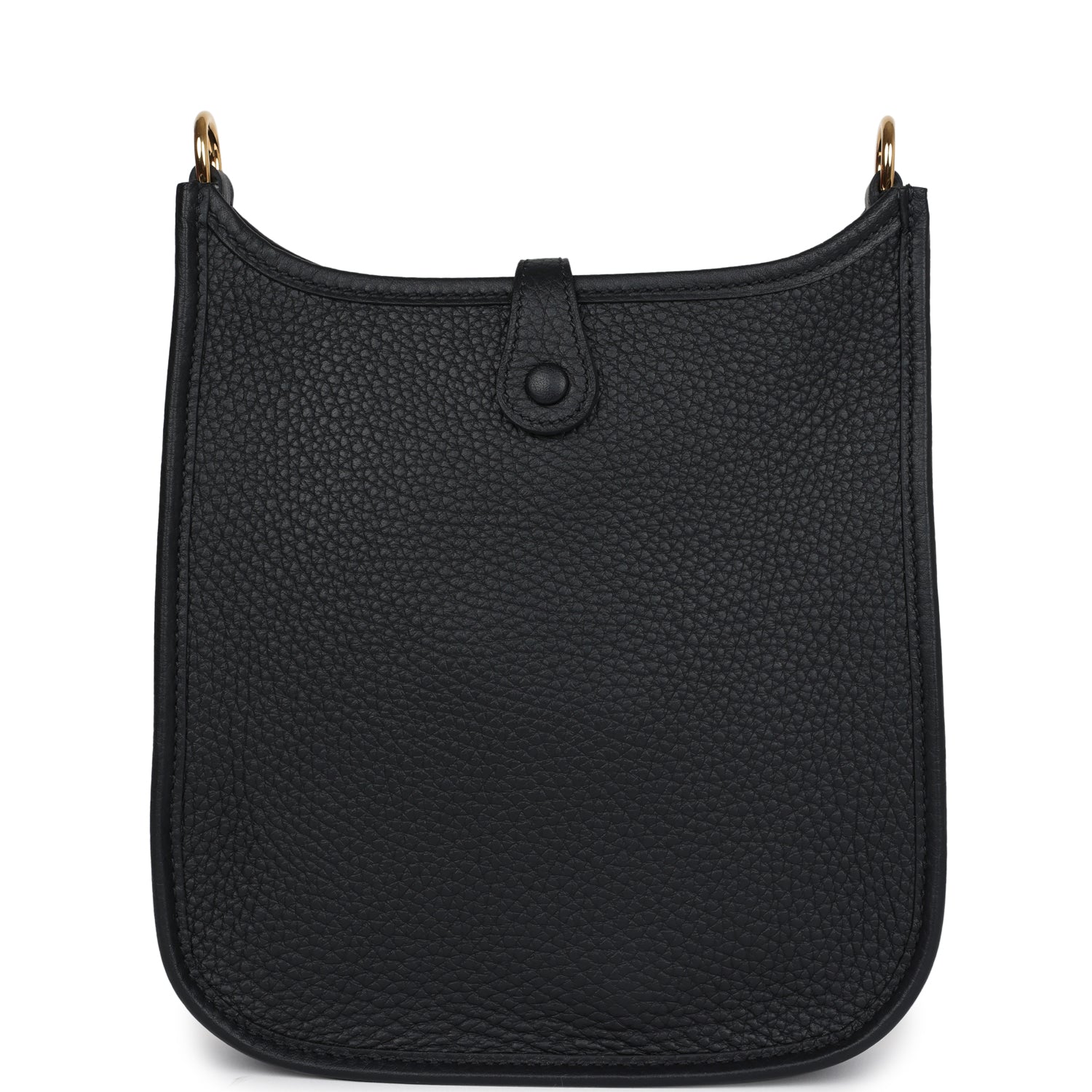 This Evelyne TPM is in Black clemence leather with gold hardware and features tonal stitching stitching, pull tab top closure and a removable Black canvas and leather shoulder/crossbody strap.