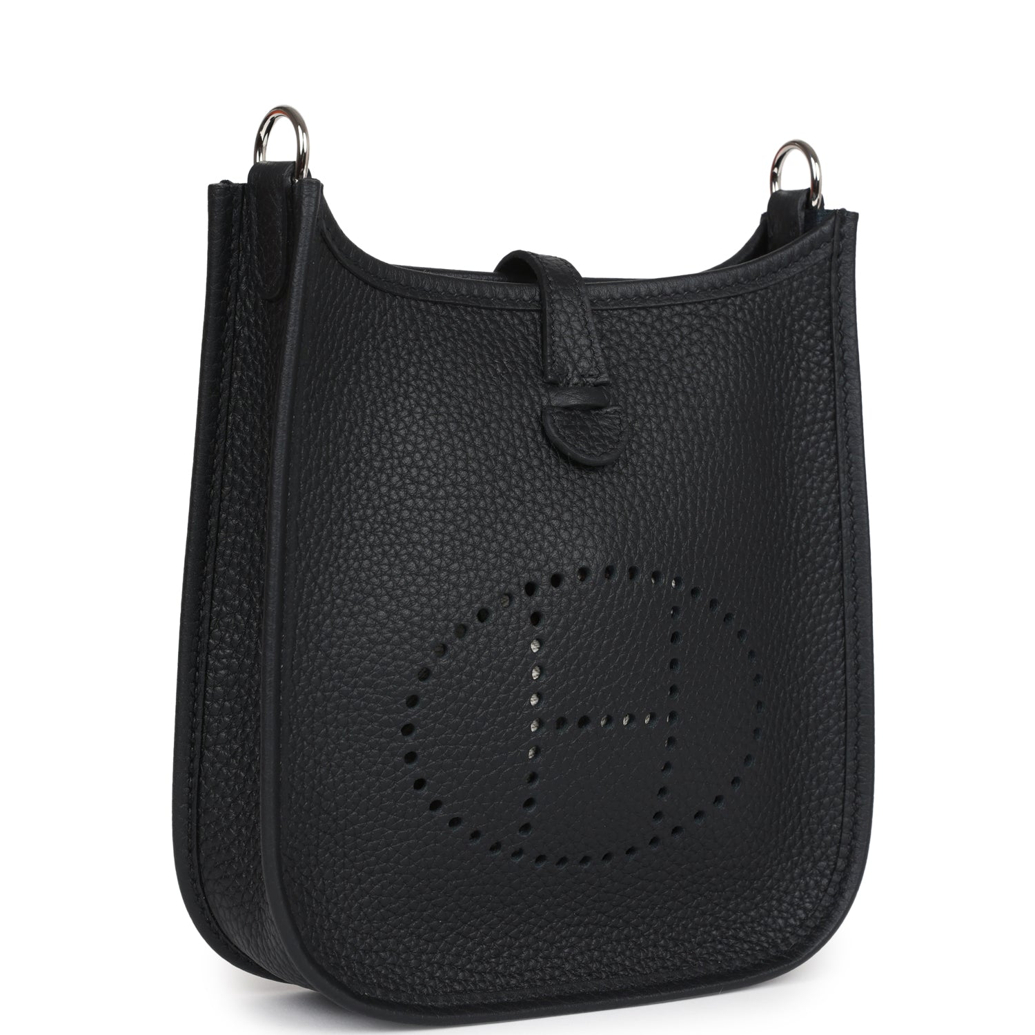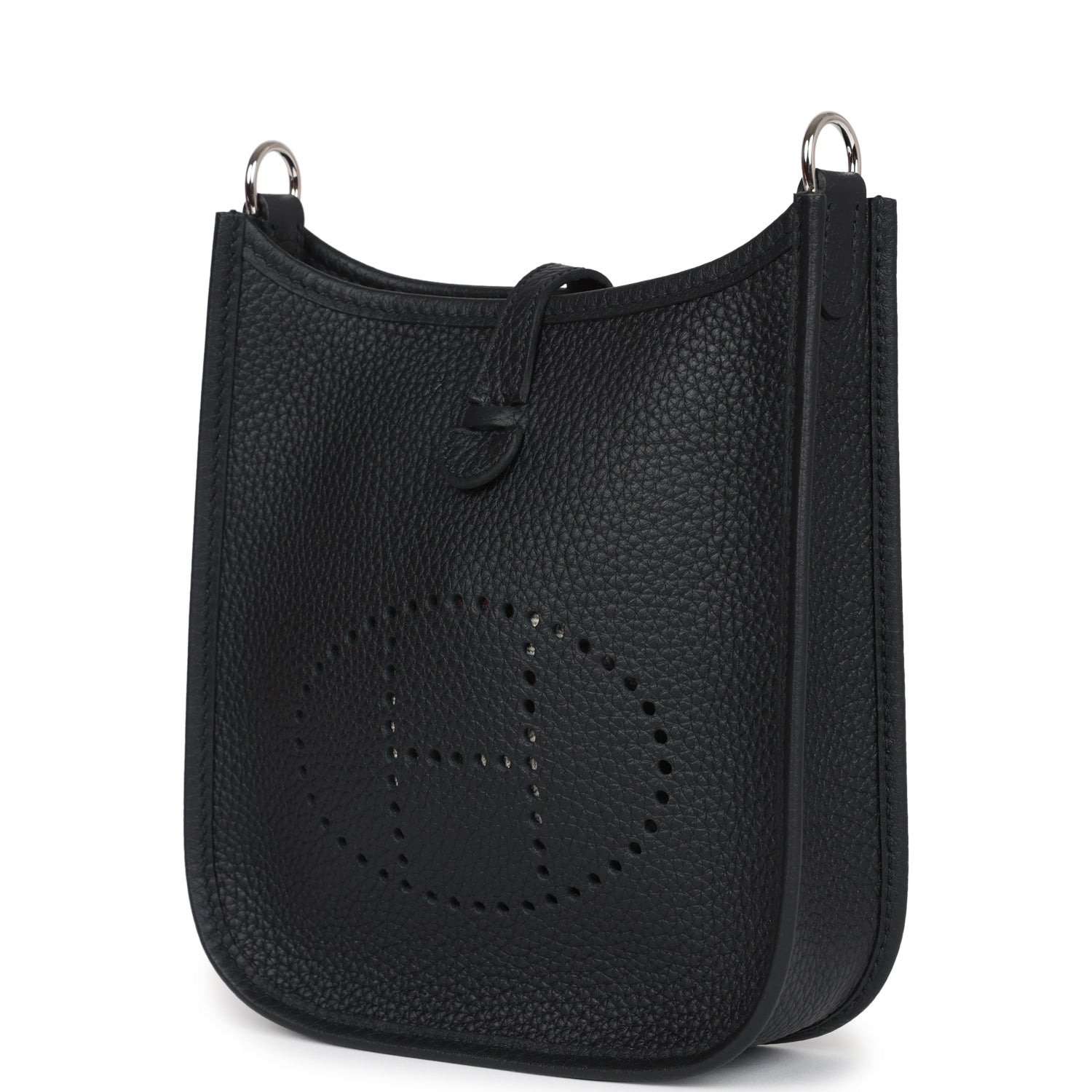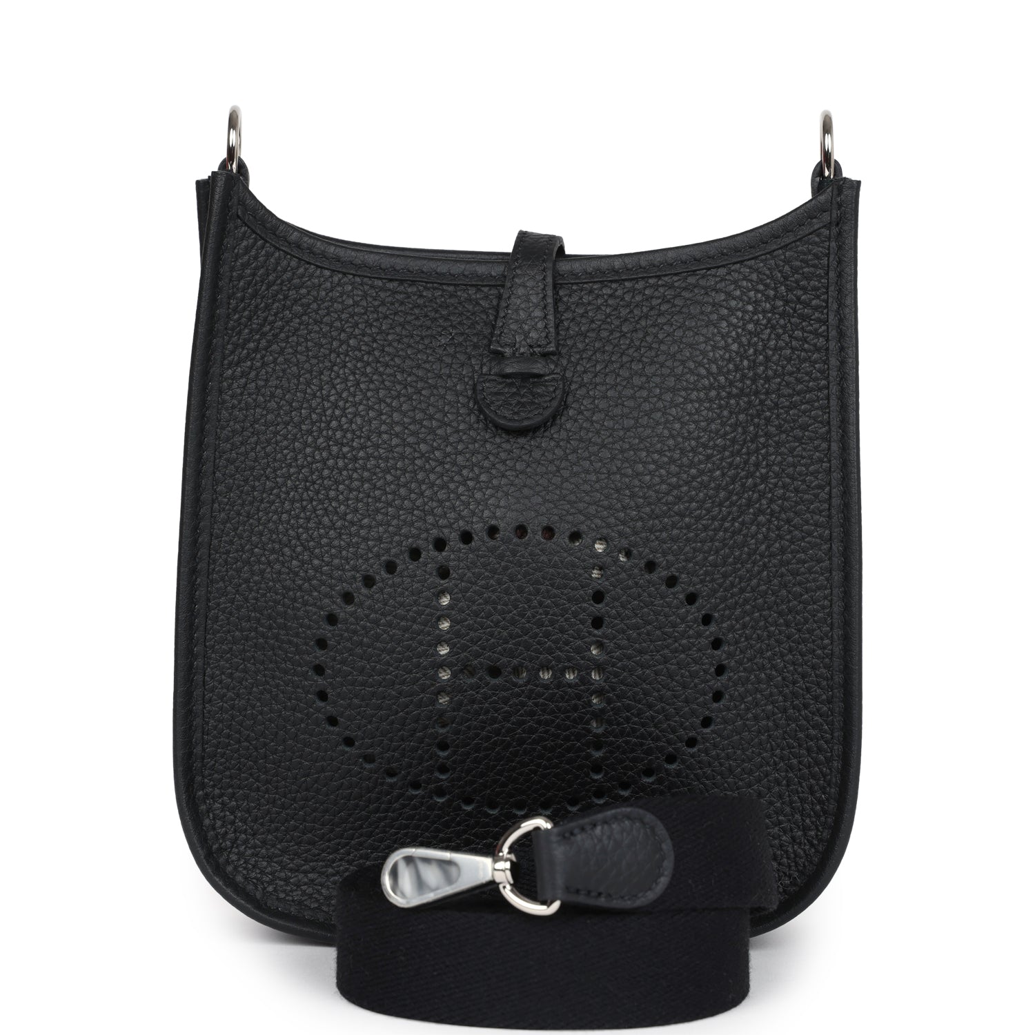 This Evelyne TPM is in Black clemence leather with palladium hardware and features tonal stitching stitching, pull tab top closure and a removable Black canvas and leather shoulder/crossbody strap.