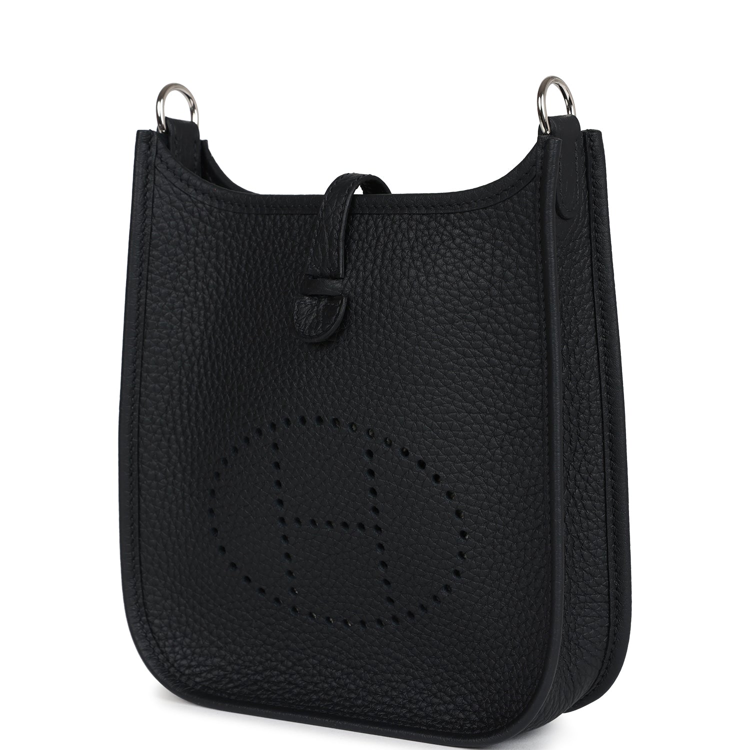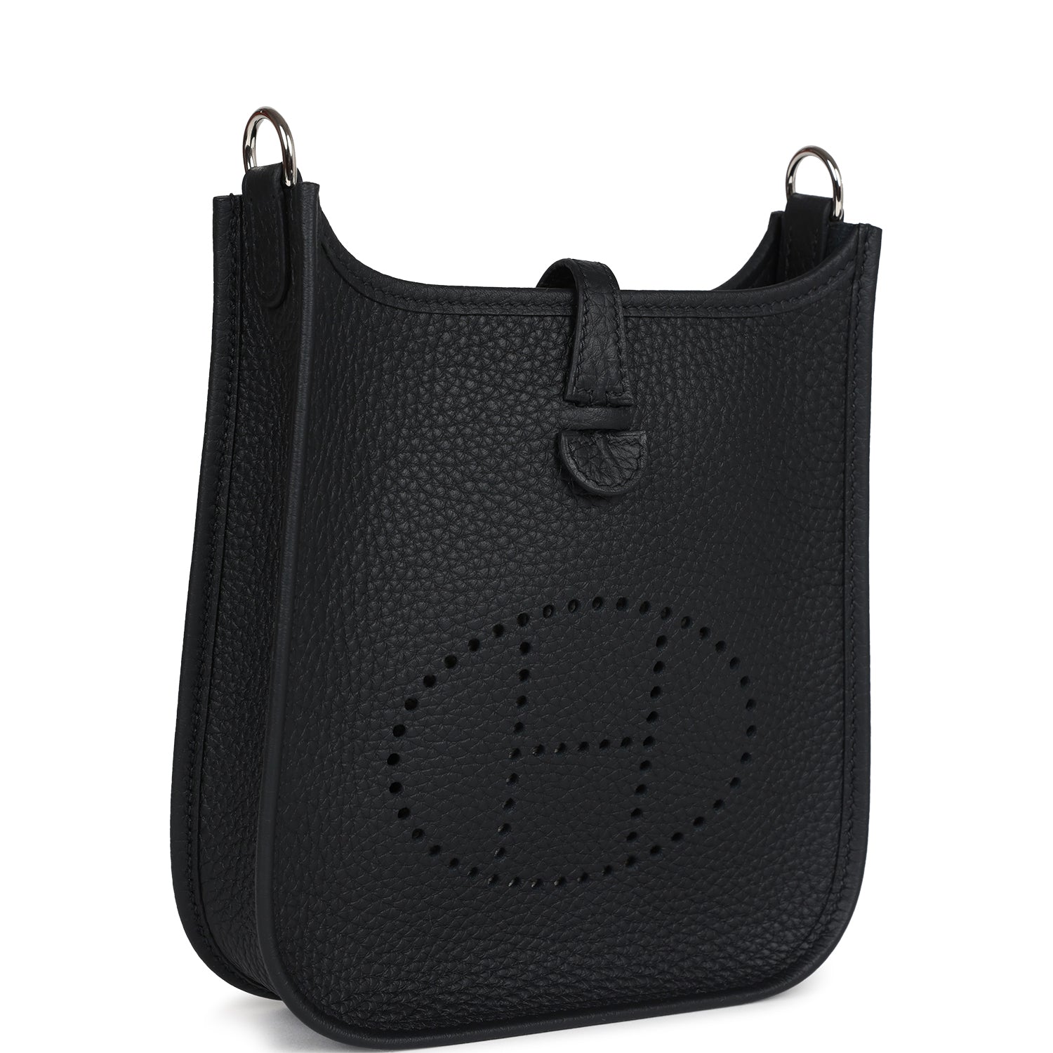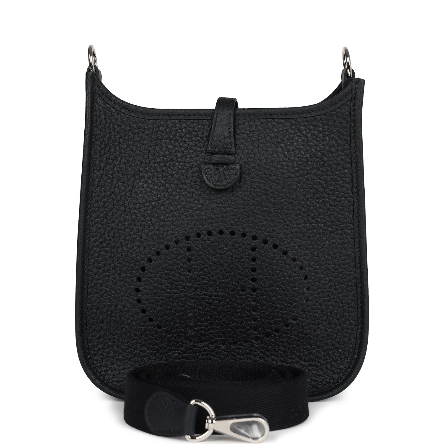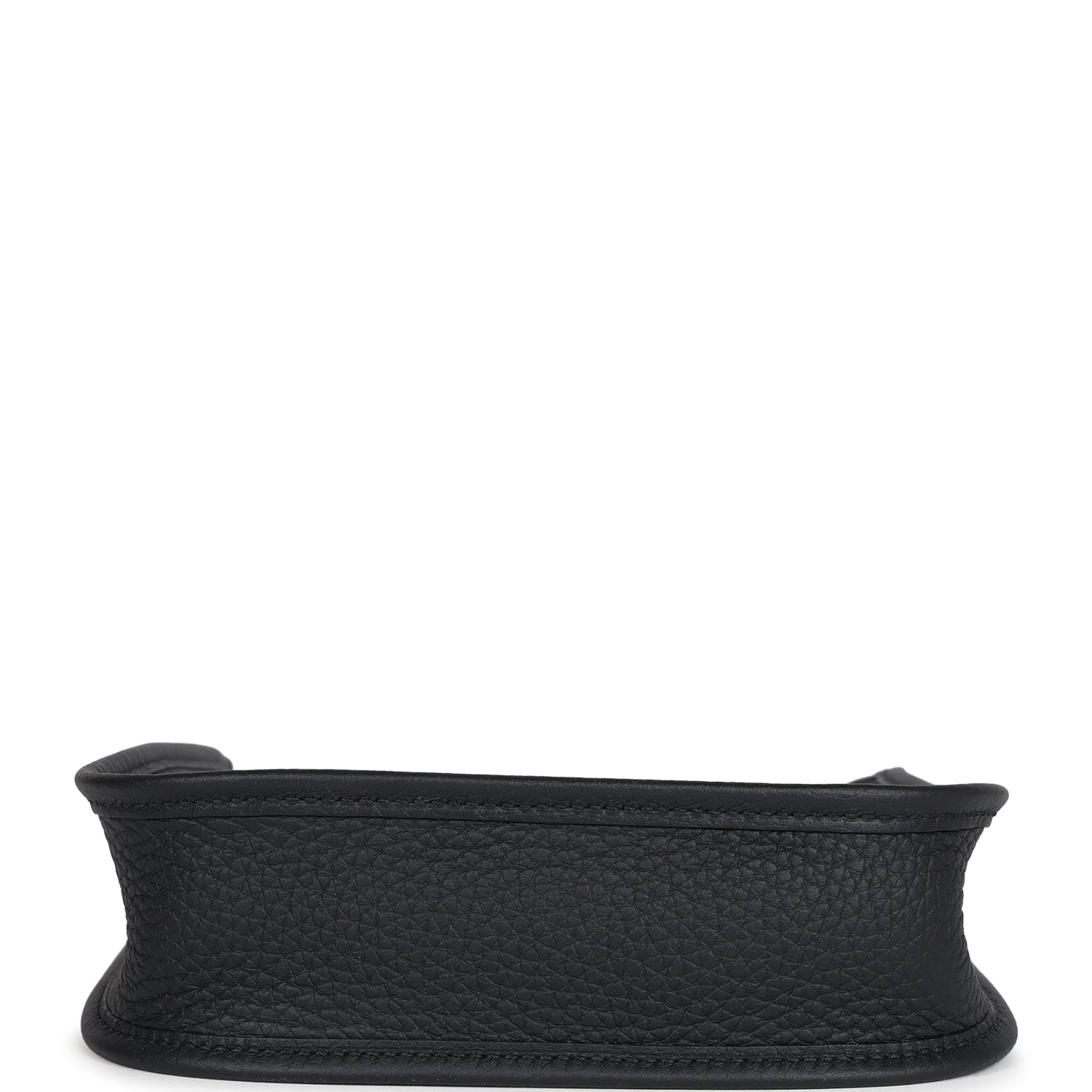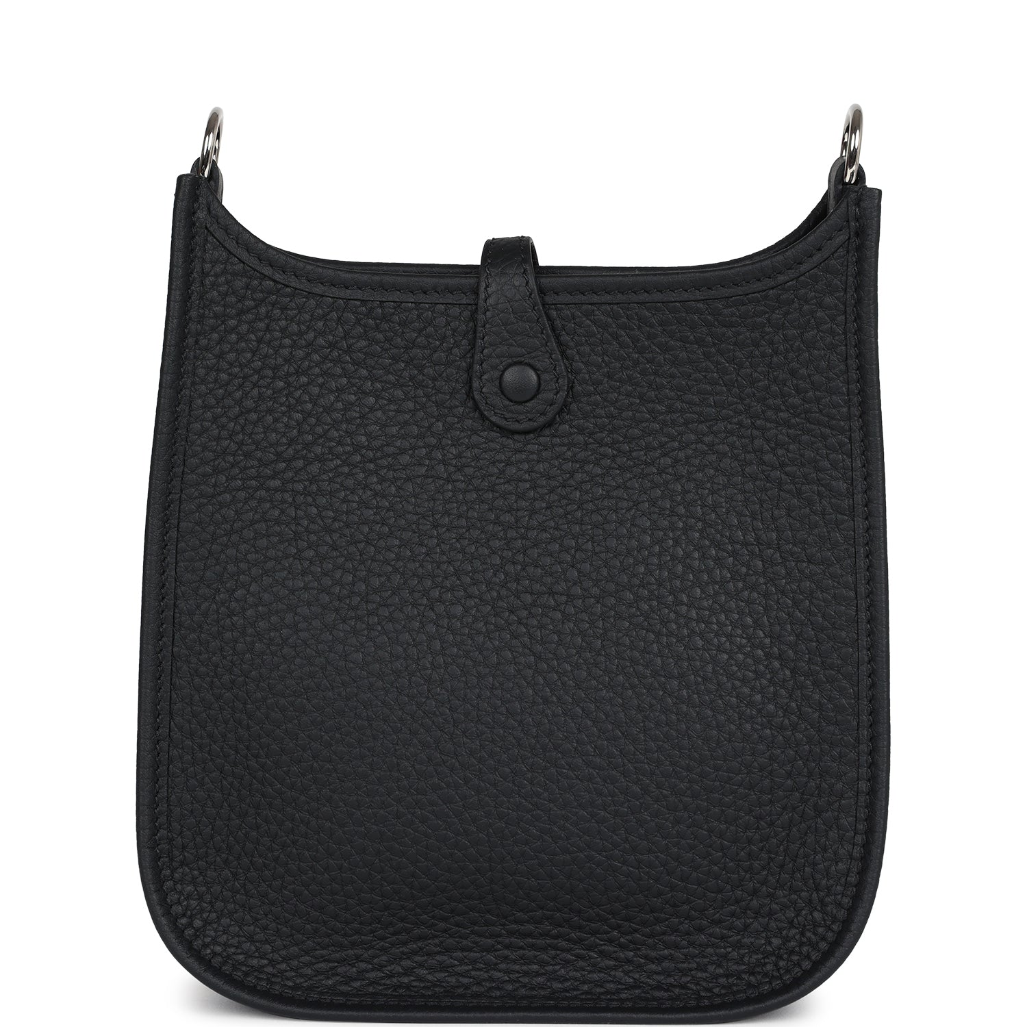 This Evelyne TPM is in Black clemence leather with palladium hardware and features tonal stitching stitching, pull tab top closure and a removable Black canvas and leather shoulder/crossbody strap.