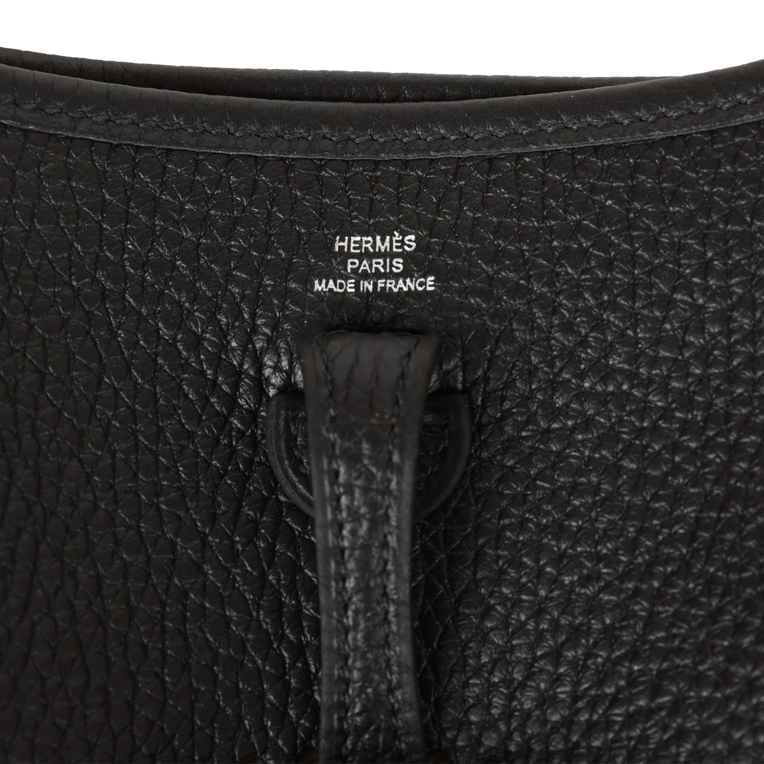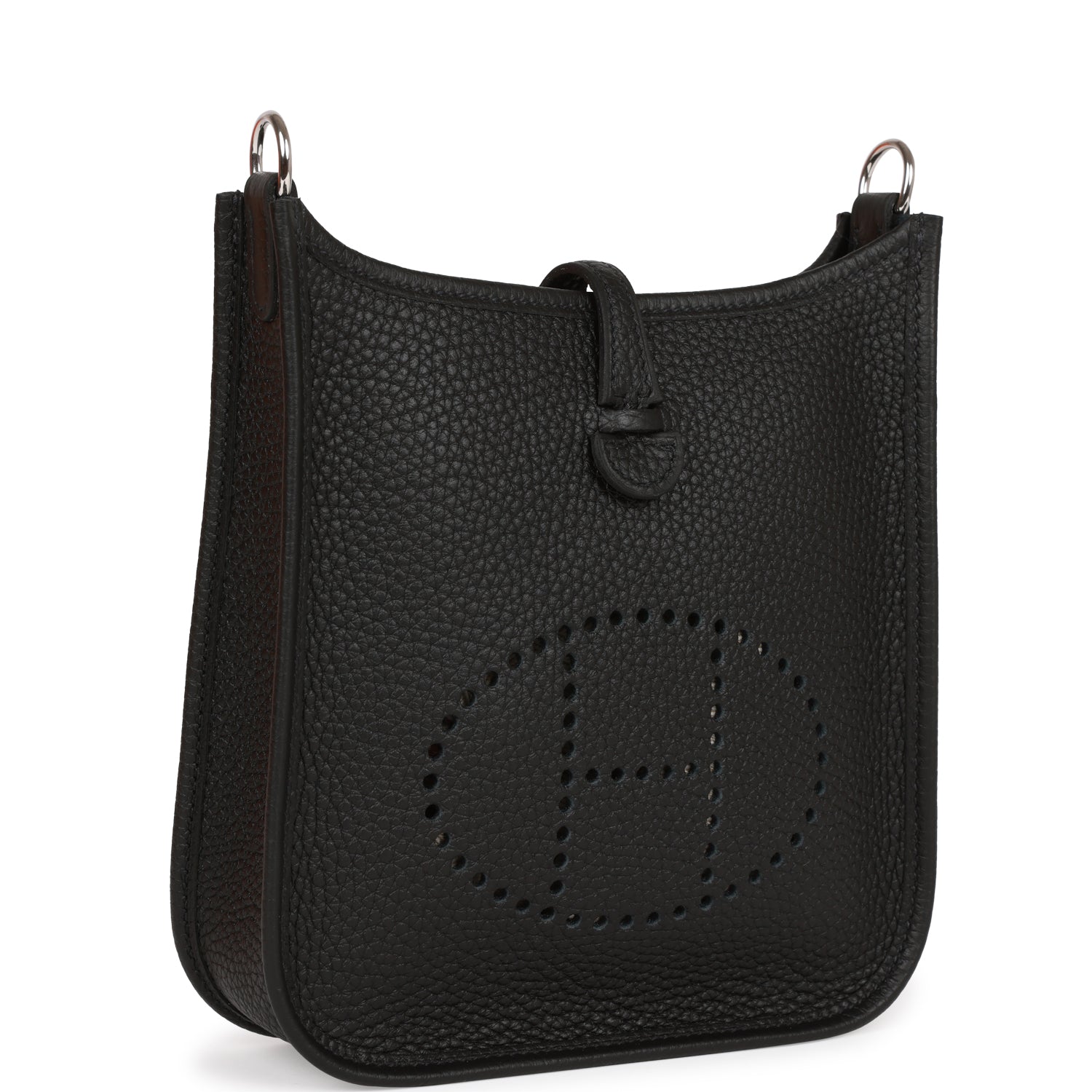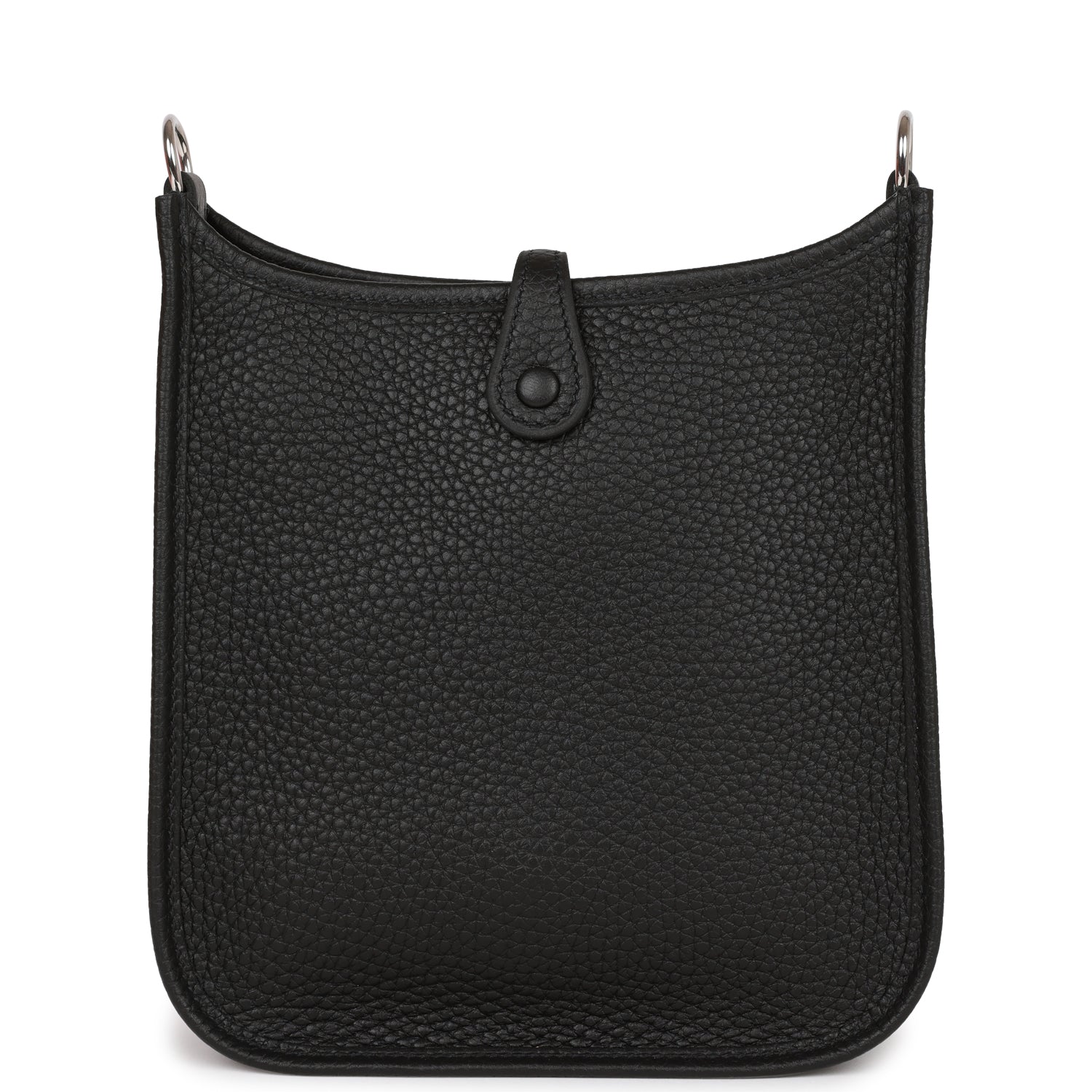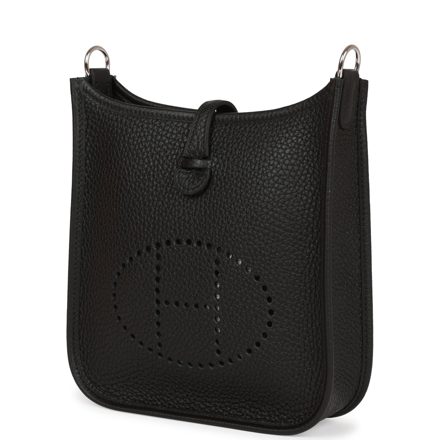 This Evelyne TPM is in Black clemence leather with palladium hardware and features tonal stitching stitching, pull tab top closure and a black removable canvas and leather shoulder/crossbody strap.