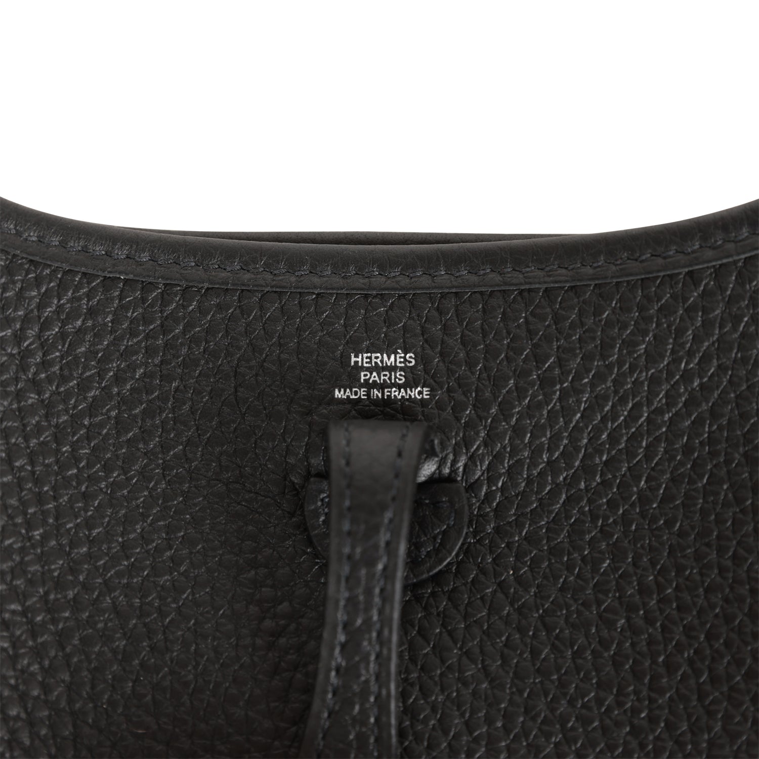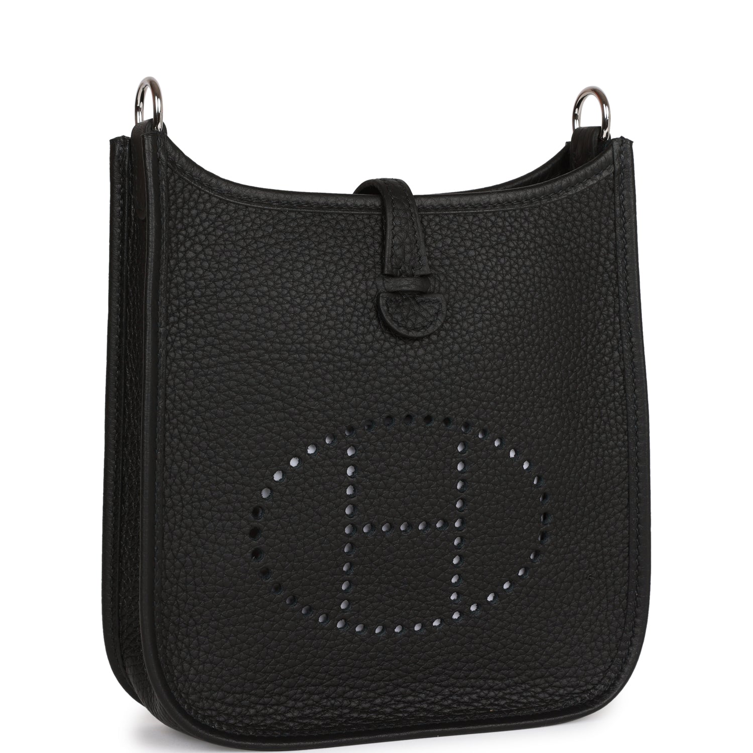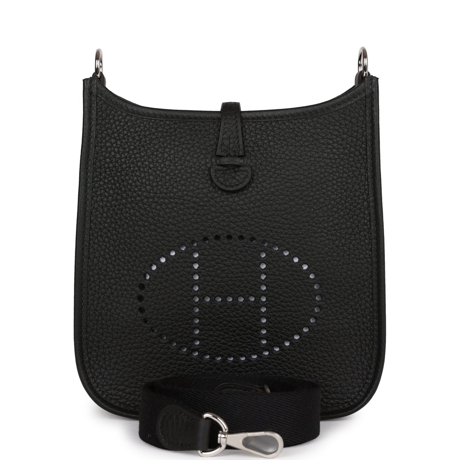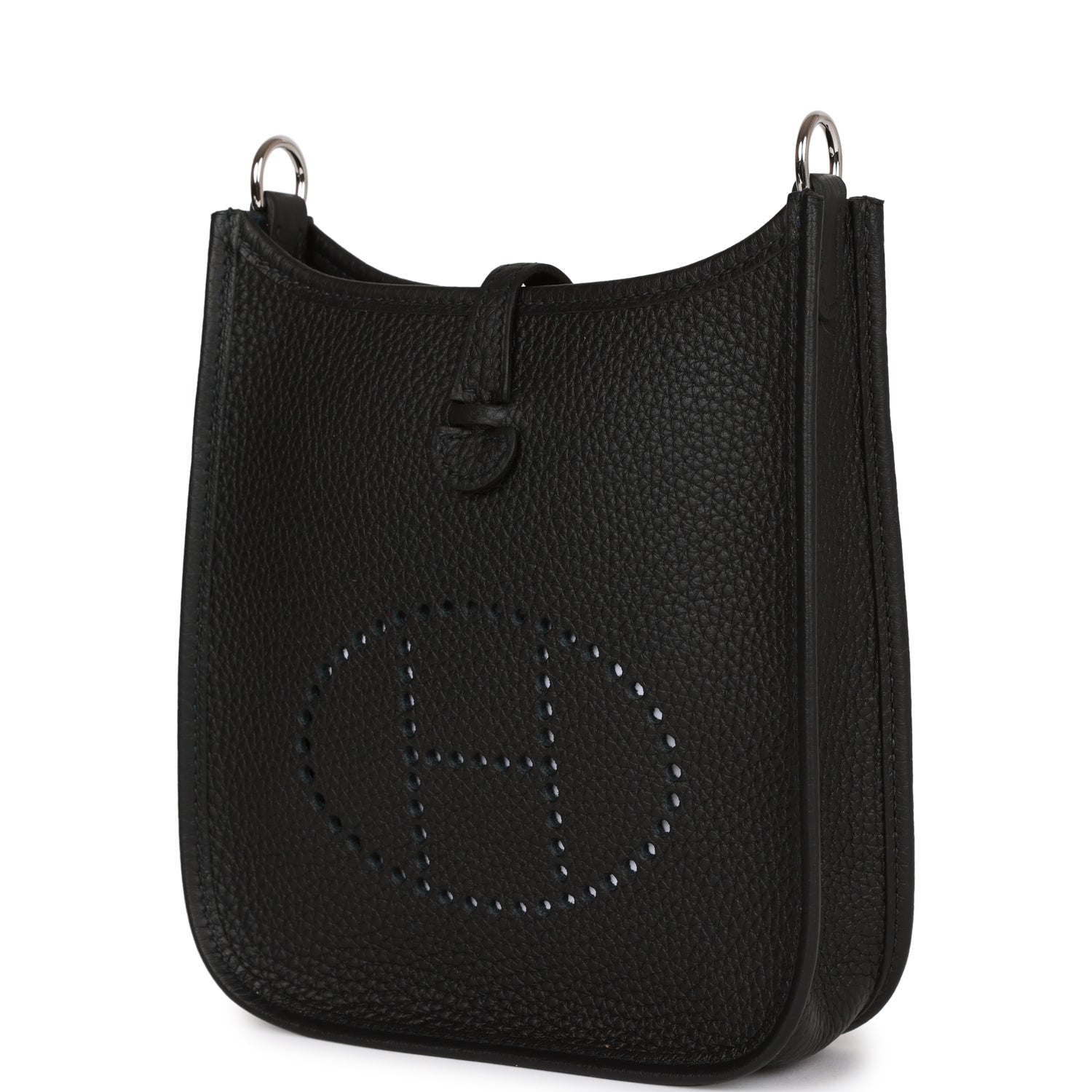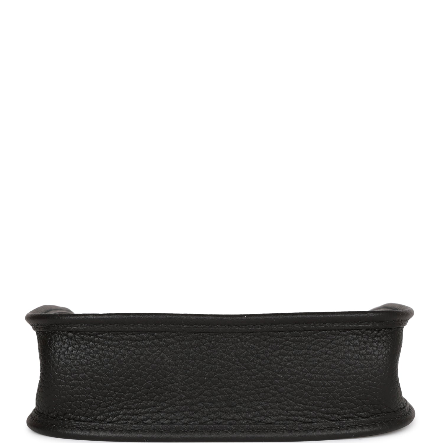 This Evelyne TPM is in Black clemence leather with palladium hardware and features tonal stitching stitching, pull tab top closure and a black removable canvas and leather shoulder/crossbody strap.
