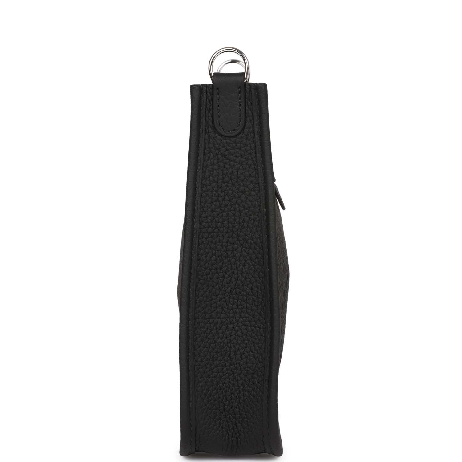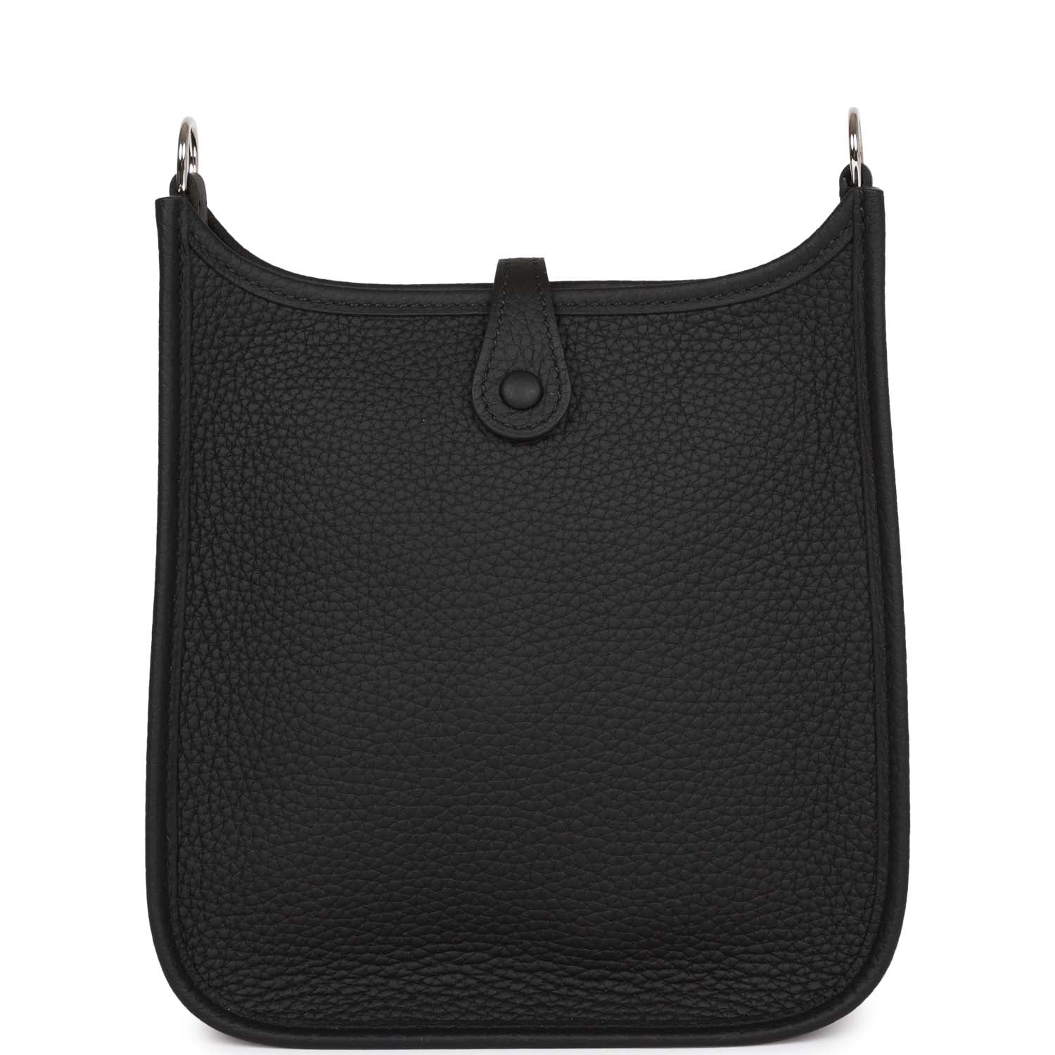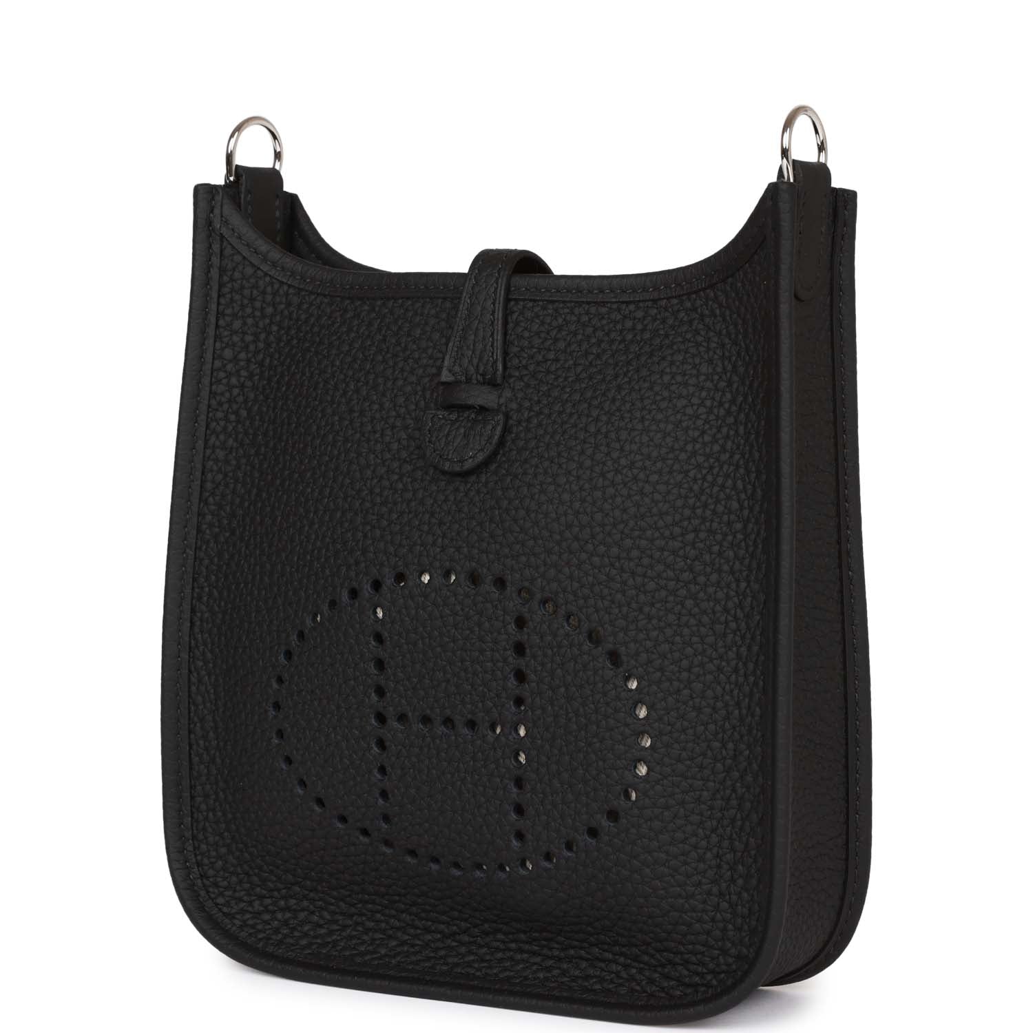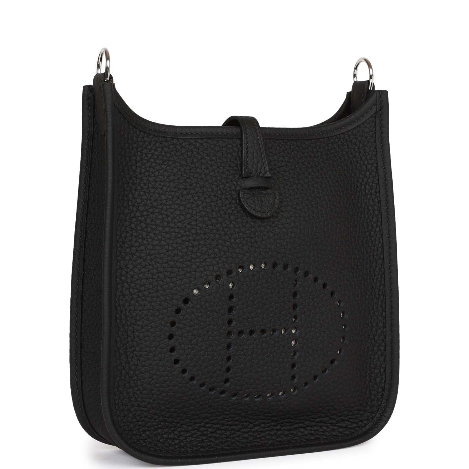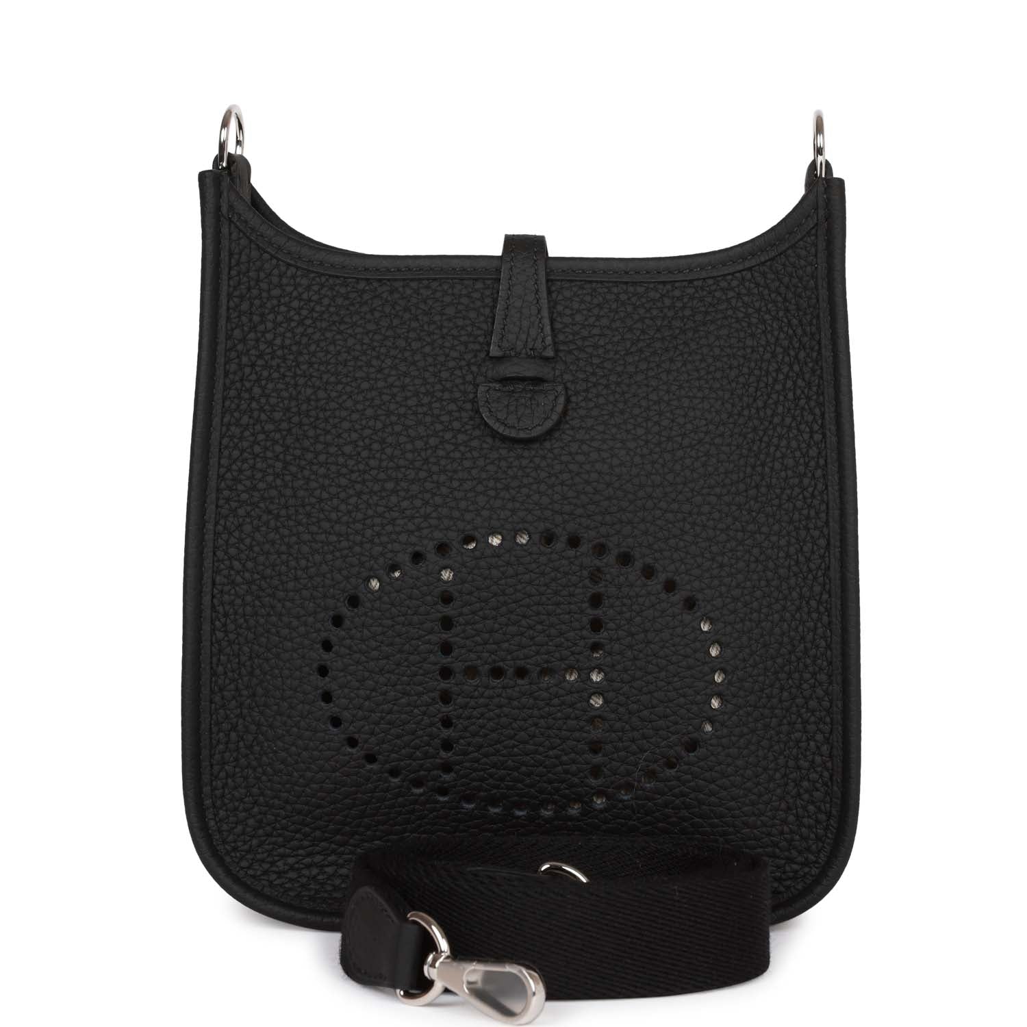 This Evelyne TPM is in Black clemence leather with palladium hardware and features tonal stitching stitching, pull tab top closure and a black removable canvas and leather shoulder/crossbody strap.