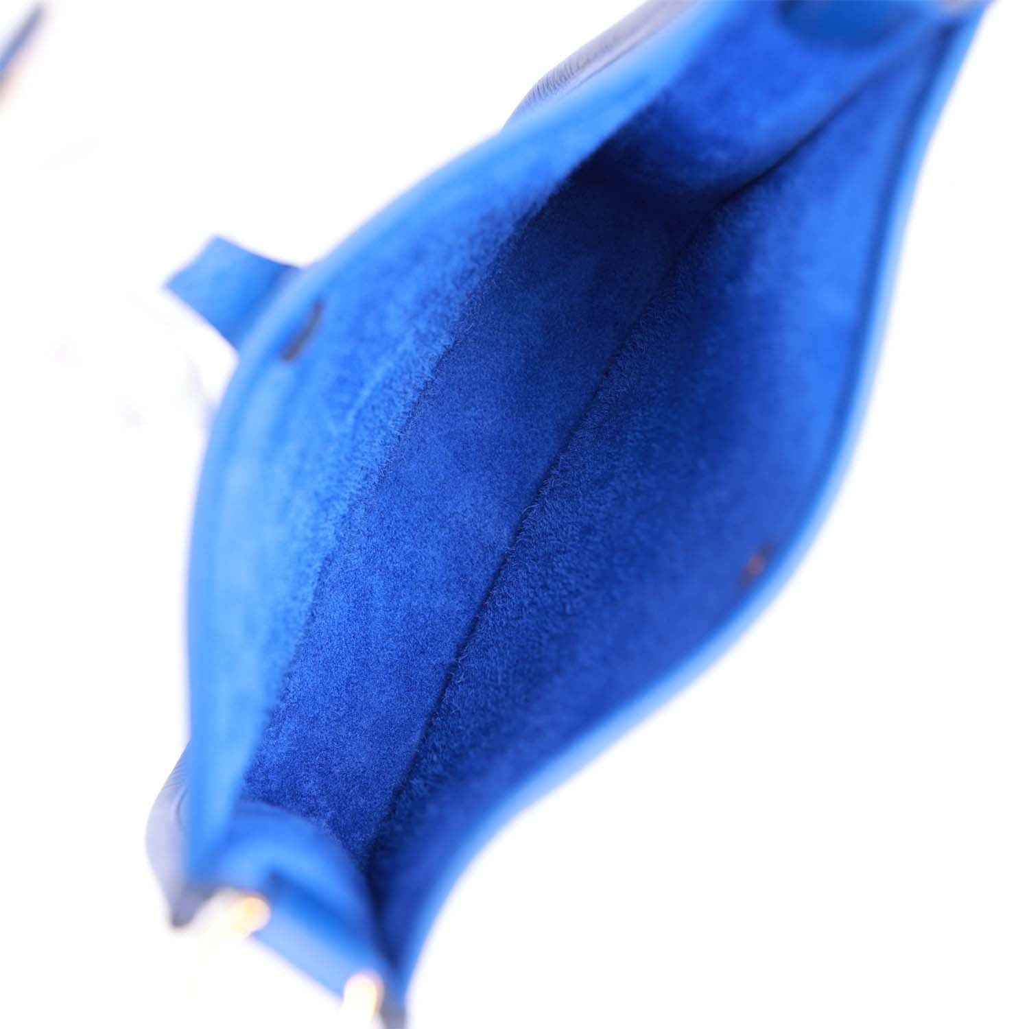 This Evelyne is in Bleu Electrique clemence leather with gold hardware and has tonal stitching, pull tab top closure and a bleu electrique removable canvas and leather shoulder/crossbody strap.