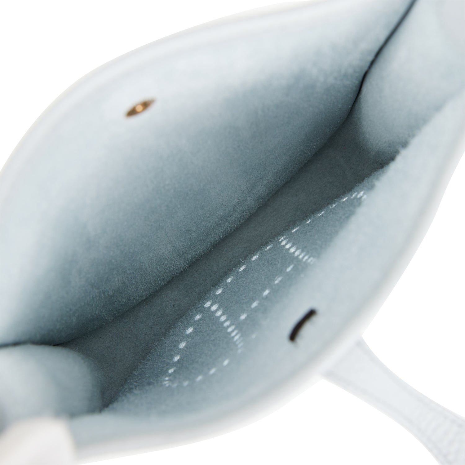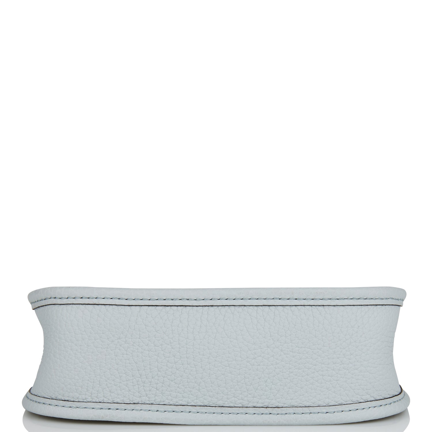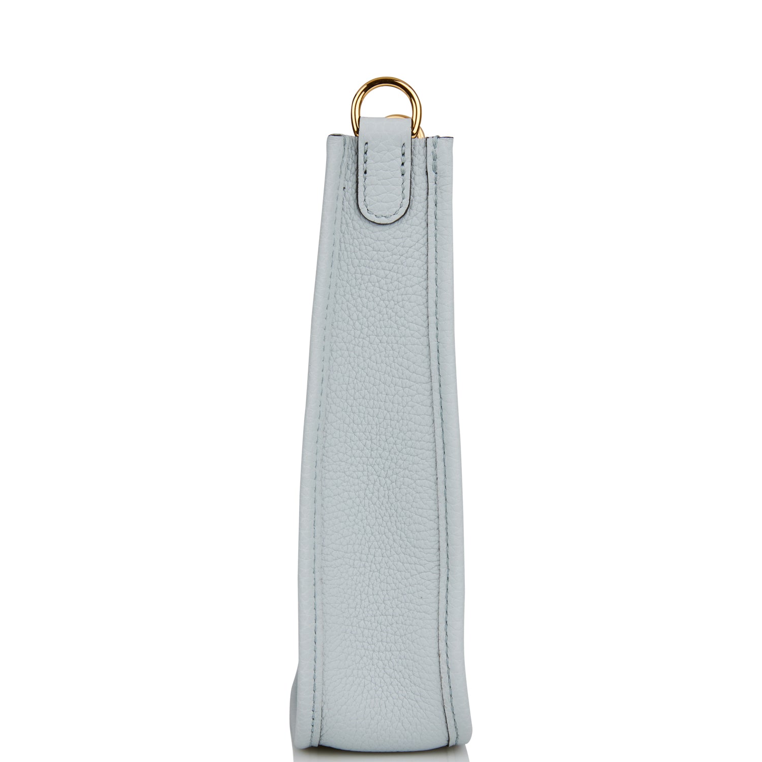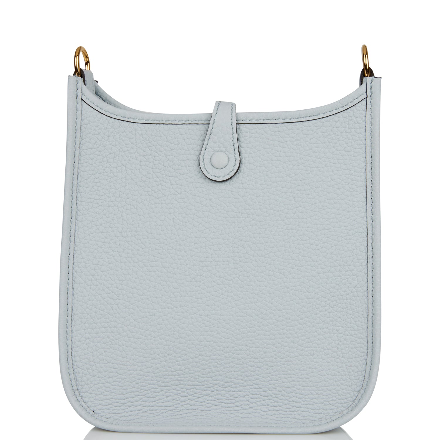 This Evelyne is in Bleu Pale clemence leather with gold hardware and has tonal stitching, pull tab top closure and a Bleu Navy removable canvas and leather shoulder/crossbody strap.