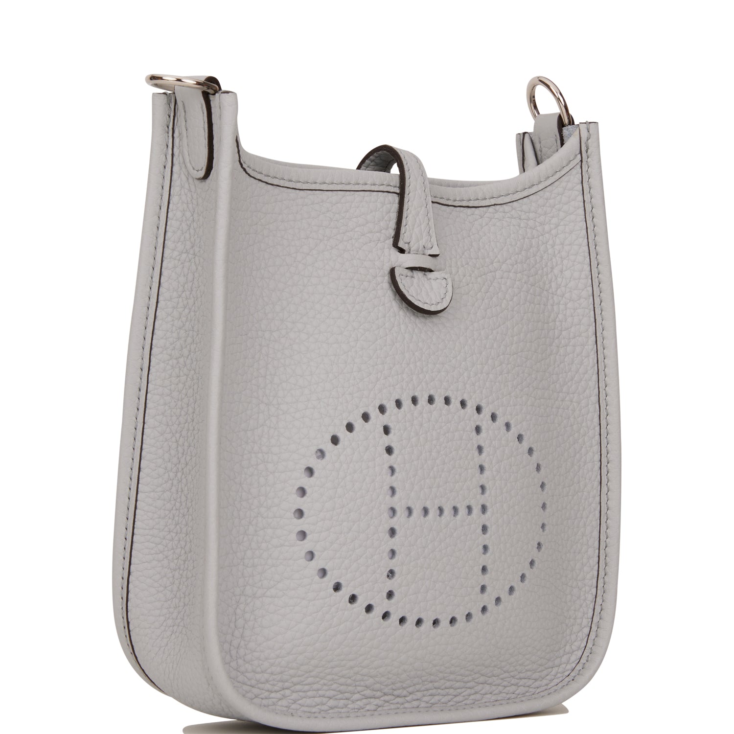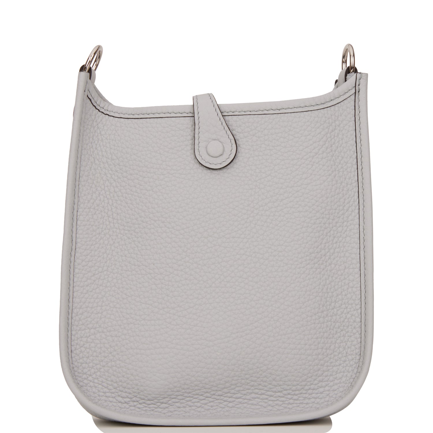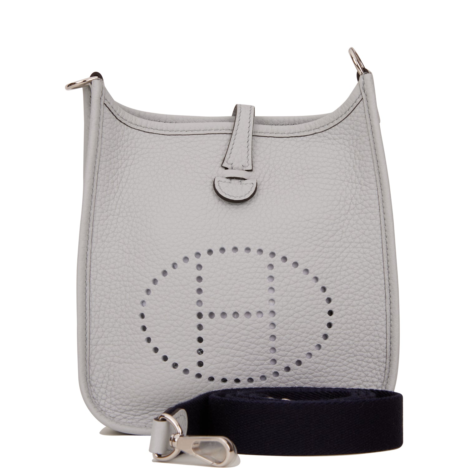 This Evelyne is in Bleu Pale clemence leather with palladium hardware and has tonal stitching, pull tab top closure and a Bleu Navy removable canvas and leather shoulder/crossbody strap.