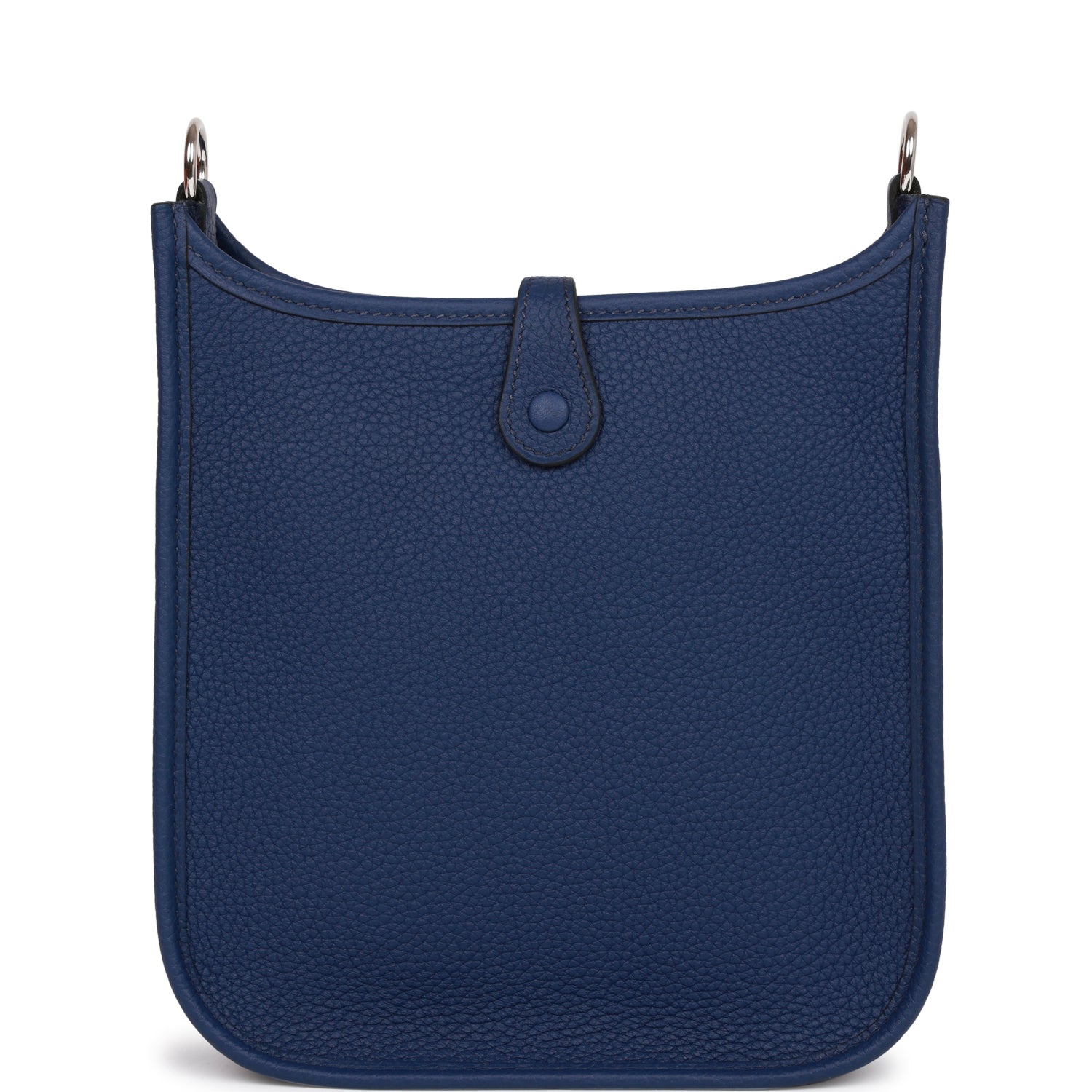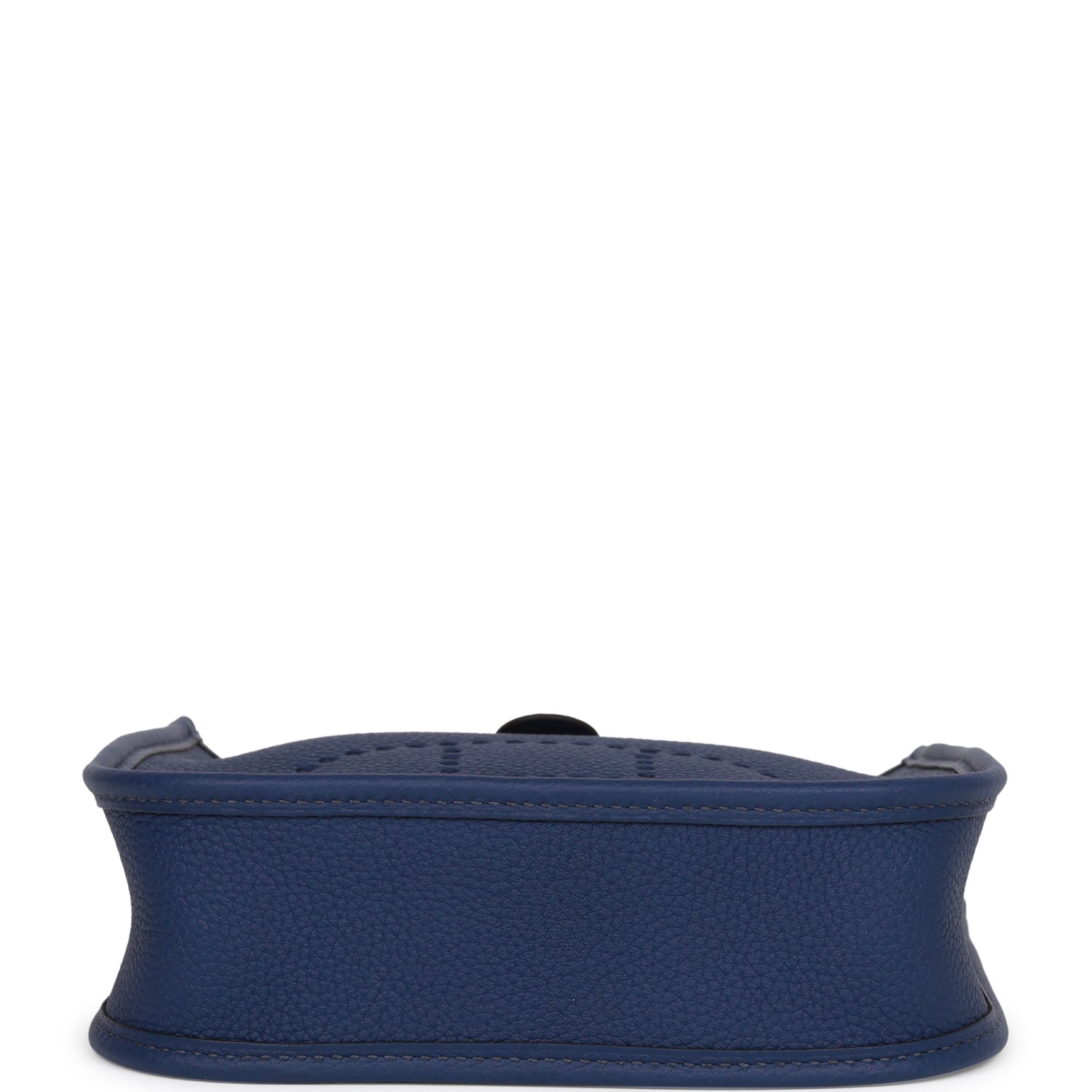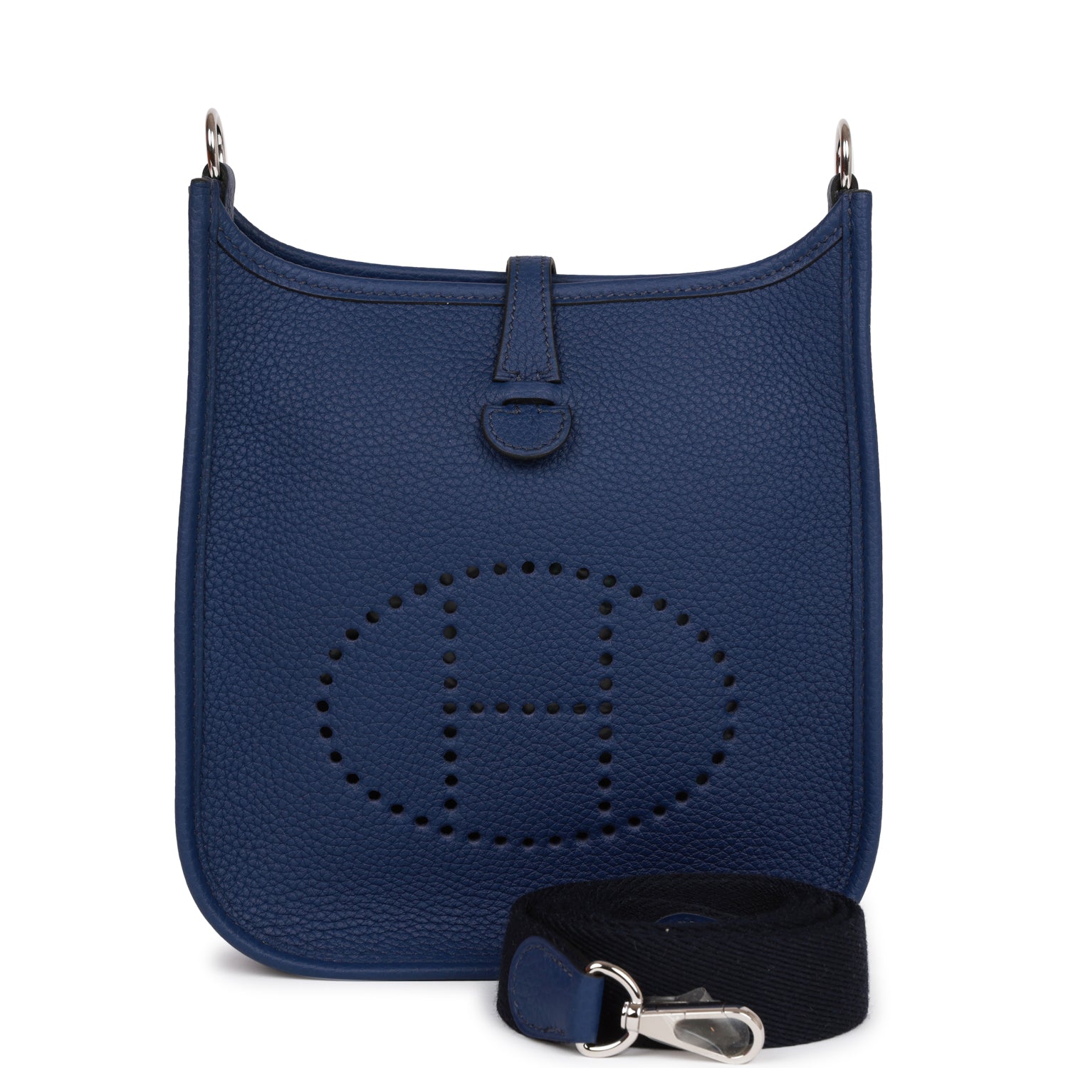 This Evelyne is in Bleu Saphir maurice leather with palladium hardware and has tonal stitching, pull tab top closure and a Bleu Nuit removable canvas and leather shoulder/crossbody strap.